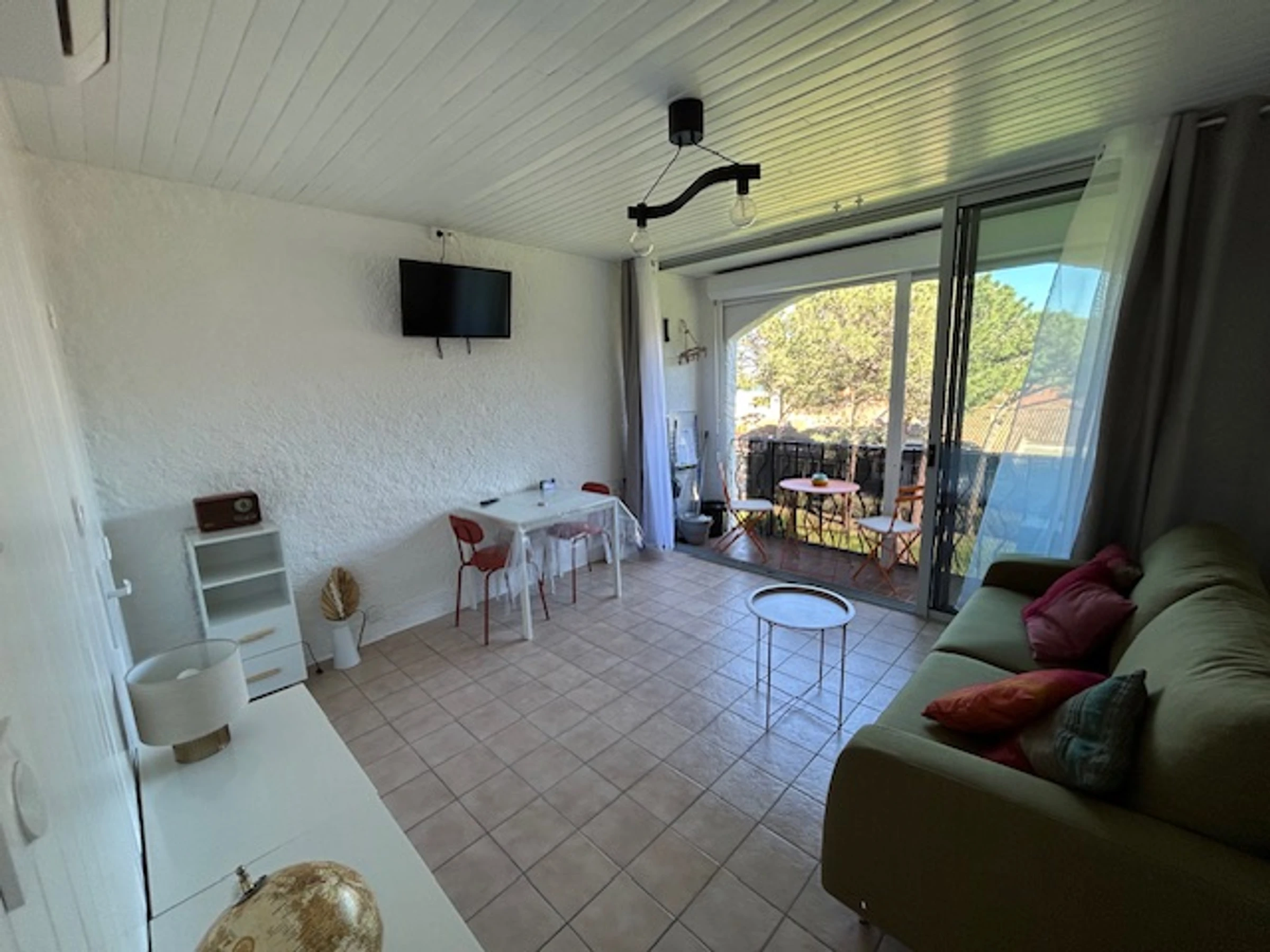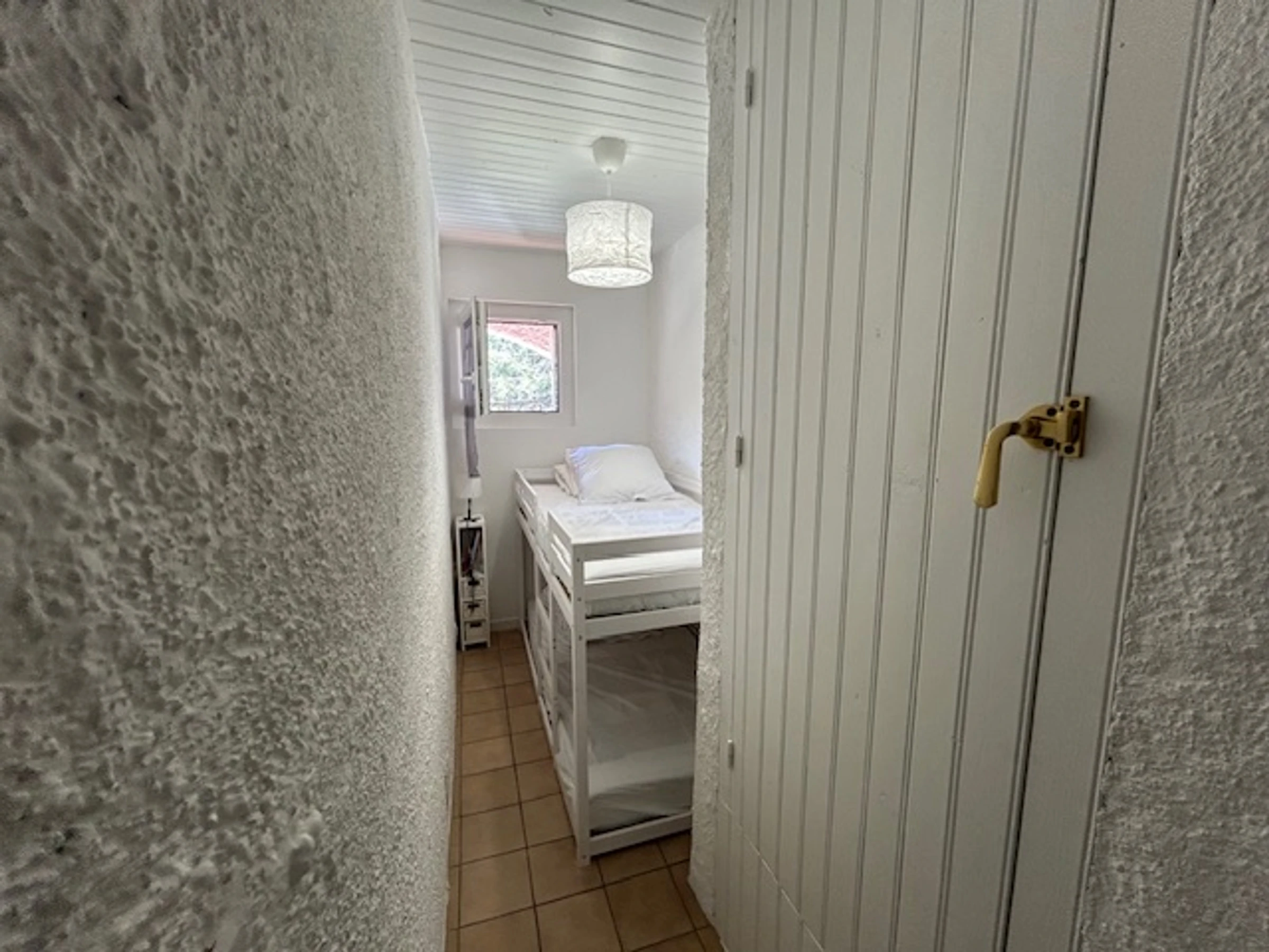 Il peut accueillir 4 personnes : 1 canapé convertible 2 places dans le séjour et 2 lits 1 place superposés dans la cabine.