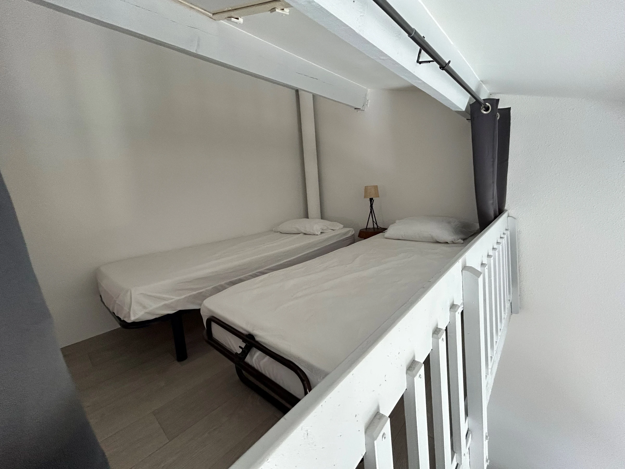 Elle peut accueillir 4 personnes avec 2 lits 1 place sur la mezzanine et 1 lit 2 place dans la chambre.