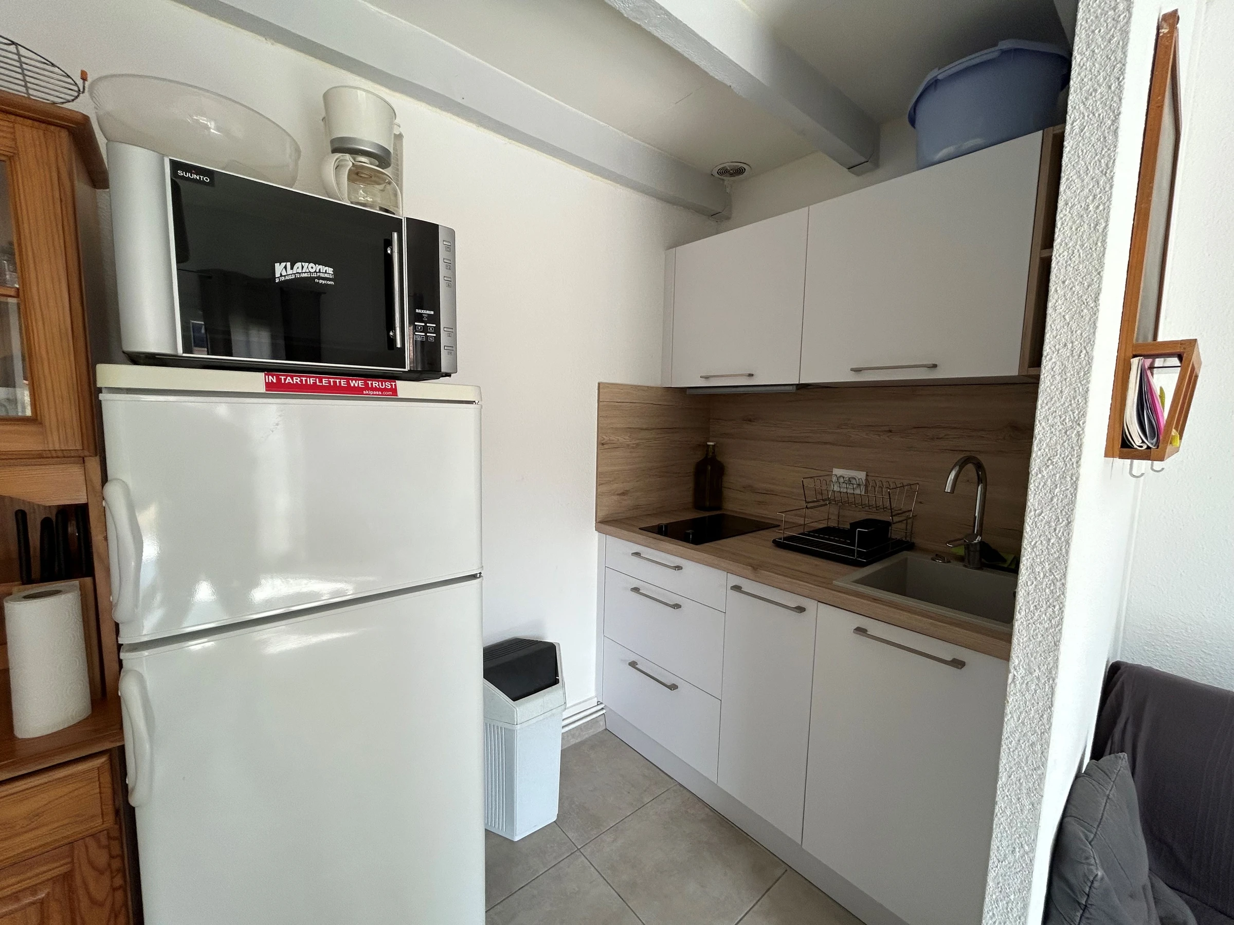 Le logement est équipée d'un réfrigérateur/congélateur, d'un combi four/micro-ondes, d'une plaque de cuisson 2 feux et d'une télévision.