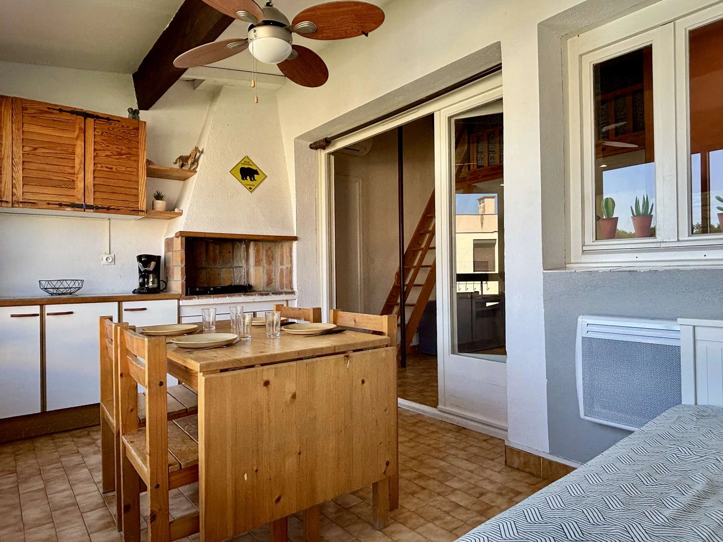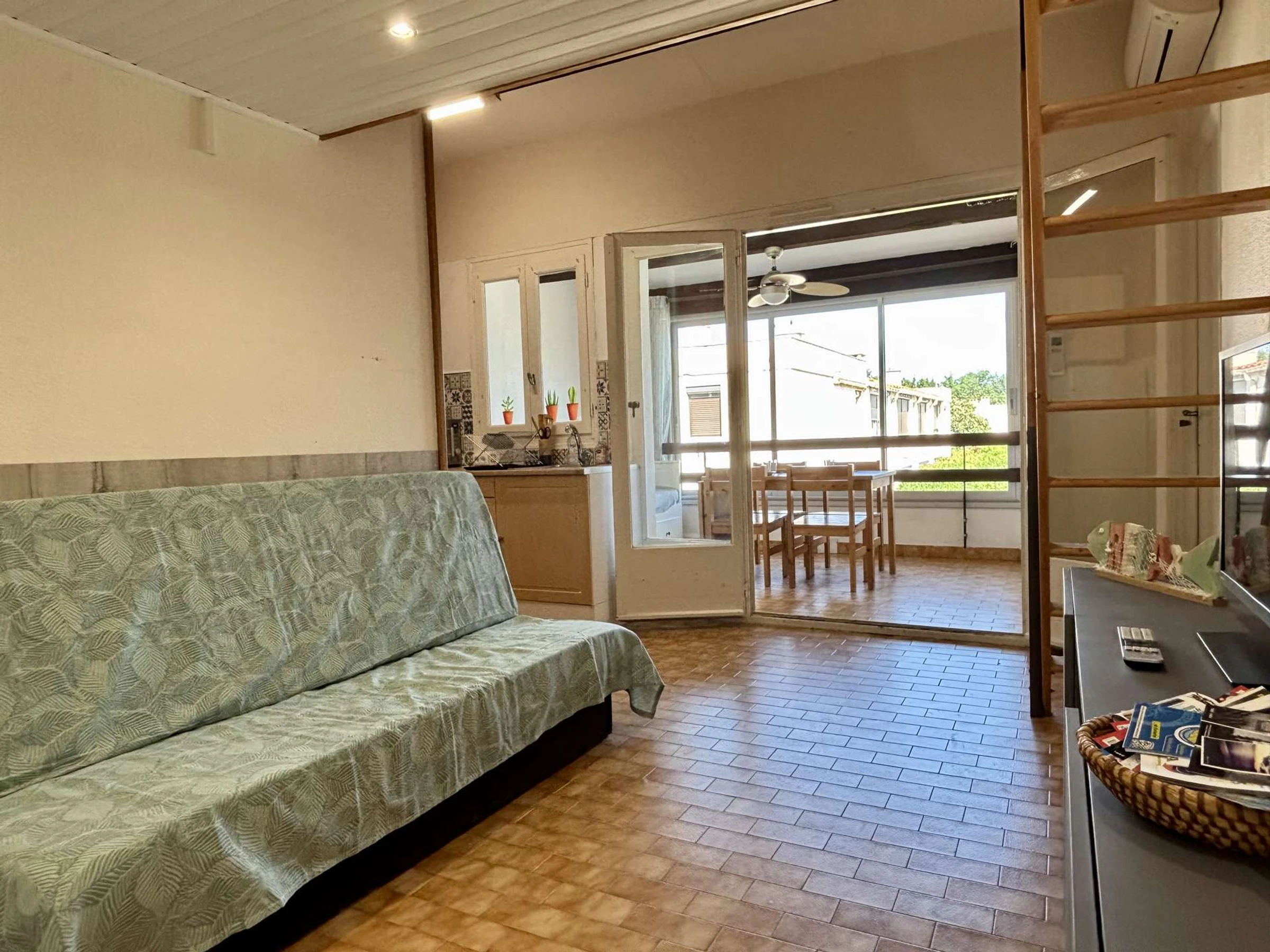 Cet appartement de vacances en famille, au 1er étage comprend un séjour avec 1 convertible 2 places, une loggia, une chambre avec un canapé clic-clac, un coin cuisine, une salle d'eau et des wc indépendants.