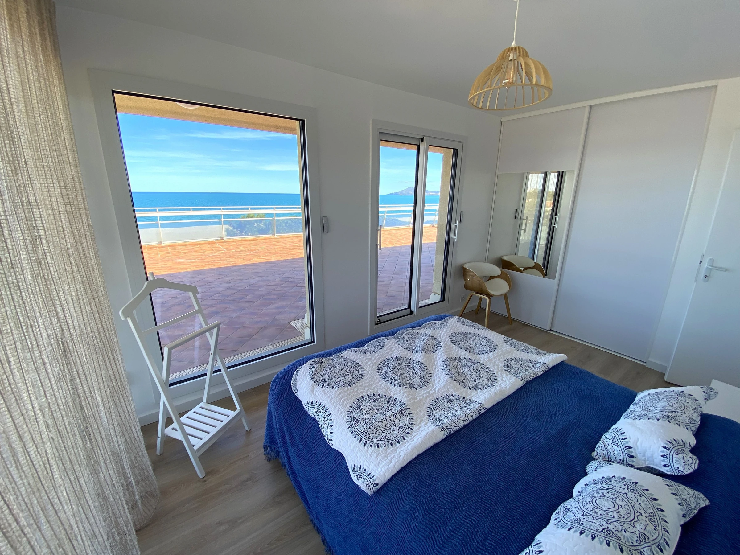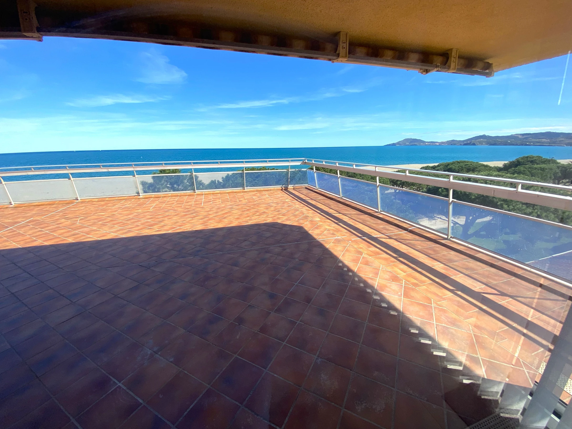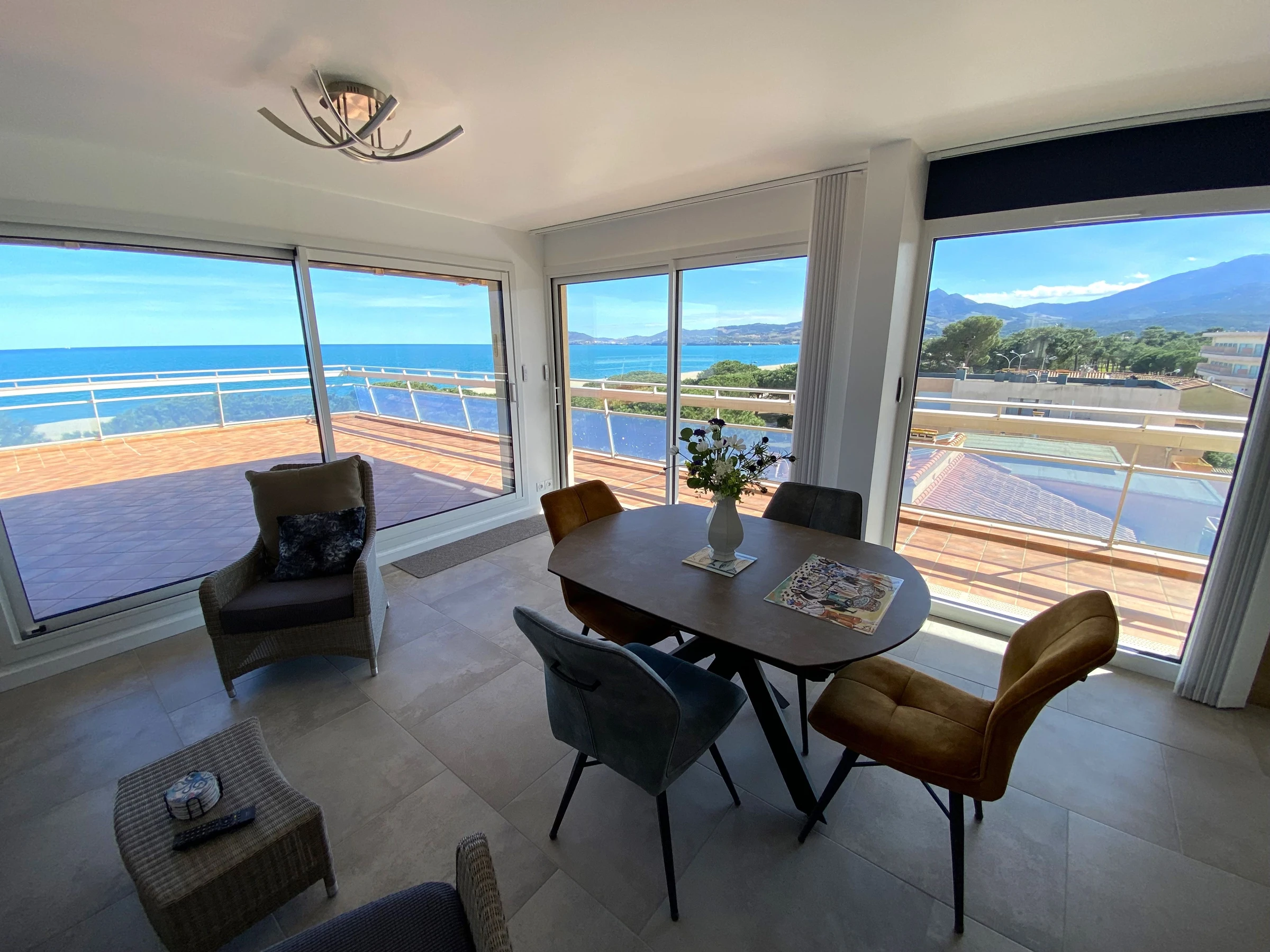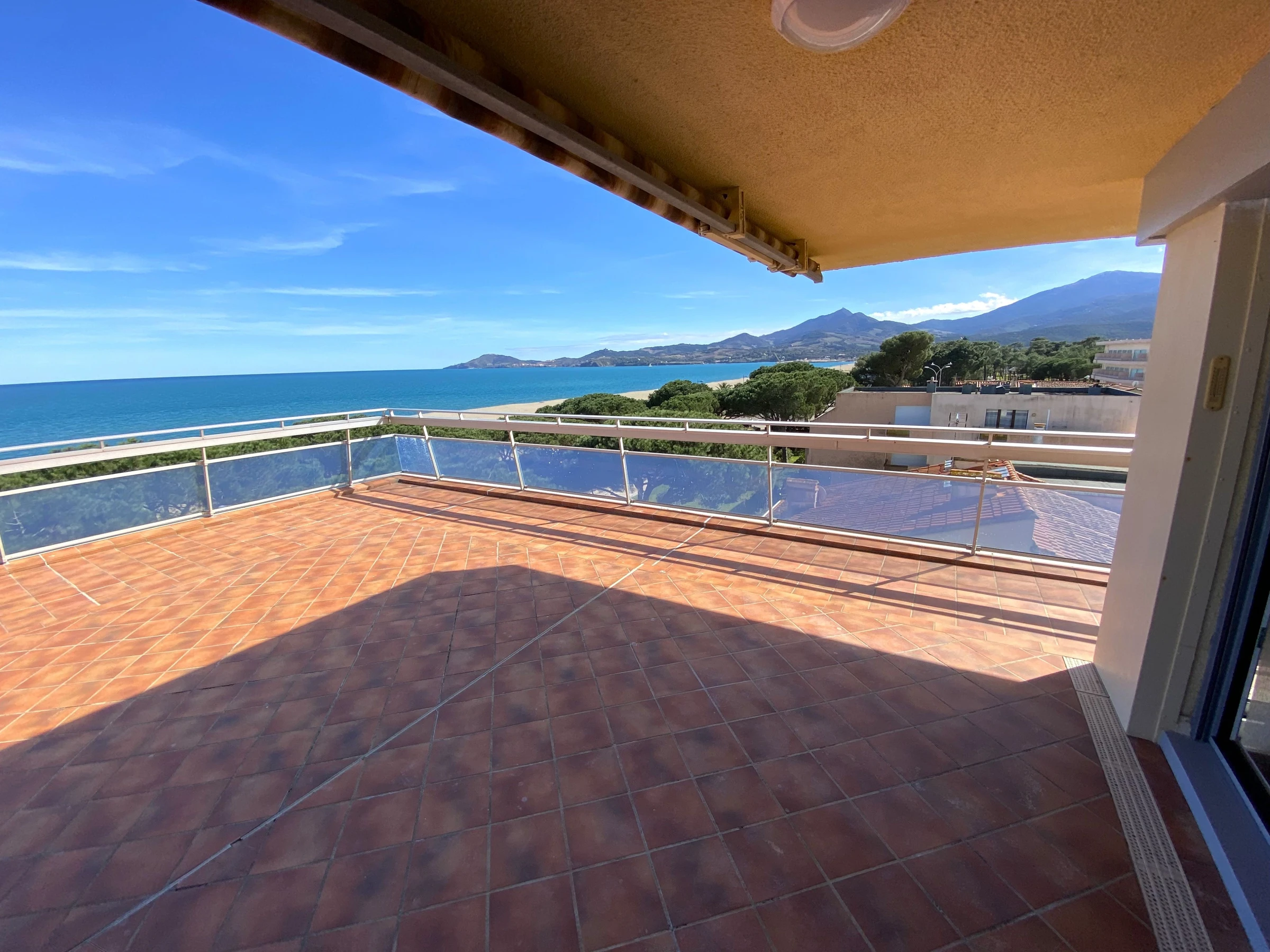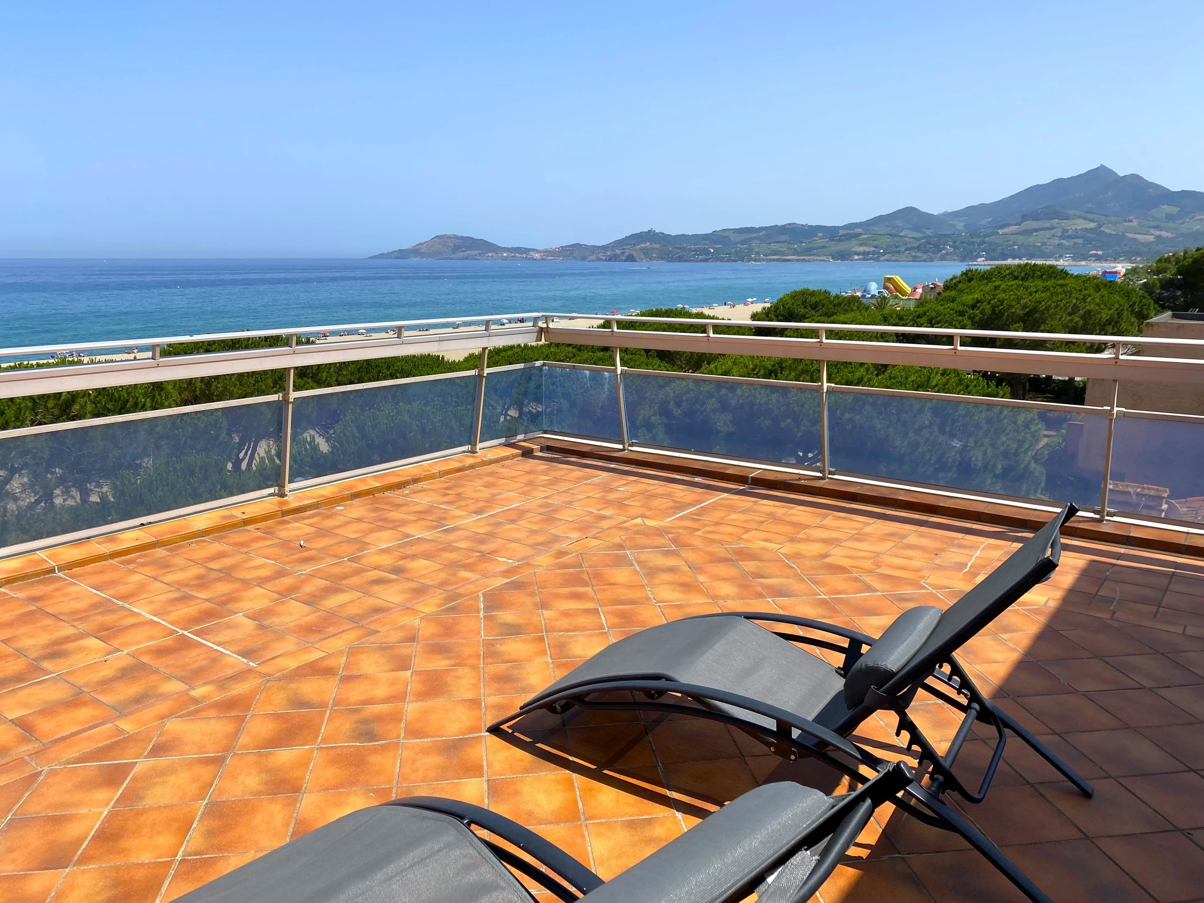 Sa terrasse de 120m² face à la mer lui confère une vue panoramique sur la plage et les Albères.