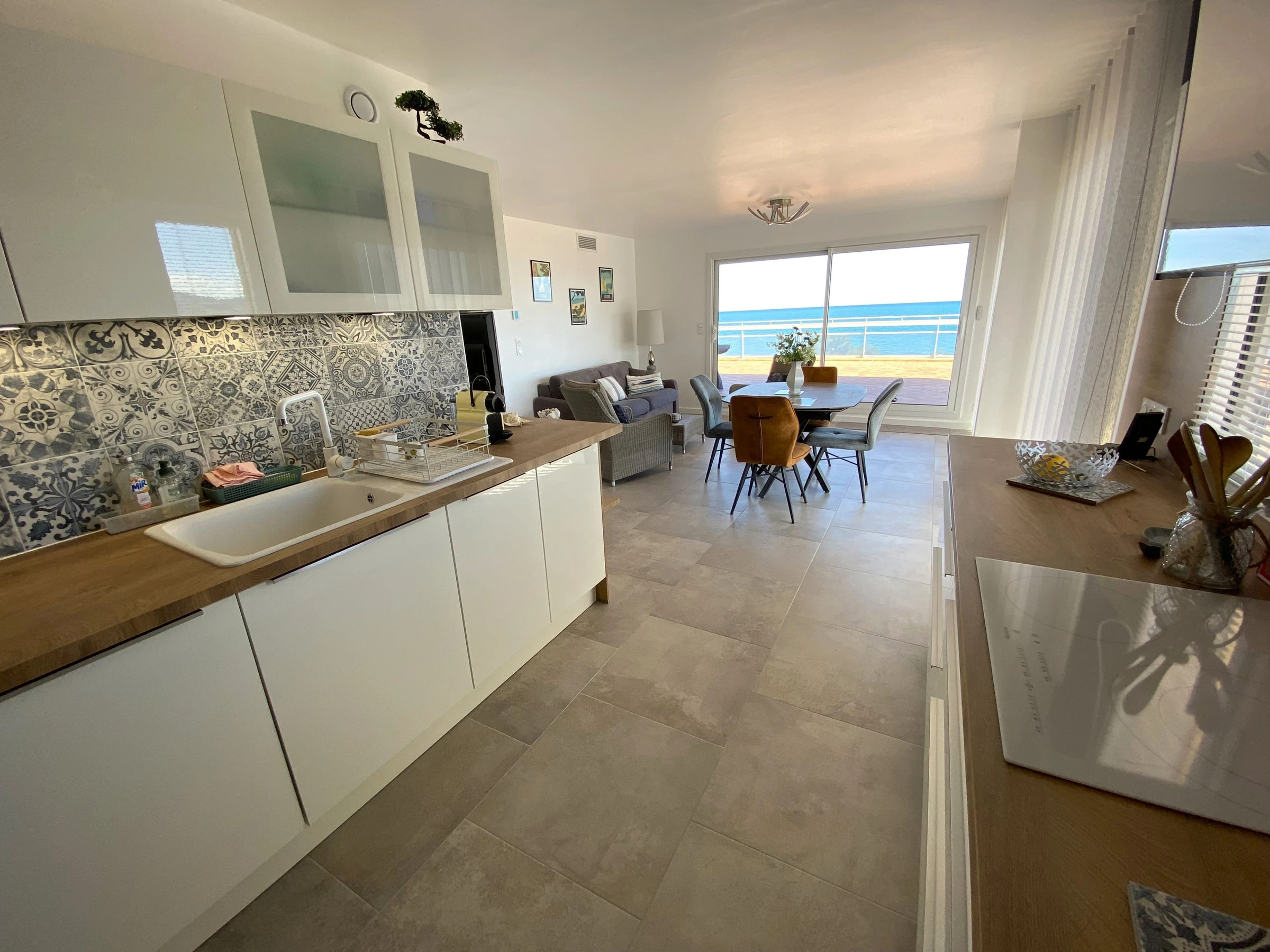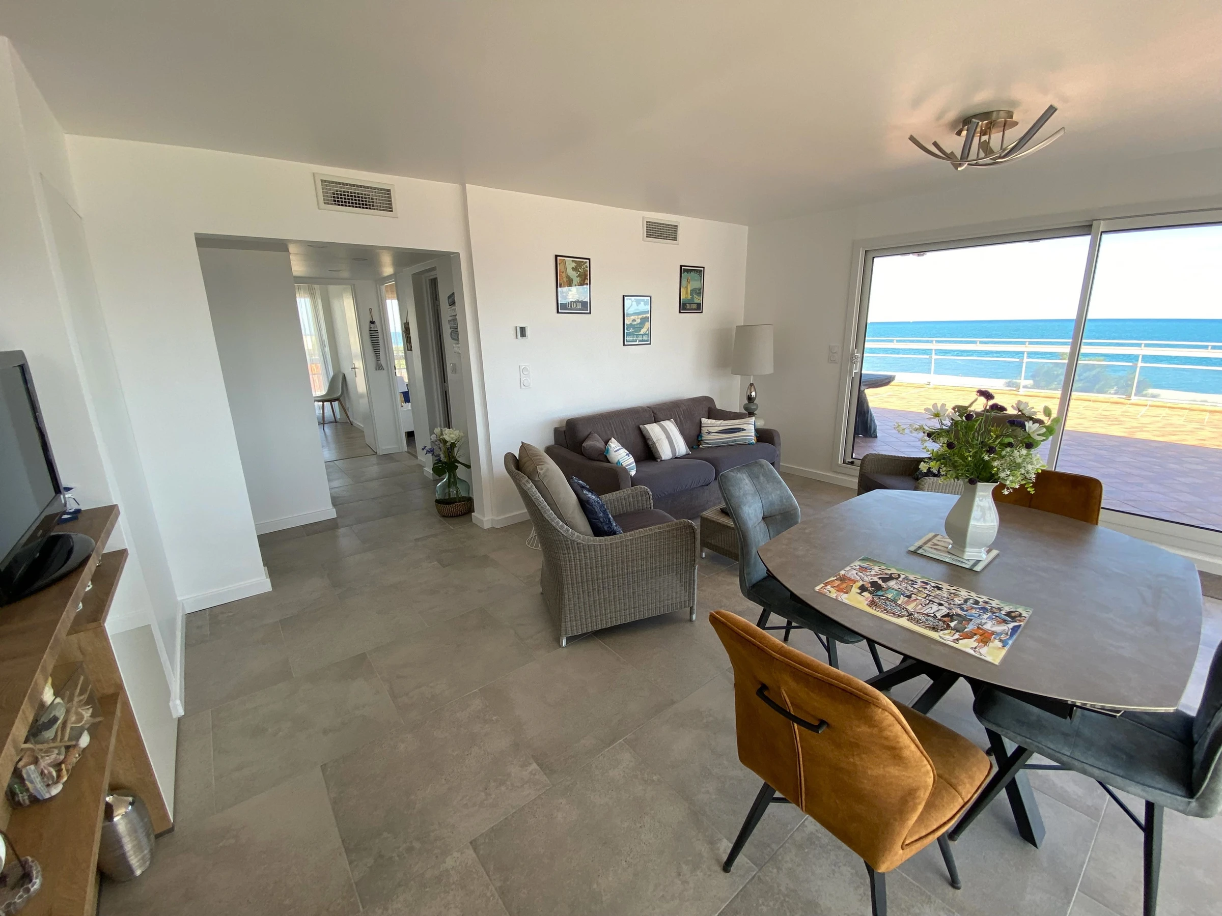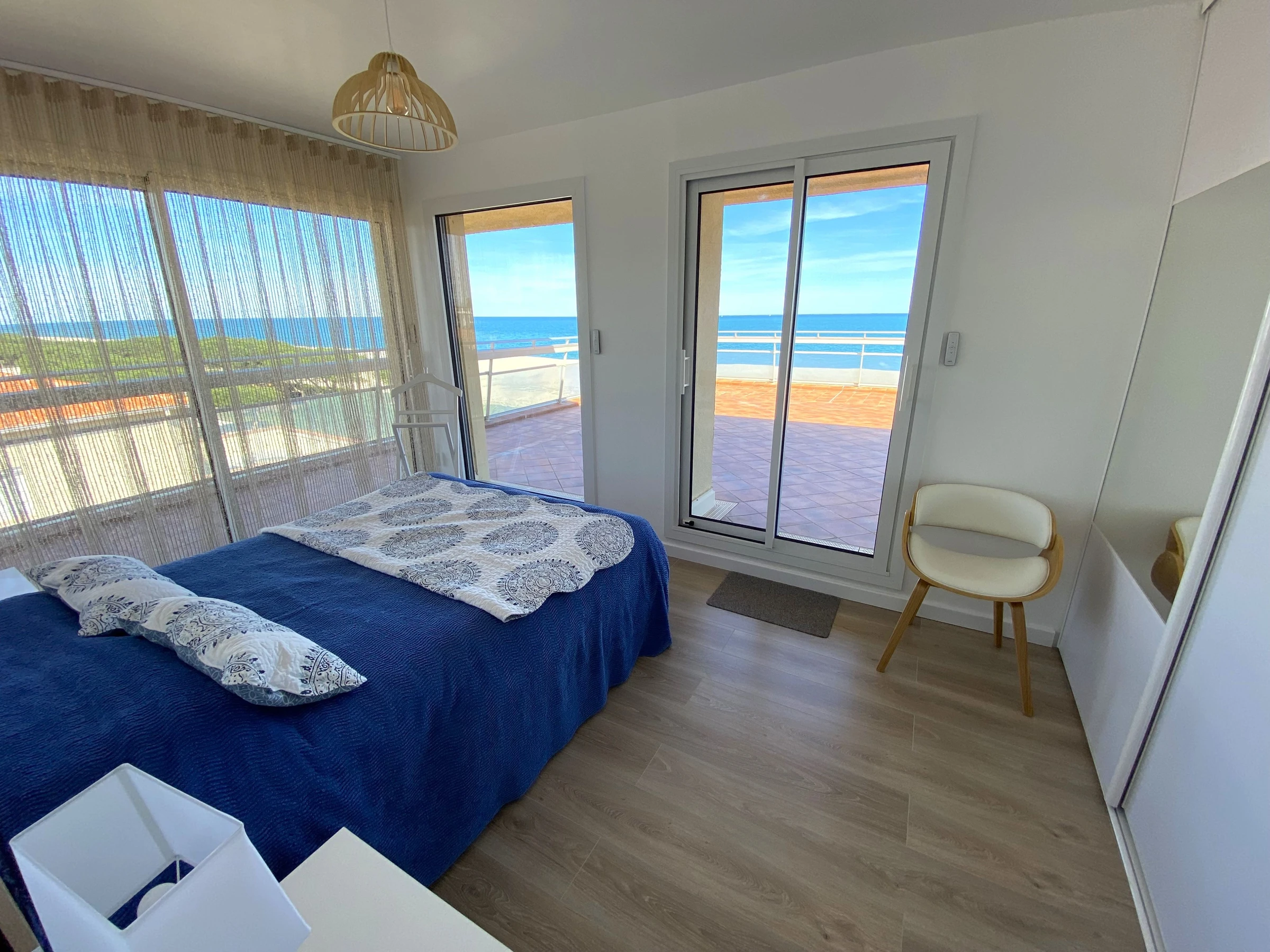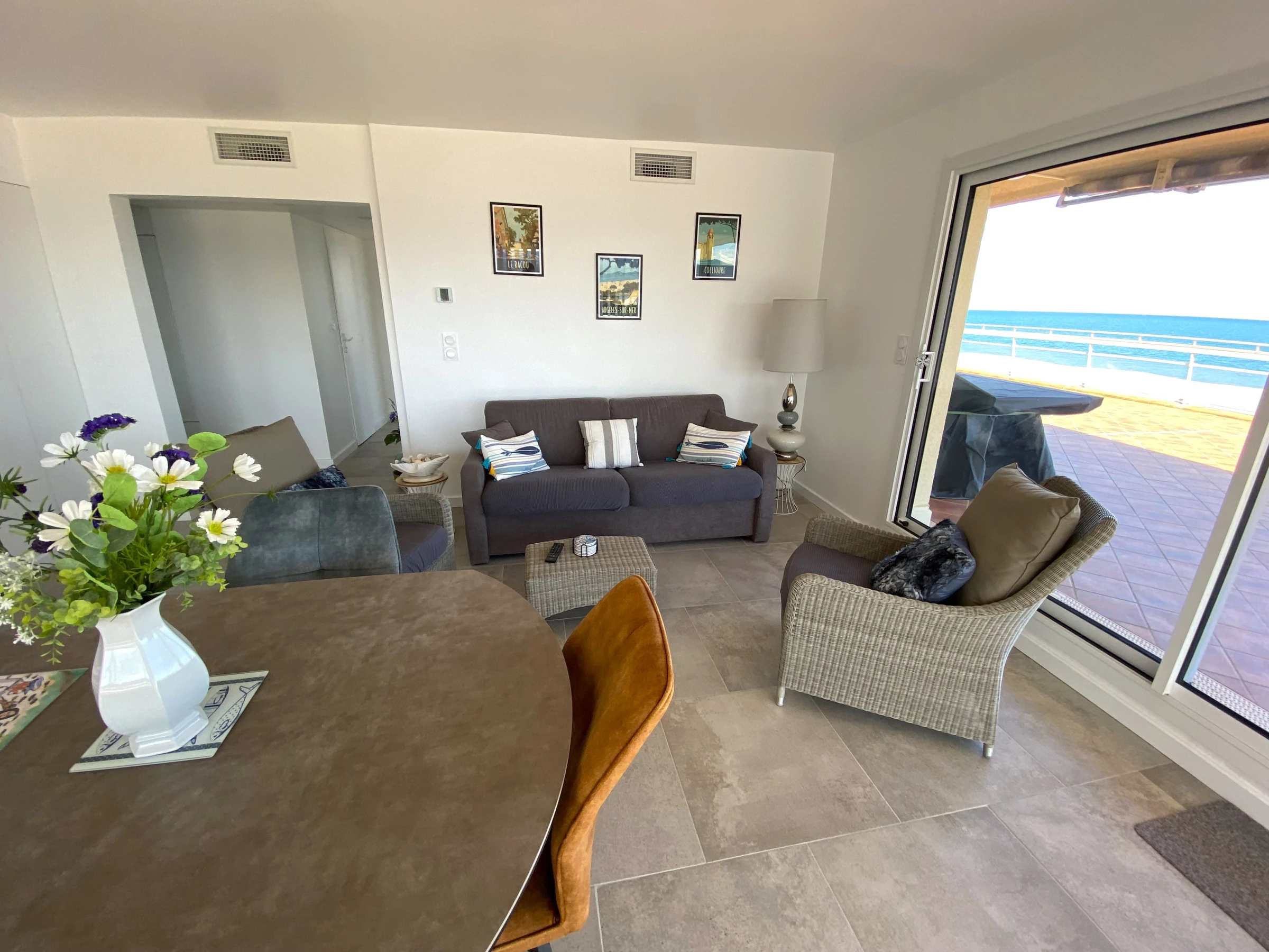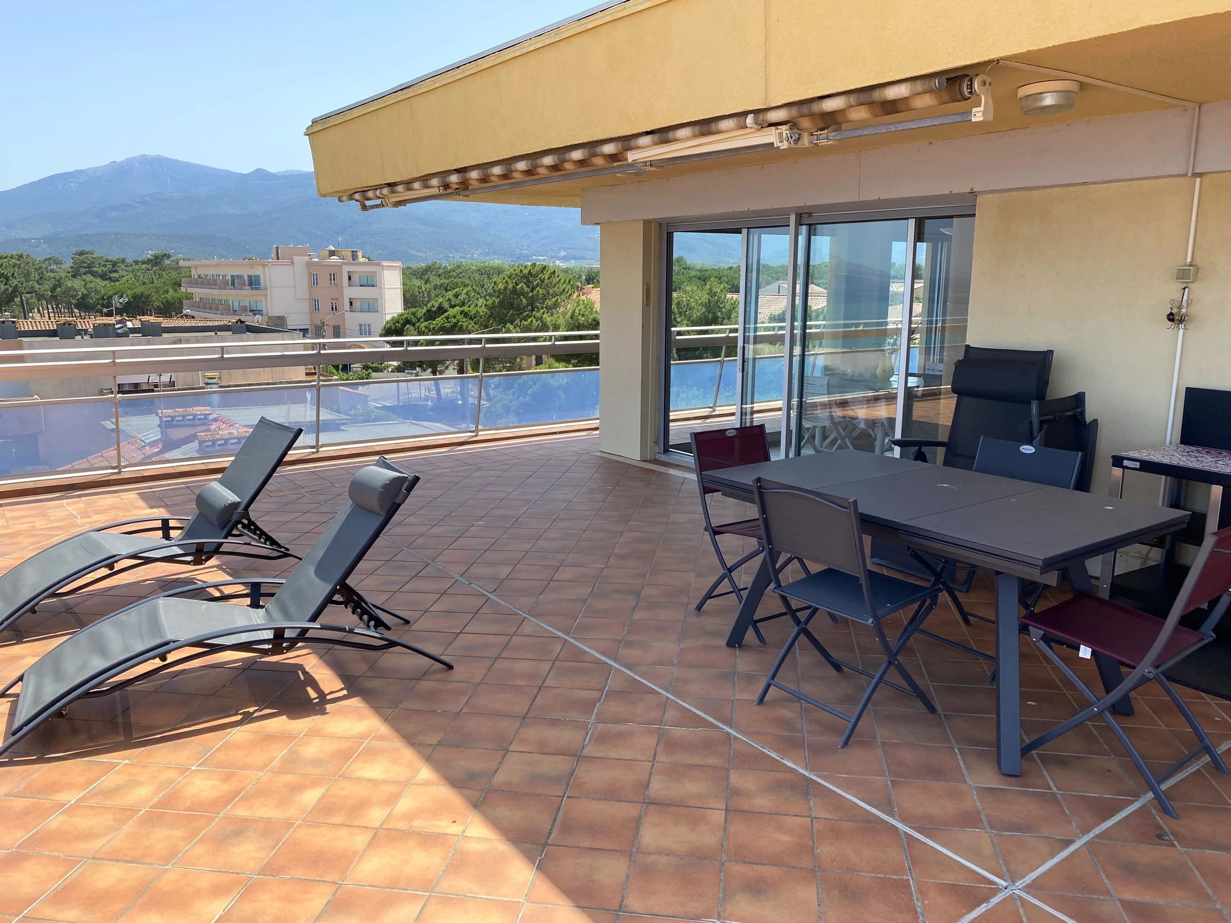 Sa terrasse de 120m² face à la mer lui confère une vue panoramique sur la plage et les Albères.