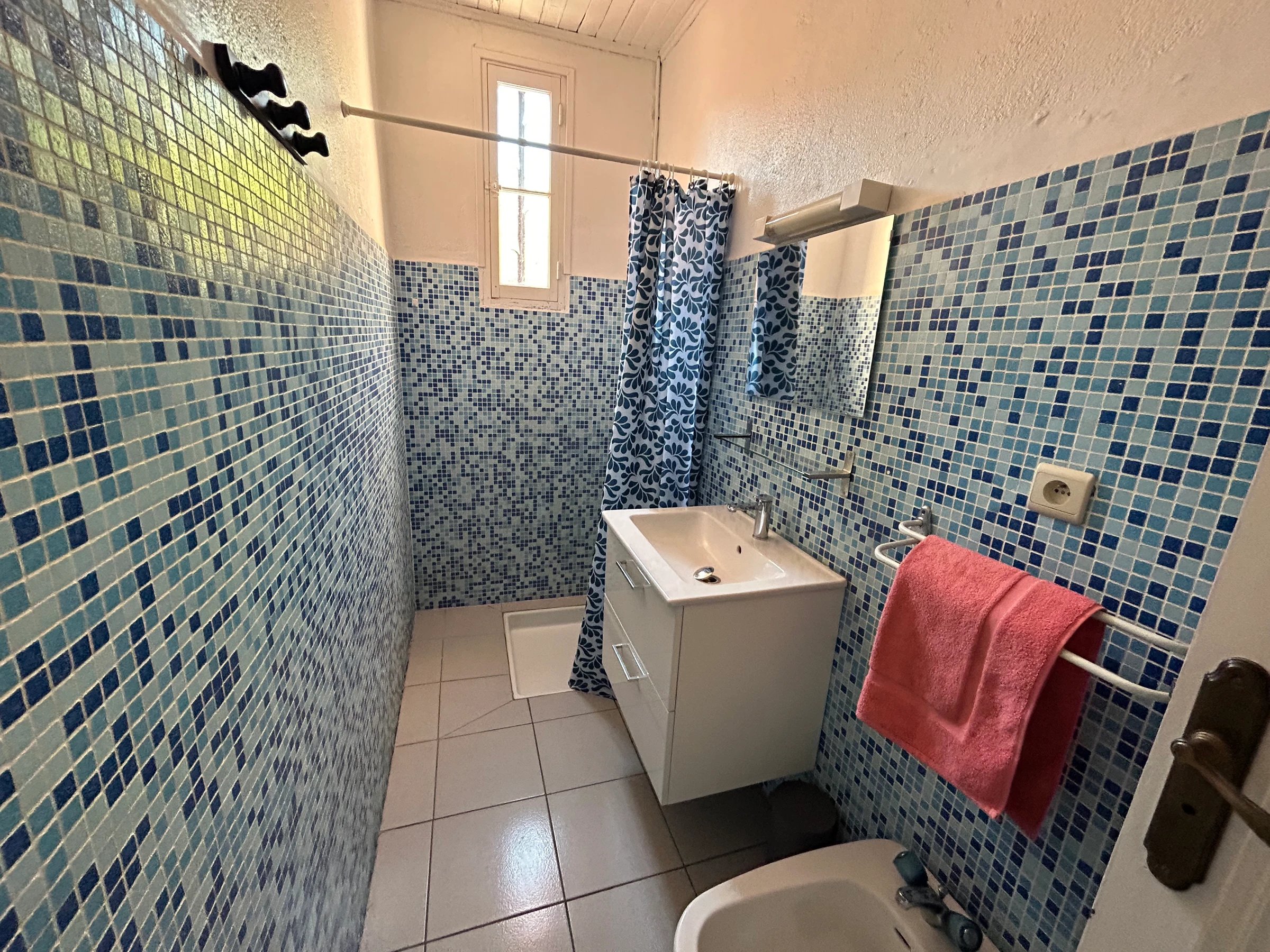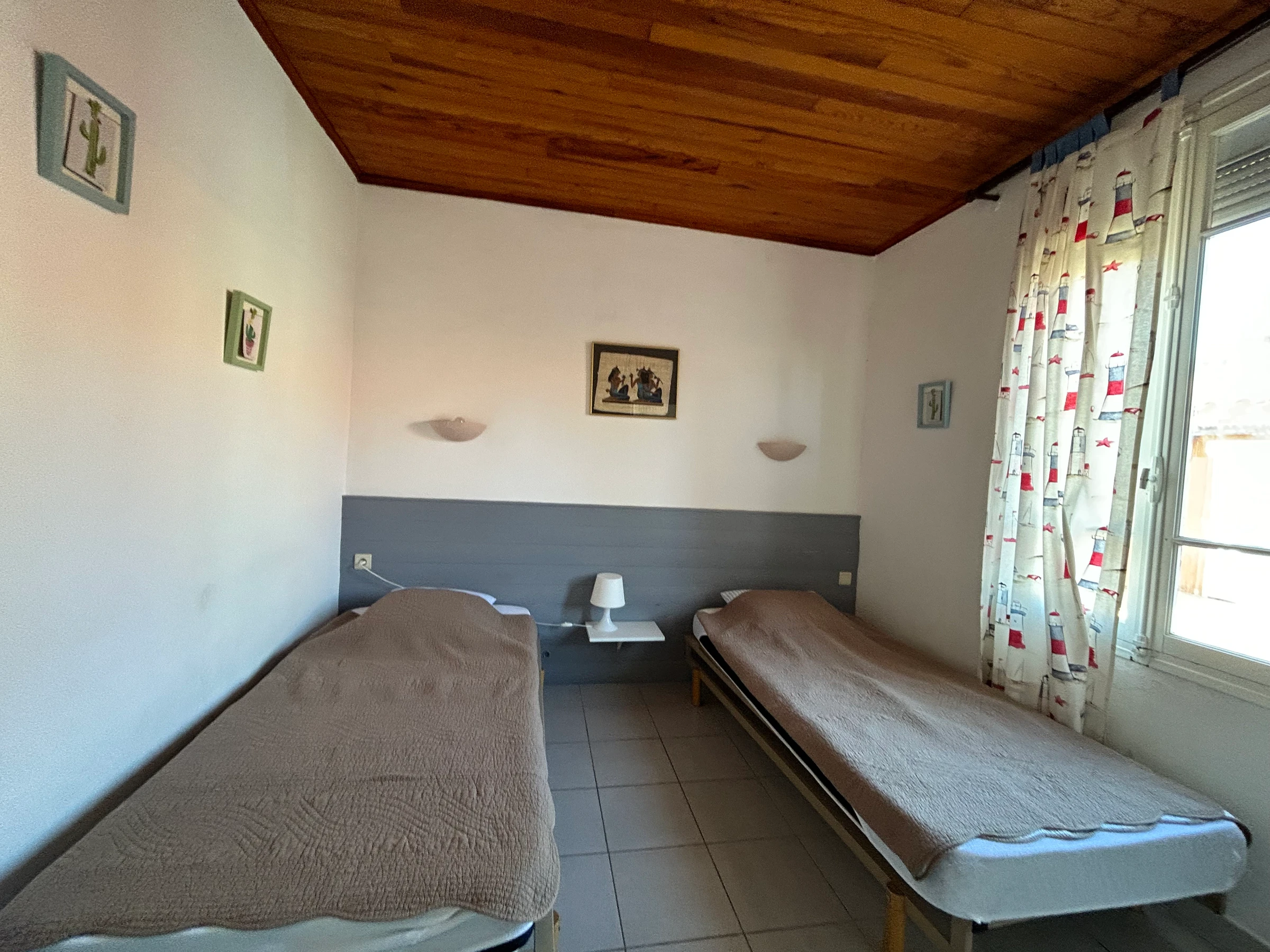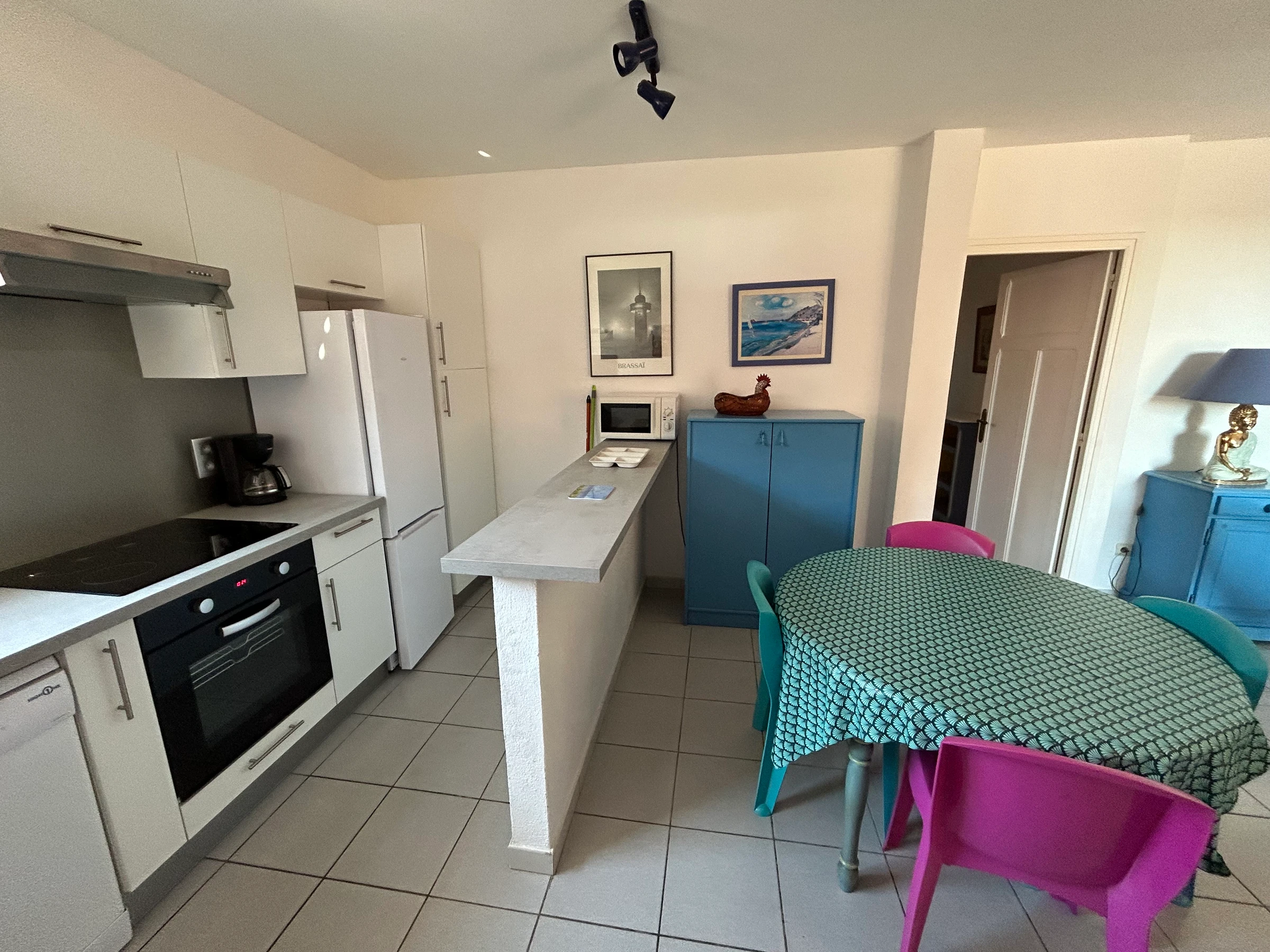 L'appartement est situé au rez-de-chaussée d'une villa à 50m de la mer. Il peut accueillir 6 personnes : 1 clic-clac 2 places dans le séjour, 2 lits 1 place dans une chambre et 1 lit 2 places dans une autre chambre. L'appartement est équipé d'un réfrigérateur/congélateur, de 4 plaques de cuisson, d'un four, d'un micro-ondes et d'un lave-linge (dans la buanderie commune avec le 1er étage). Il dispose notamment d'une terrasse de 16m² et d'une place pour garer une voiture dans la cour.