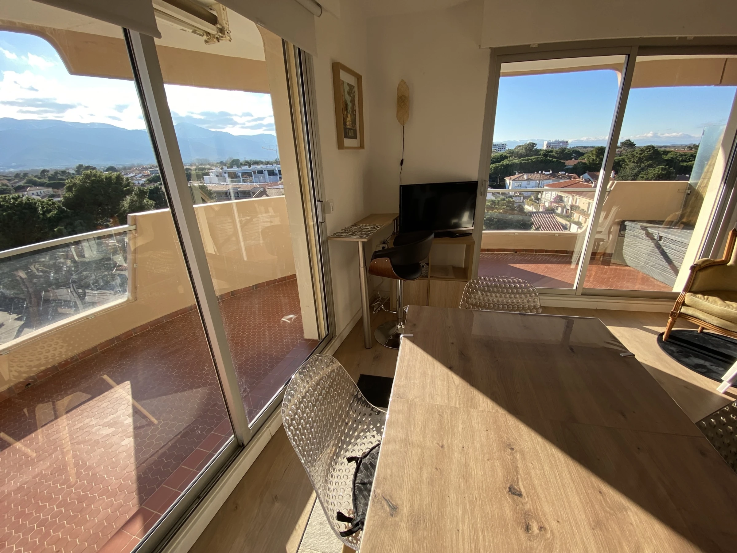 Il dispose notamment d'un balcon de 22m² ( avec un store) exposé Sud-Ouest avec vue sur mer latérale et montagnes et d'une place de parking privative.