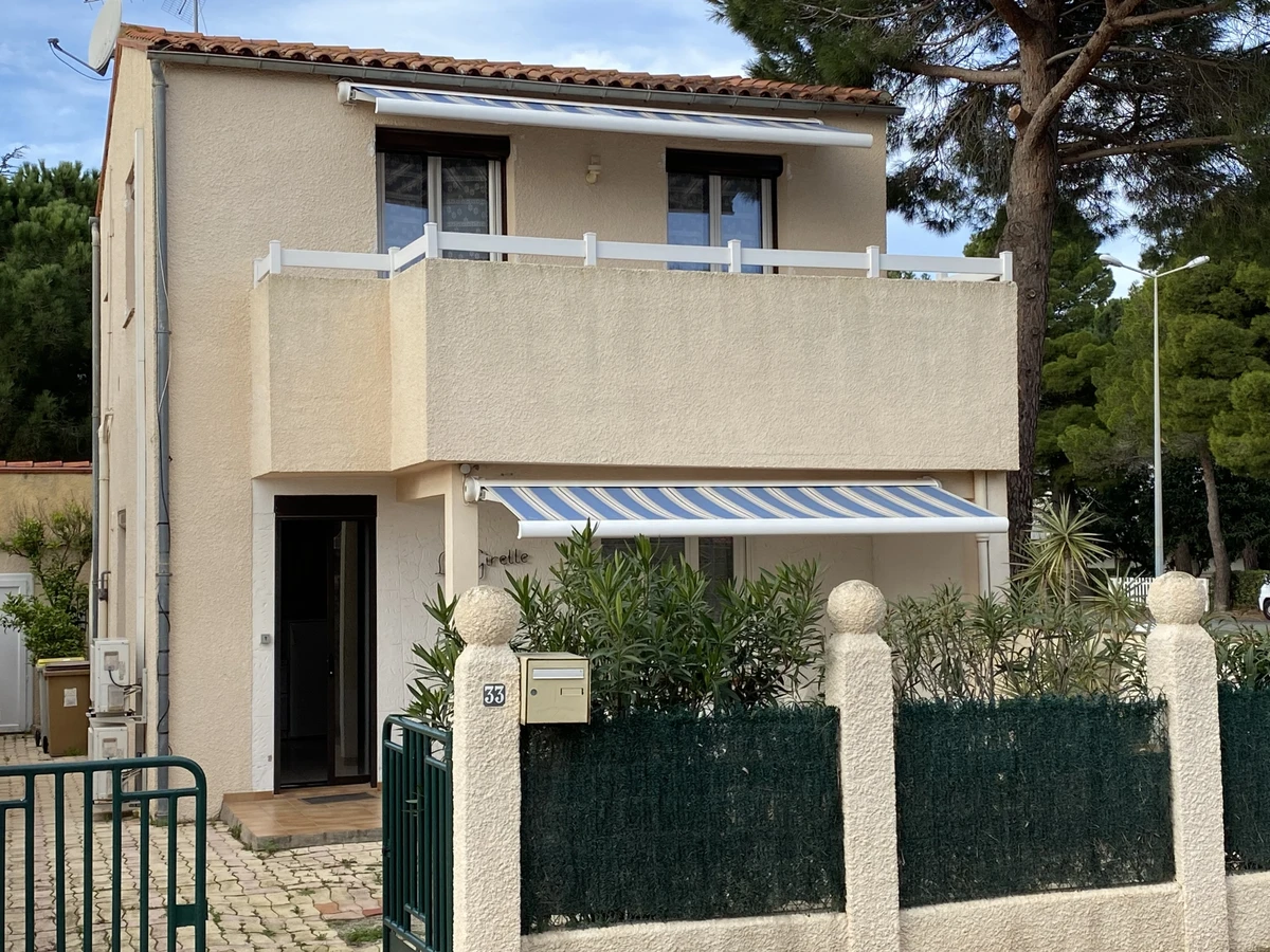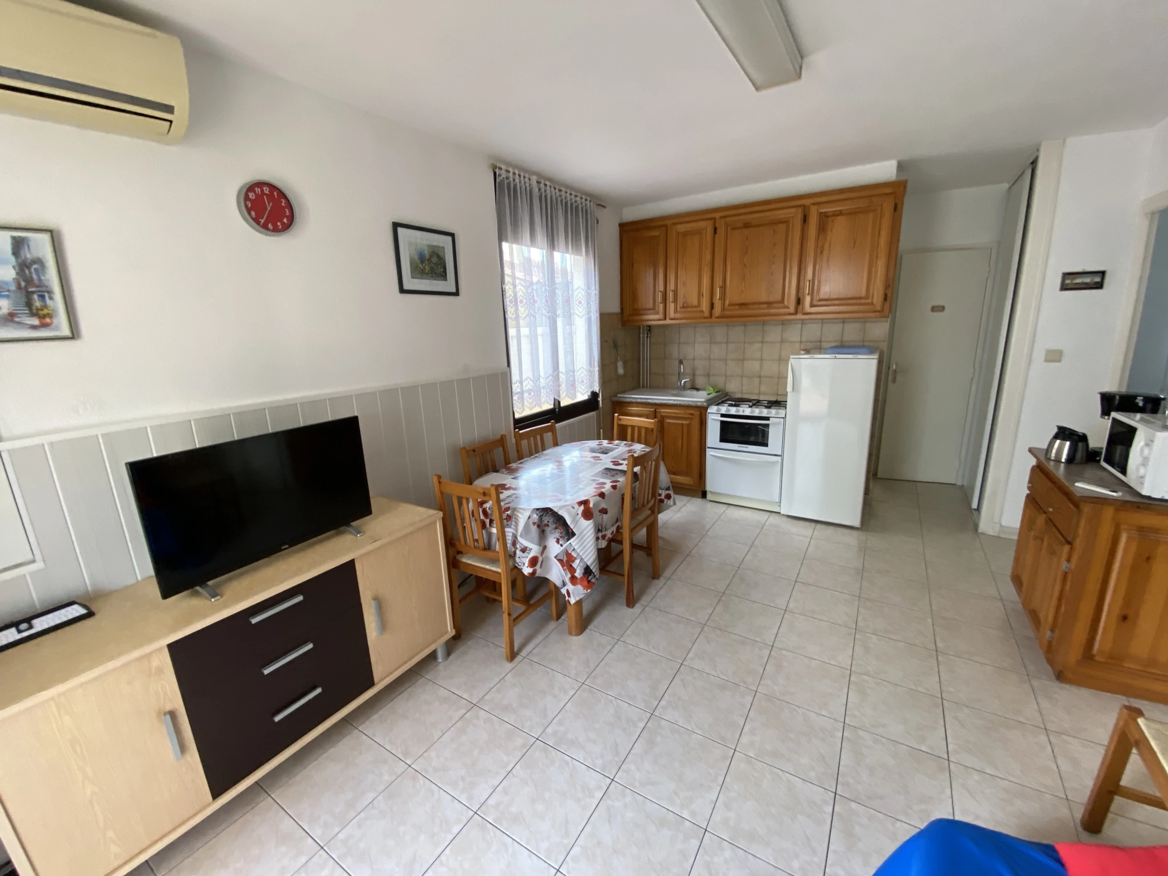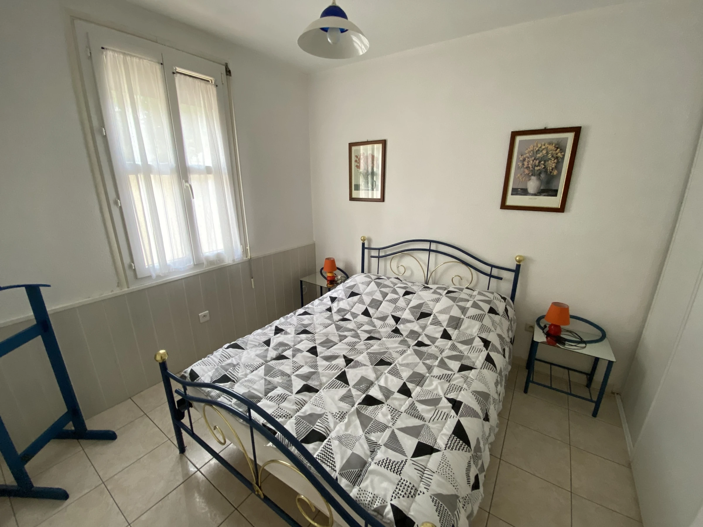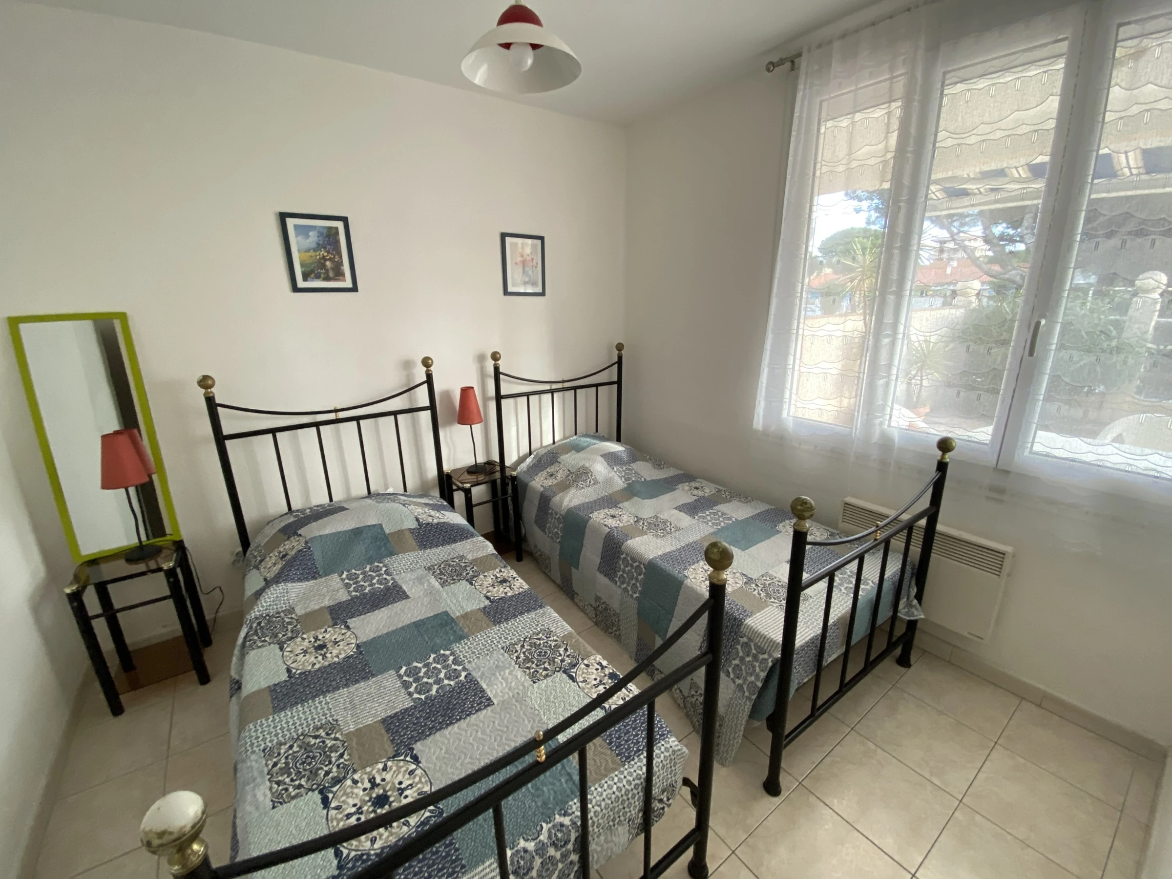 L'appartement est situé au rez-de-chaussée d'une villa. Il peut accueillir 4 à 5 personnes : 1 canapé BZ 2 places dans le séjour + 1 lit 2 places dans une chambre et 2 lits 1 place dans la 2°chambre. L'appartement est équipé d'un réfrigérateur/congélateur, d'un four, d'un micro-onde, d'un lave-linge, d'un lave-vaisselle et d'une télévision. Il dispose notamment d'une terrasse (avec store) de 14m² et d'une cour avec place de parking privée. L'appartement a la climatisation.