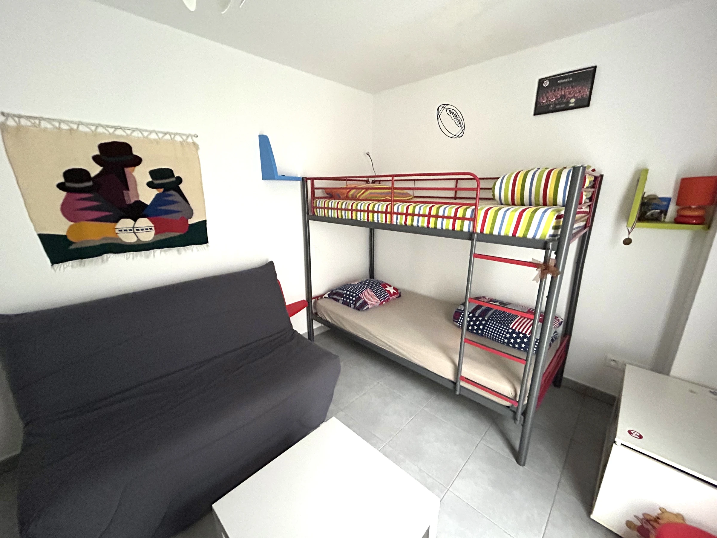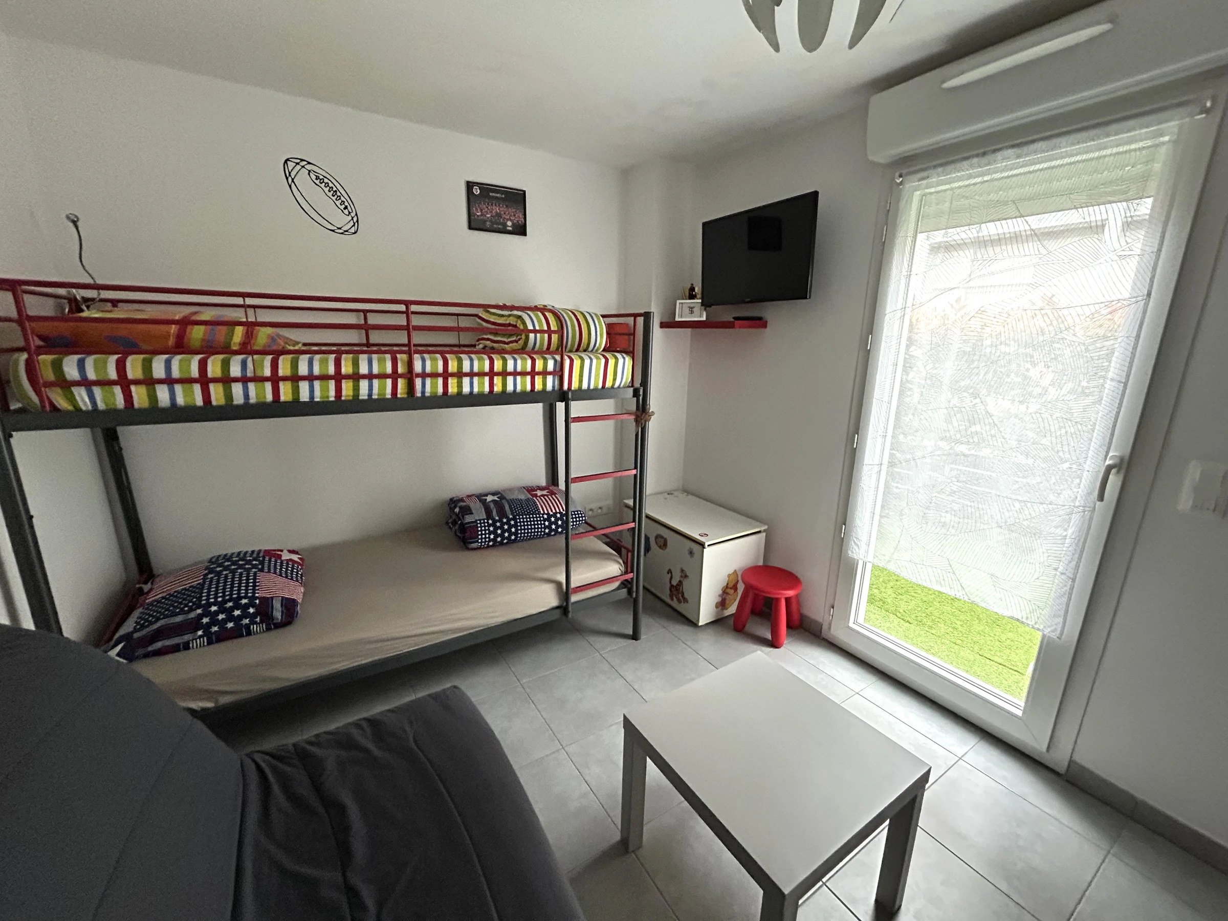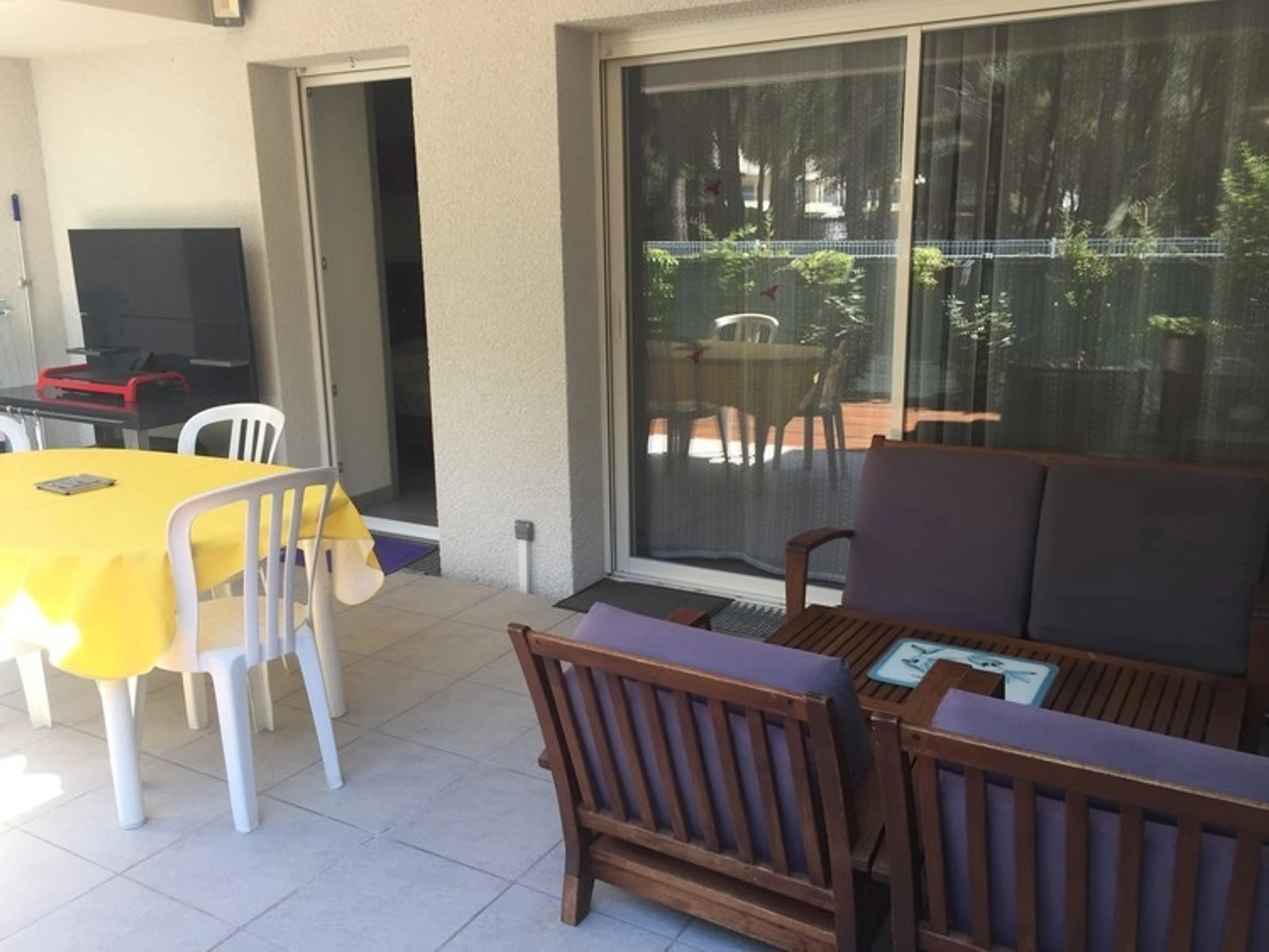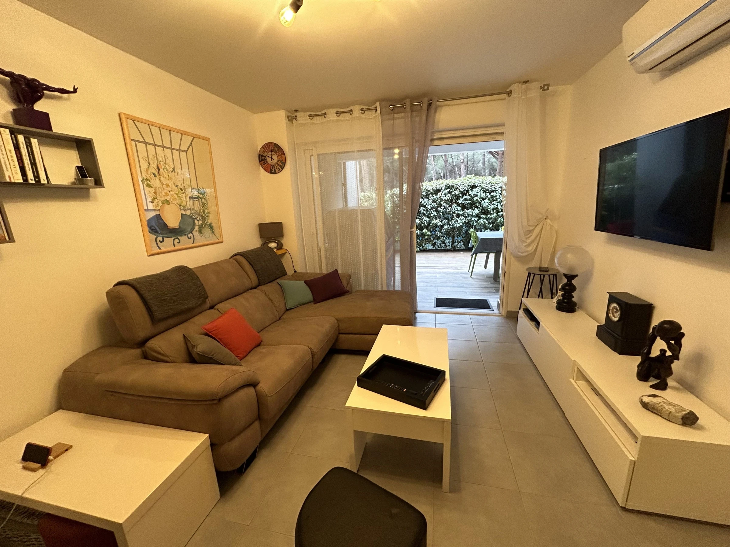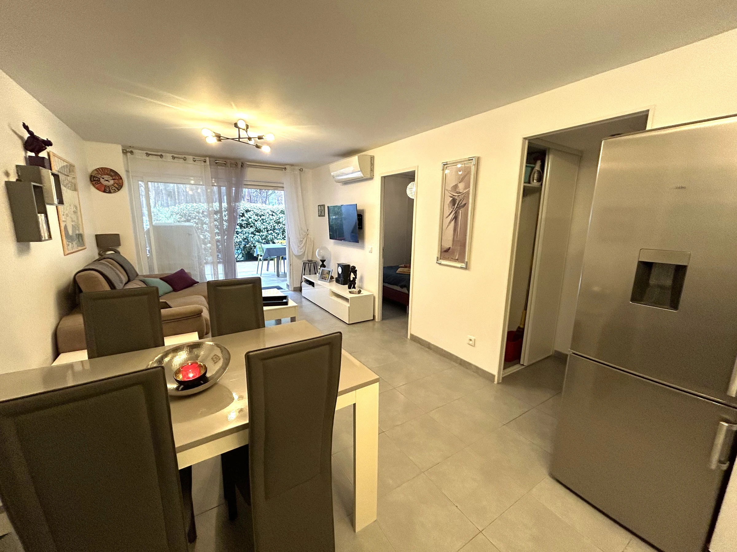 L'appartement est situé au rez de chaussée d'une résidence sécurisée avec piscine, à 200m de la plage. Il peut accueillir 4 personnes : 1 lit 2 places dans la chambre et 1 canapé BZ 2 places ainsi qu'un lit superposé 1 place dans la seconde chambre. Le logement est équipé d'un réfrigérateur/congélateur, de plaques de cuissons, d'un four, d'un micro-ondes, d'un lave-linge et d'un lave-vaisselle. Il dispose notamment de deux salles d'eau, de la climatisation, de 2 jardins (respectivement 20m² et 10 m²) avec stores sur la terrasse de 15m² et d'une place de parking privée. De plus il y a une télévision dans chaque pièce à vivre et internet sans fil.