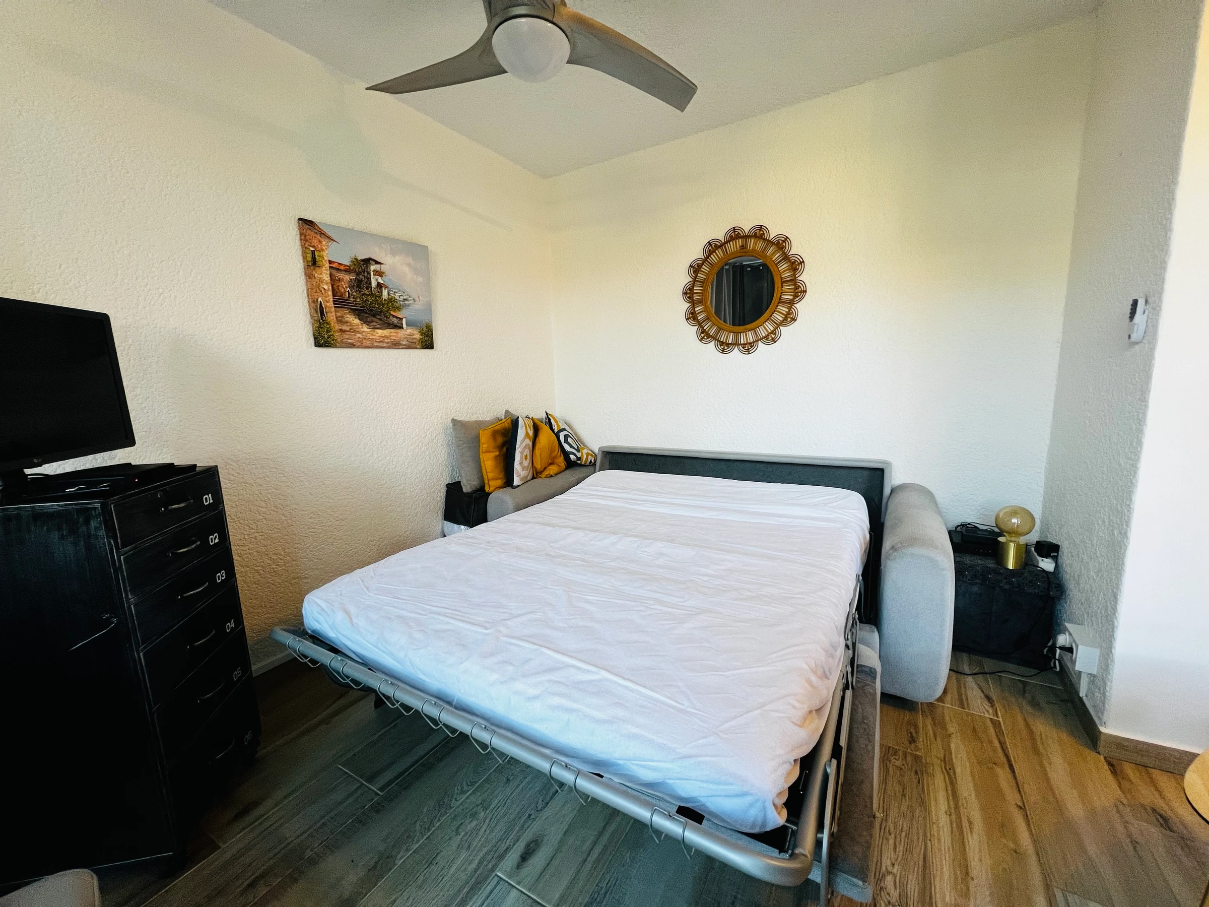 C'est au calme dans une charmante résidence sécurisée entre plage et village que vous trouverez cet appartement de type F2 en rez de jardin, entièrement refait à neuf.