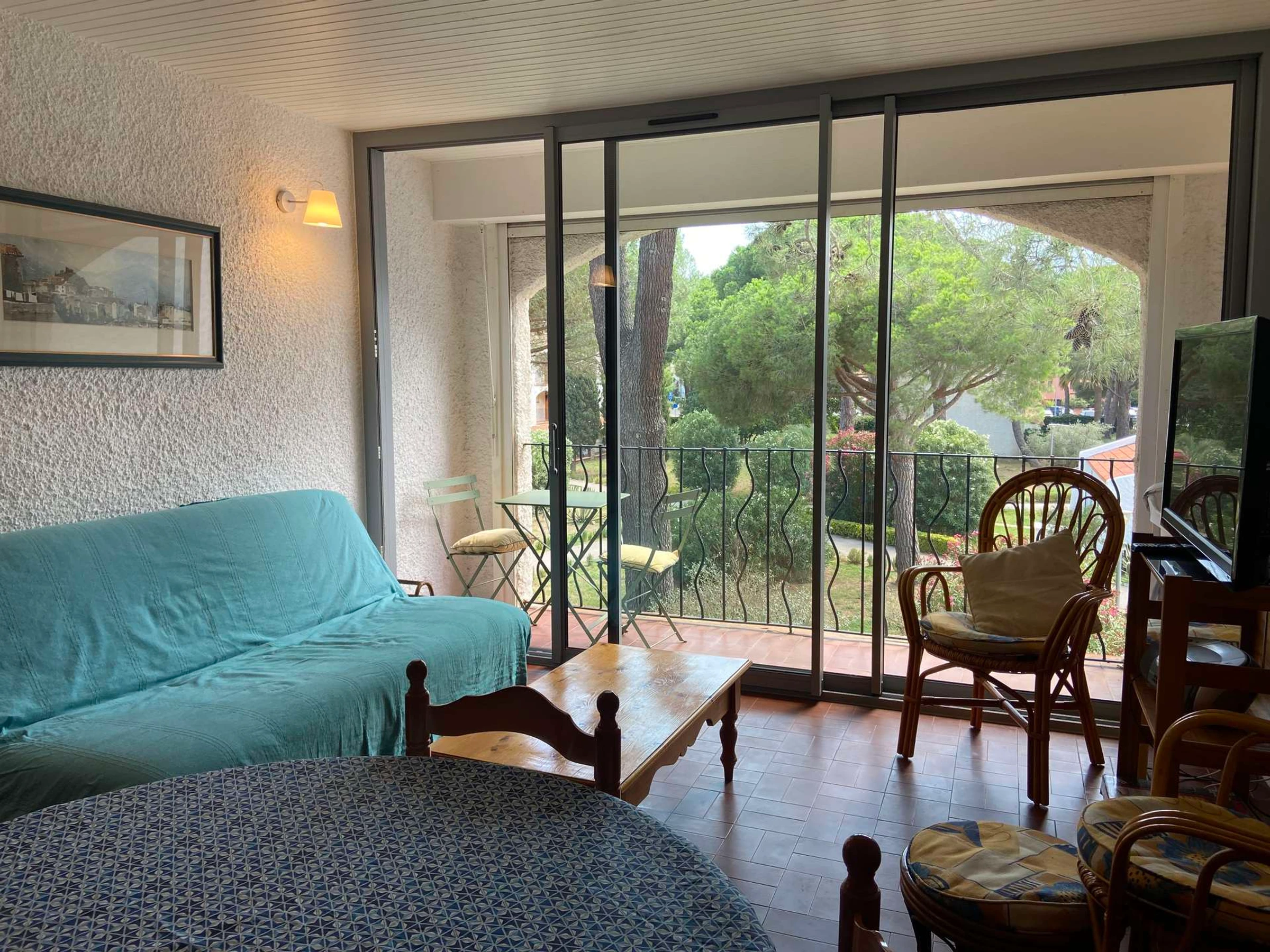 SEJOUR/SALON : 1 canapé 2 P + téléviseur, balcon côté piscine et jardins,