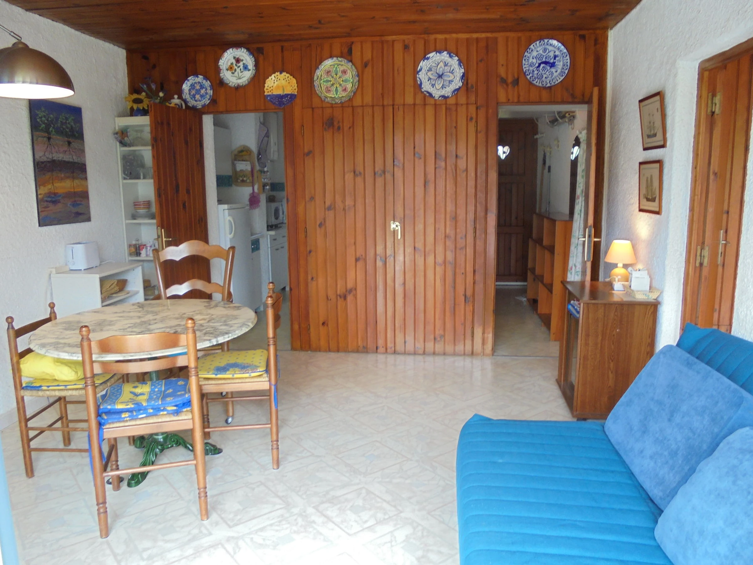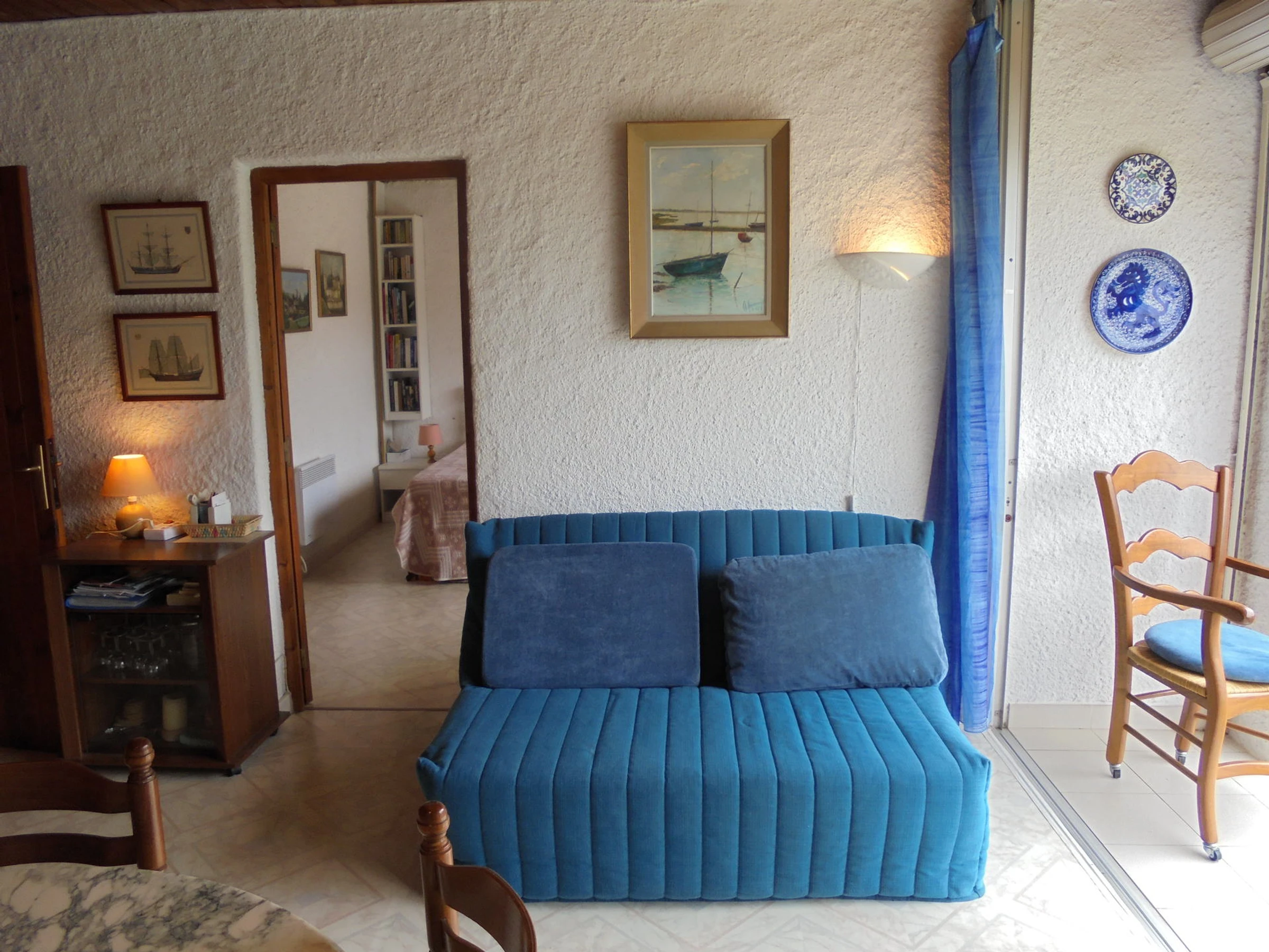 SEJOUR/SALON : 1 canapé-lit 1 place, téléviseur 60cm , balcon côté piscine