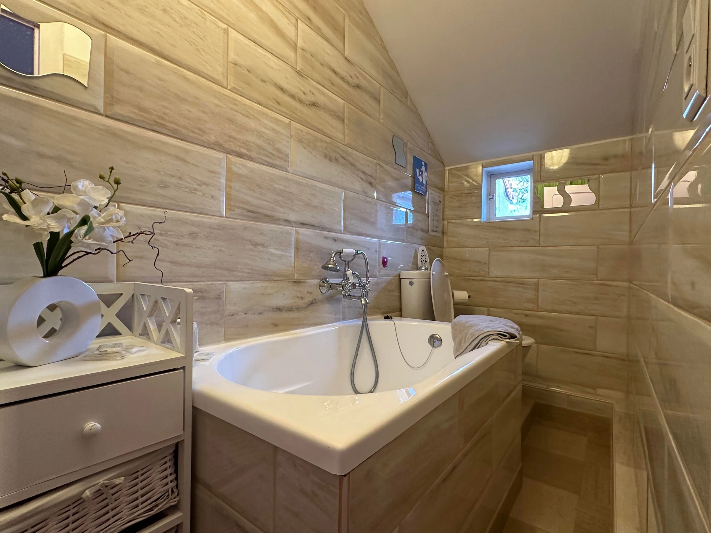 Salle de bains avec douche et baignoire d’angle. WC séparés. Buanderie avec machine à laver.