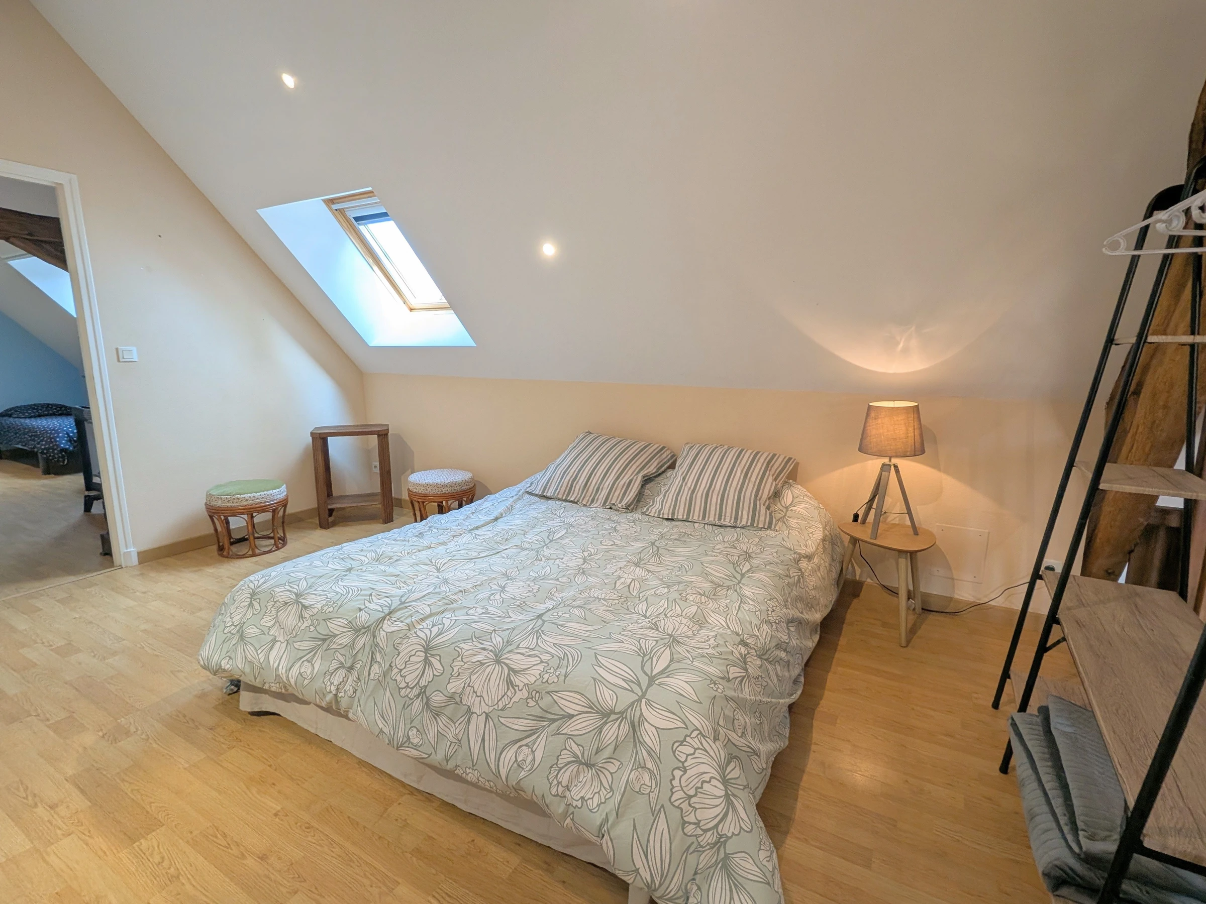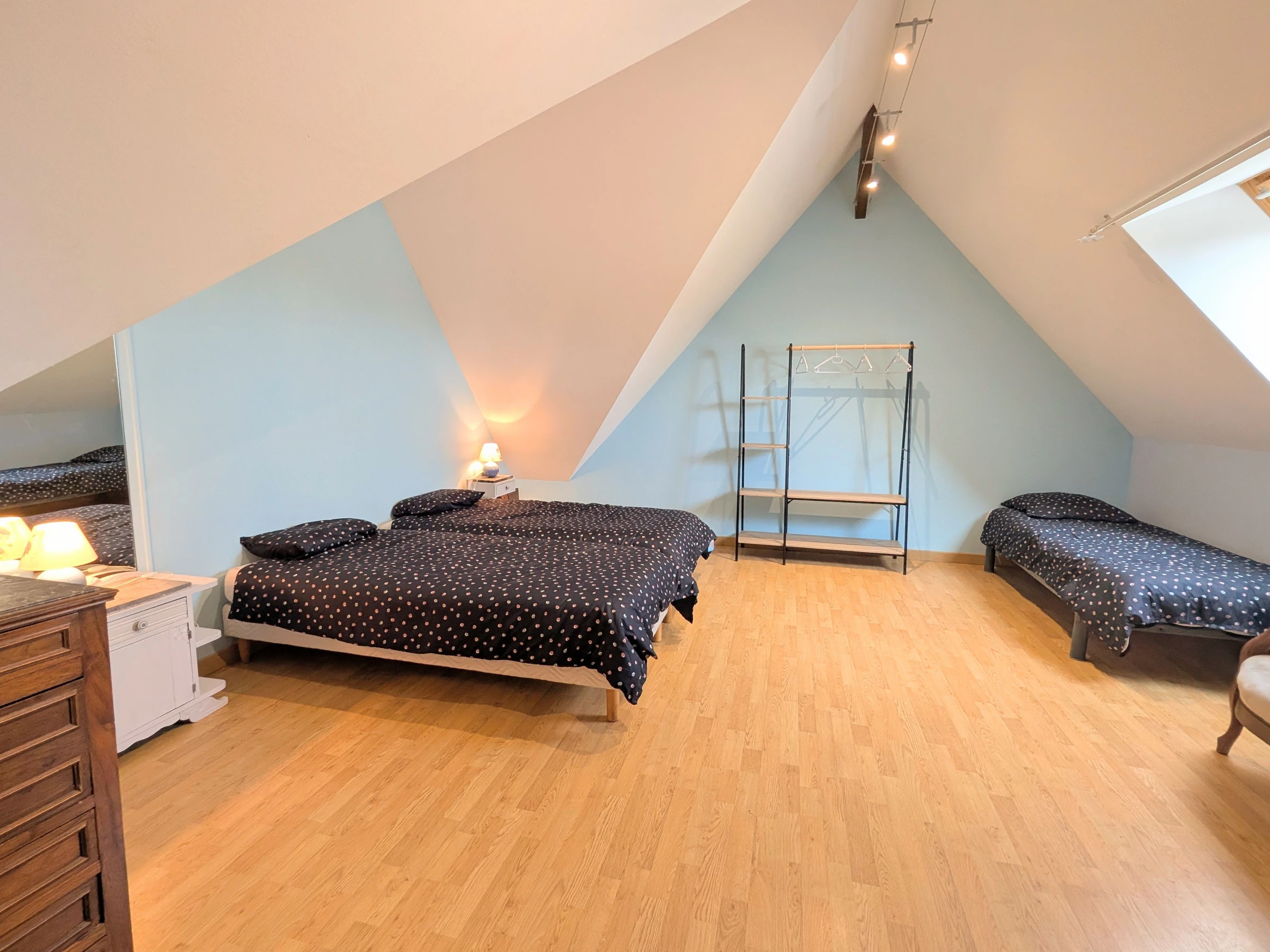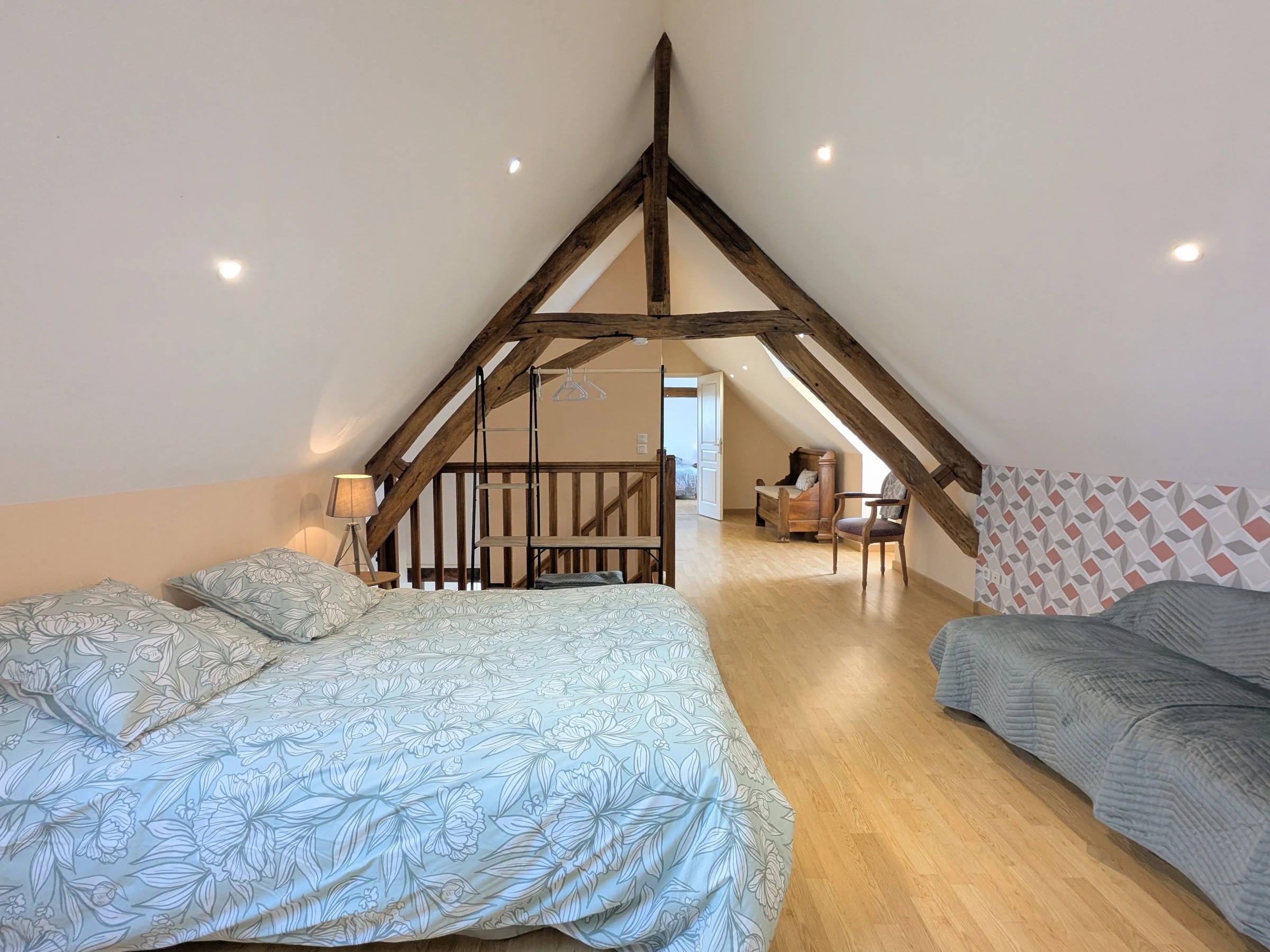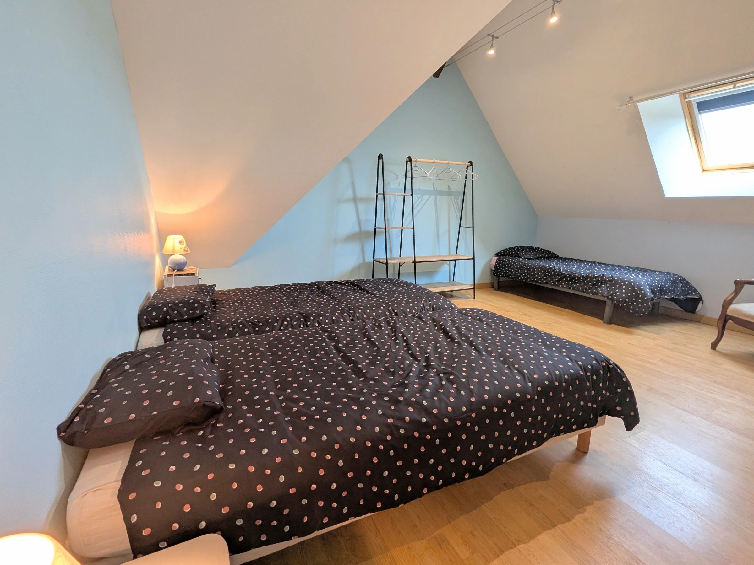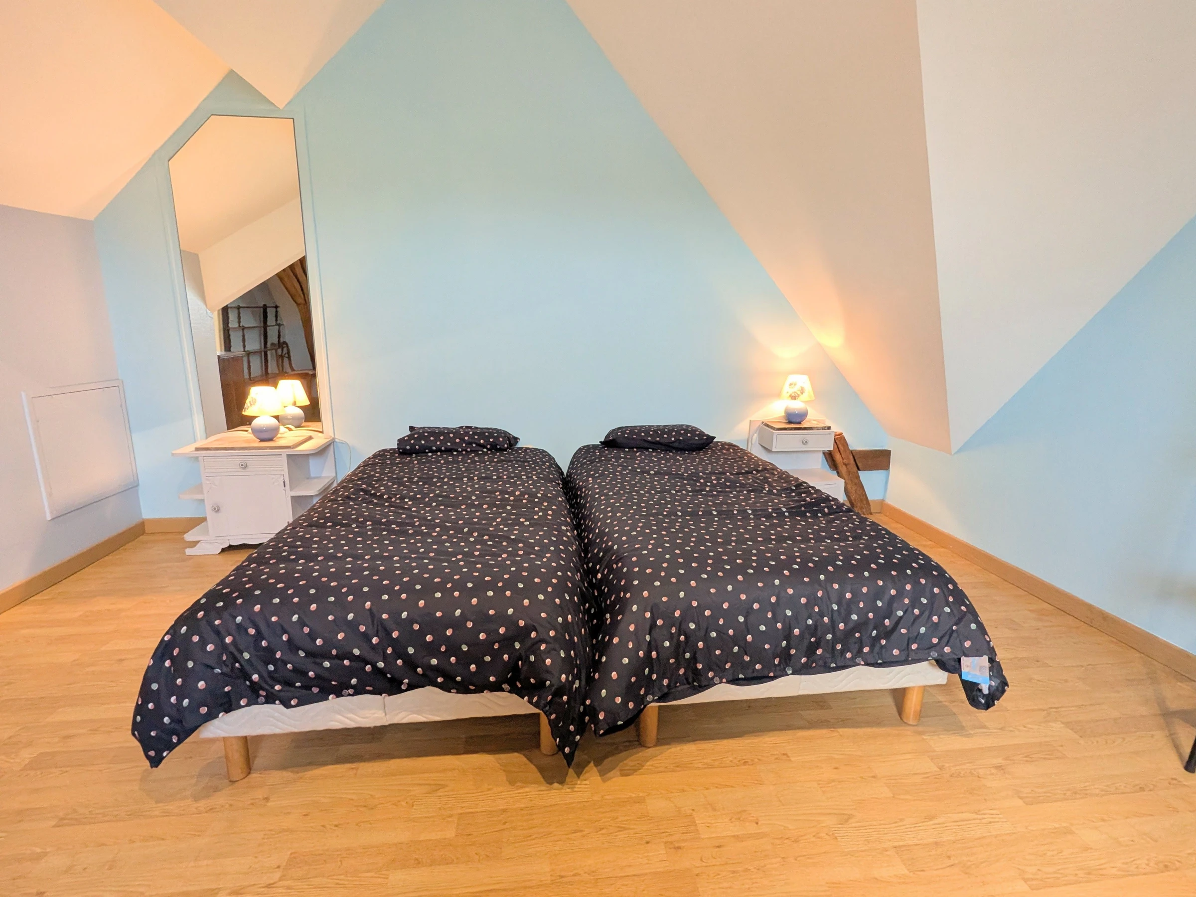 Au 1er étage, un palier avec un lit 2 personnes (160x200 cm sur un canapé Bz mais avec un véritable matelas, une chambre avec 2 lits de 90x200 cm pouvant être rapprochés pour former un lit 2 personnes, (un lit de 80x190 cm en supplément sur demande) et un lit bébé. Une chambre avec un lit 2 personnes de 180x200 cm pouvant être séparé en 2 lits 1 personnes (90x200cm). Un wc. Une salle d'eau.