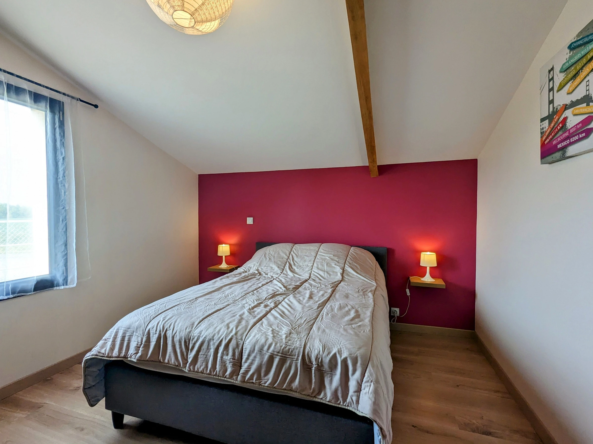À l'étage, en mezzanine, se trouve une grande chambre avec un lit double et un lit simple.