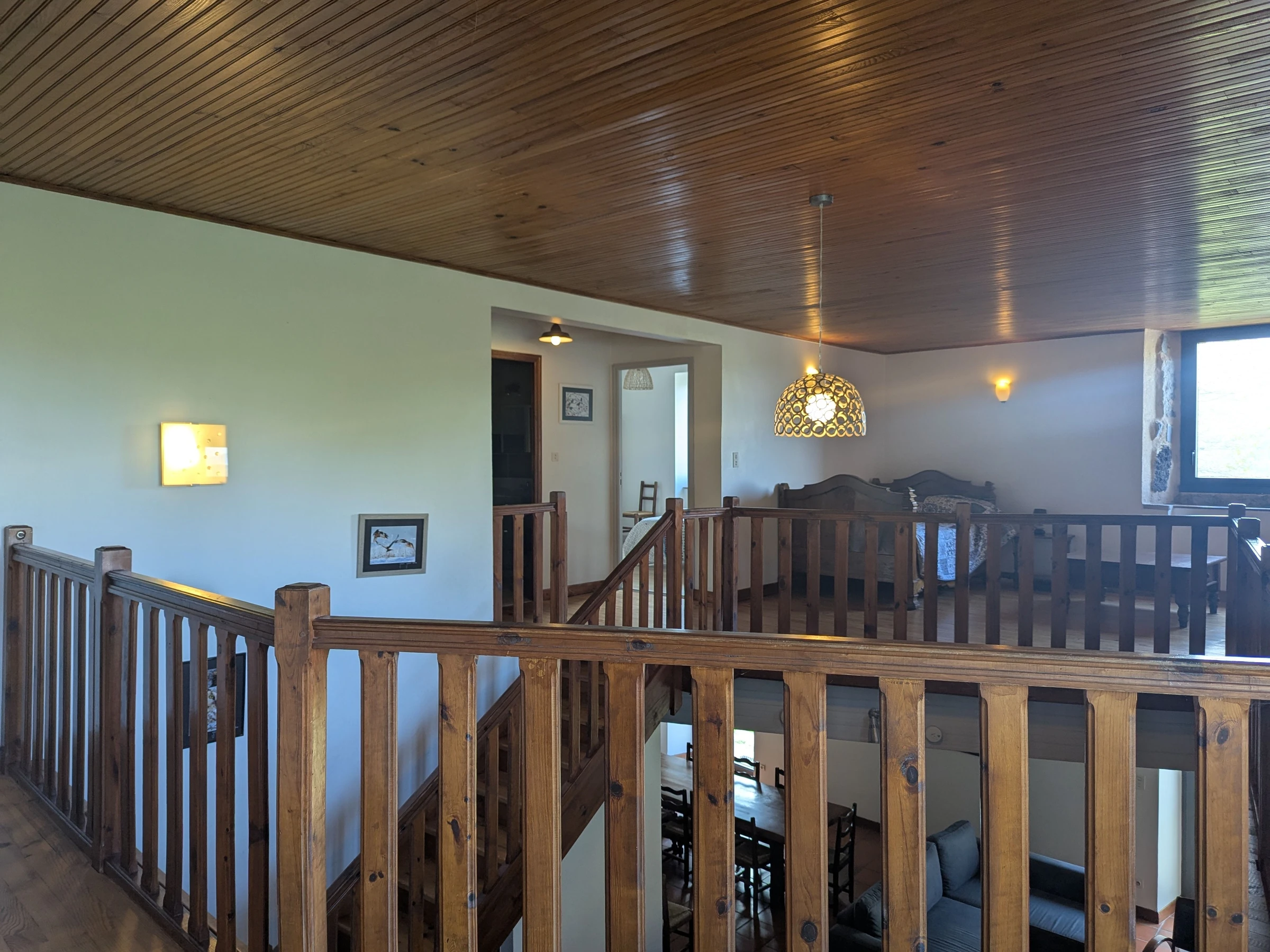 Au 1er étage, 3 chambres fermées : chb1 avec lit 160 aménagée dans l'ancienne chapelle de la demeure, chb2 avec lit 140 et chb3 familiale avec lit 140 et 2 lits 90 superposés. Une grande mezzanine avec coin lecture, canapé convertible et lit de coin 120. Salle de bains, wc.