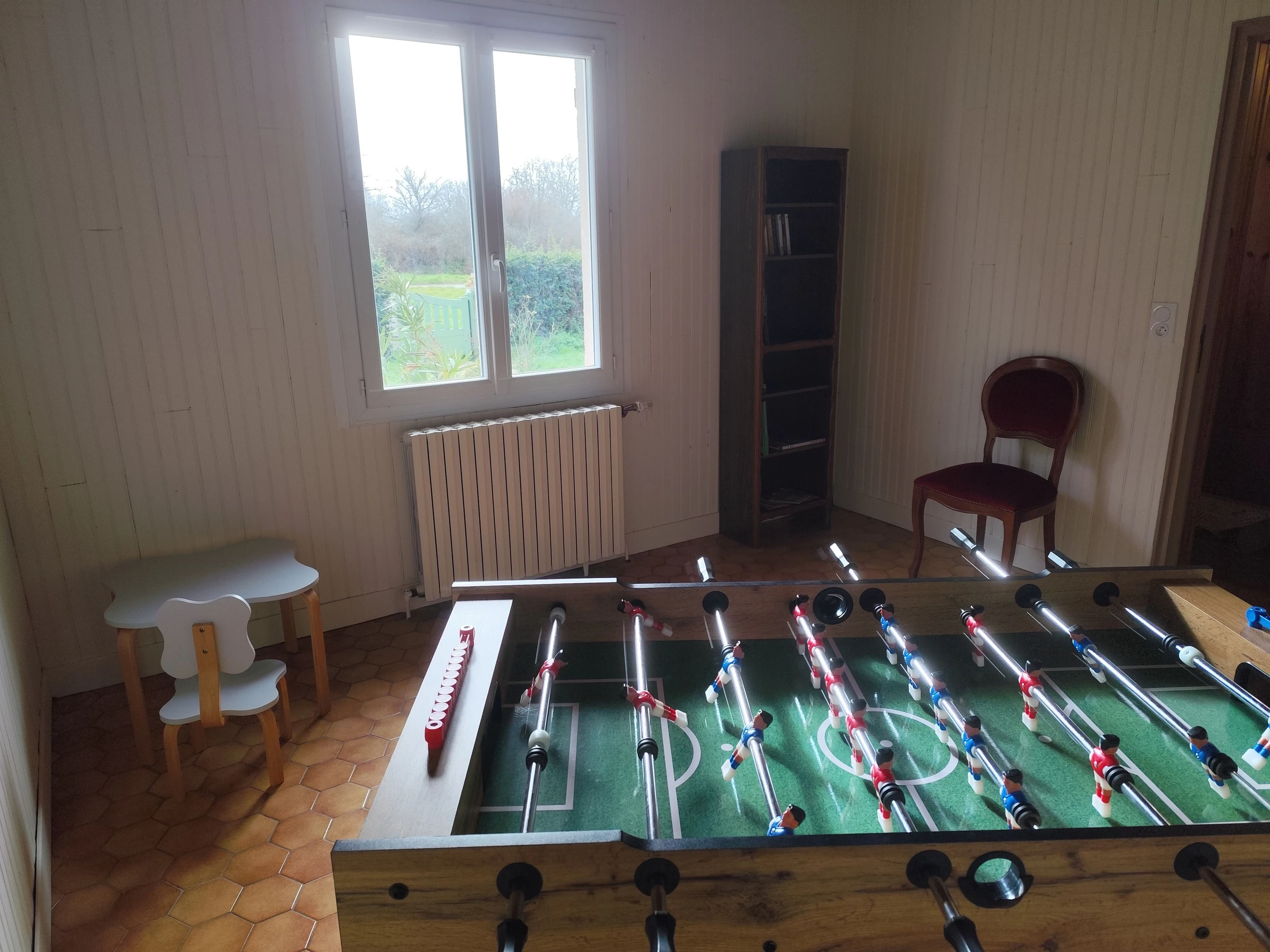 La pièce à vivre peut être adaptée pour une salle de réunion ou de formation pouvant accueillir à la journée environ 10 / 12 personnes. De plain pied, entrée, pièce à vivre avec cuisine, salon, salle à manger, une salle d'eau, deux chambres avec un lit 2 personnes (140 x190 cm) et une chambre avec un lit 2 personnes (160 x 200 cm), une pièce avec coin lecture jeux et baby-foot, wc, garage avec la possibilité de garer une voiture.