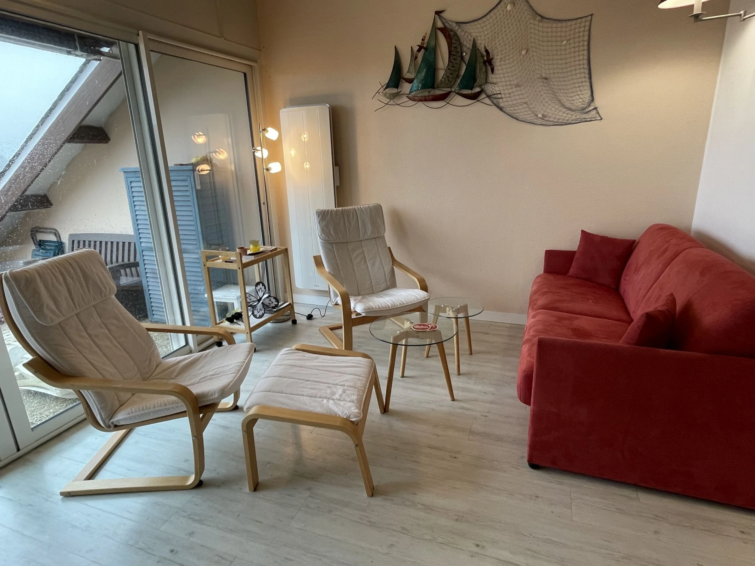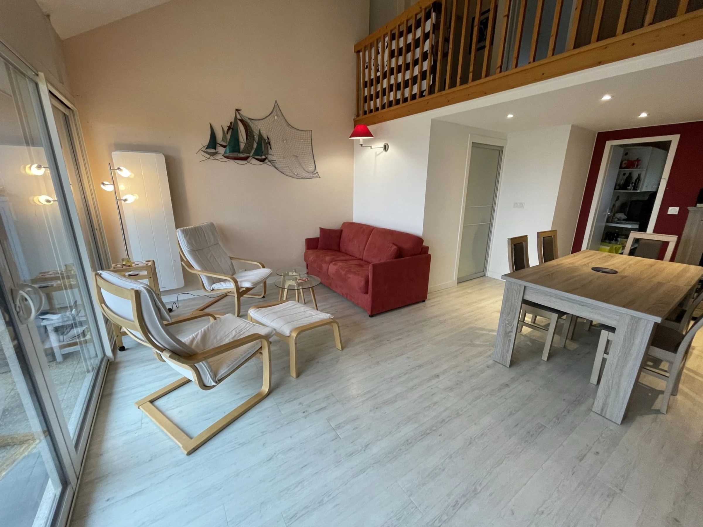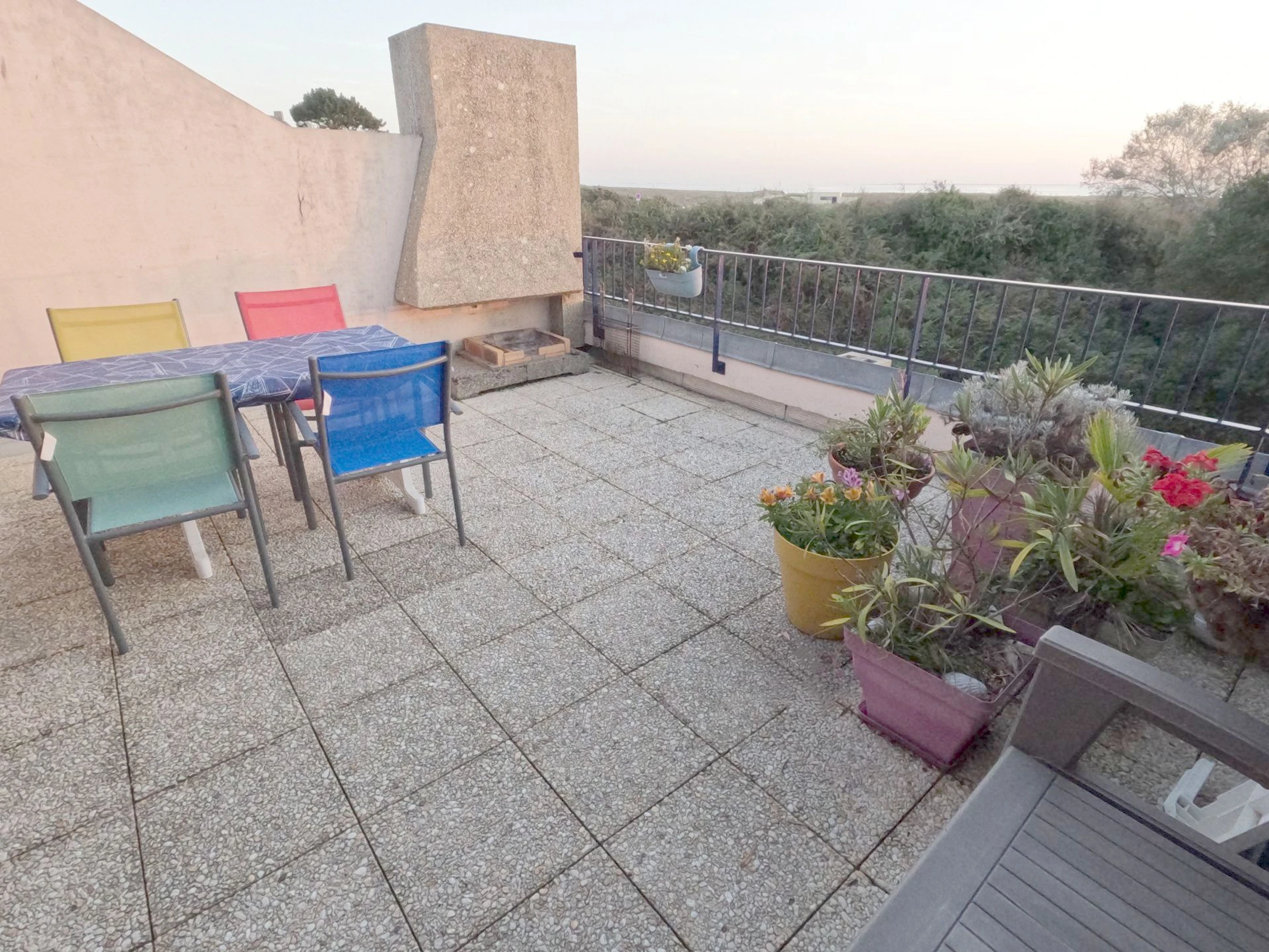 Bel appartement en duplex de type T4, rénové, situé au rez-de-chaussée et comprenant : entrée, salle de douche avec toilettes et lave-linge (2 kg), séjour-salon avec TV et canapé-lit donnant sur grande terrasse avec des aperçus mer, cuisine équipée et aménagée ( four, micro-ondes, lave-vaisselle, plaque induction avec 3 feux, réfrigérateur avec compartiment congélateur, cafetière électrique à filtres).
