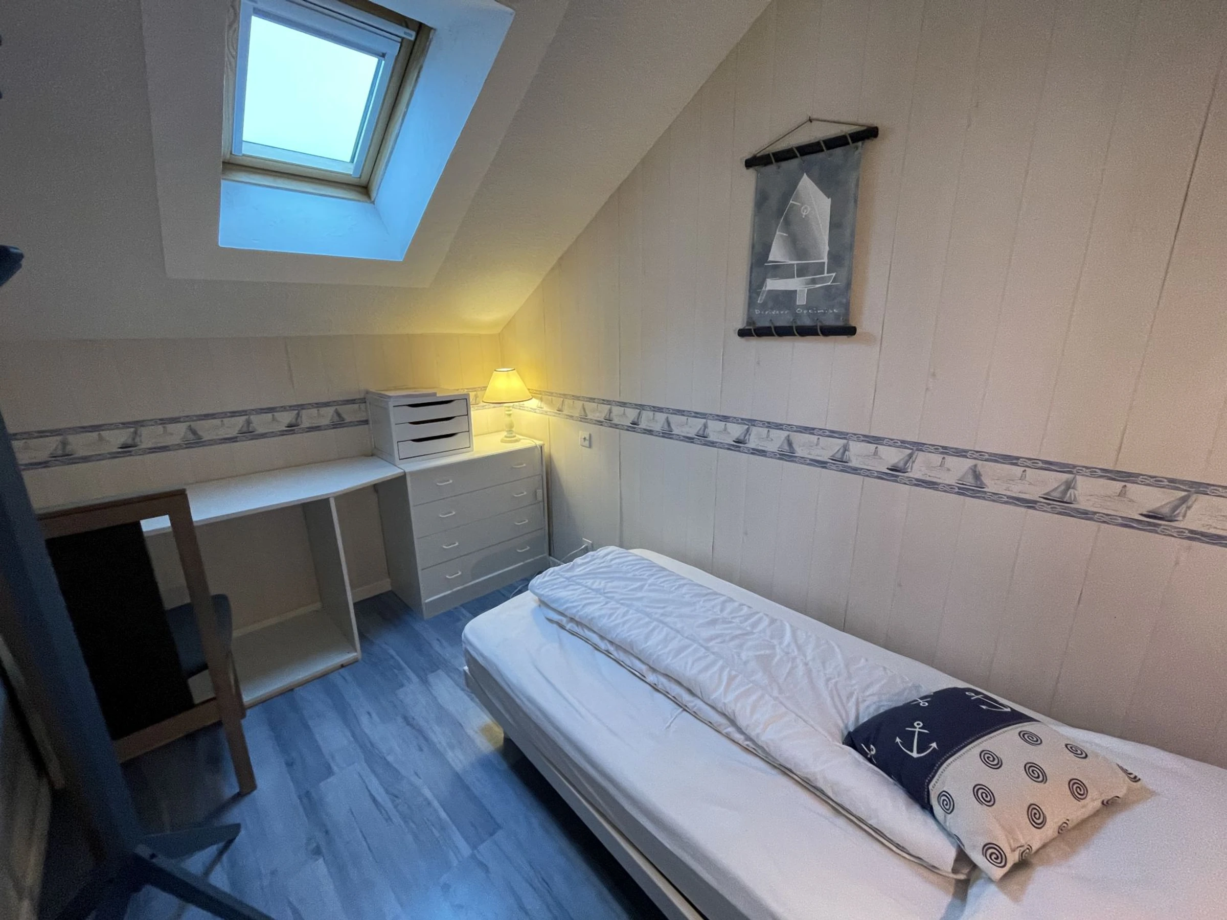A l'étage : palier avec armoire et placard (étagères et penderie), 1ère chambre (1 lit 160) avec placard (étagères et penderie), 2ème chambre (1 lit 90) avec commode et bureau, 3ème chambre (2 lits superposés soit 2X90) avec armoire (étagères et penderie), salle de bains avec toilettes. Mobilier de terrasse.