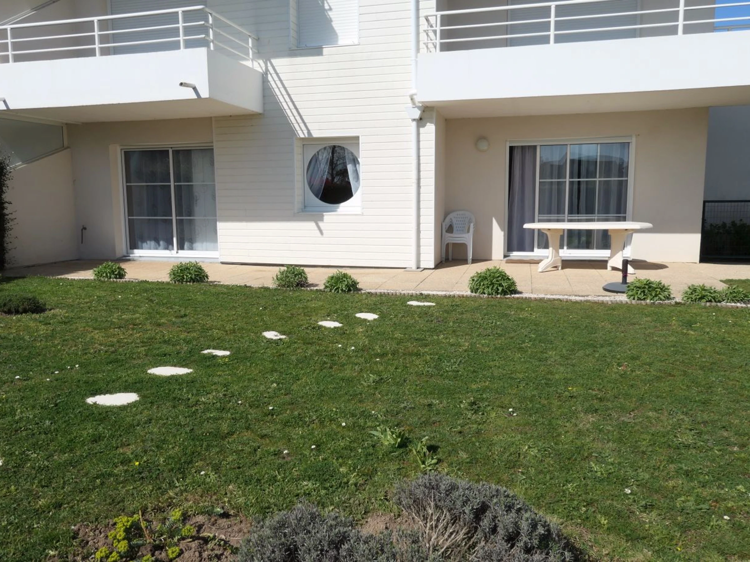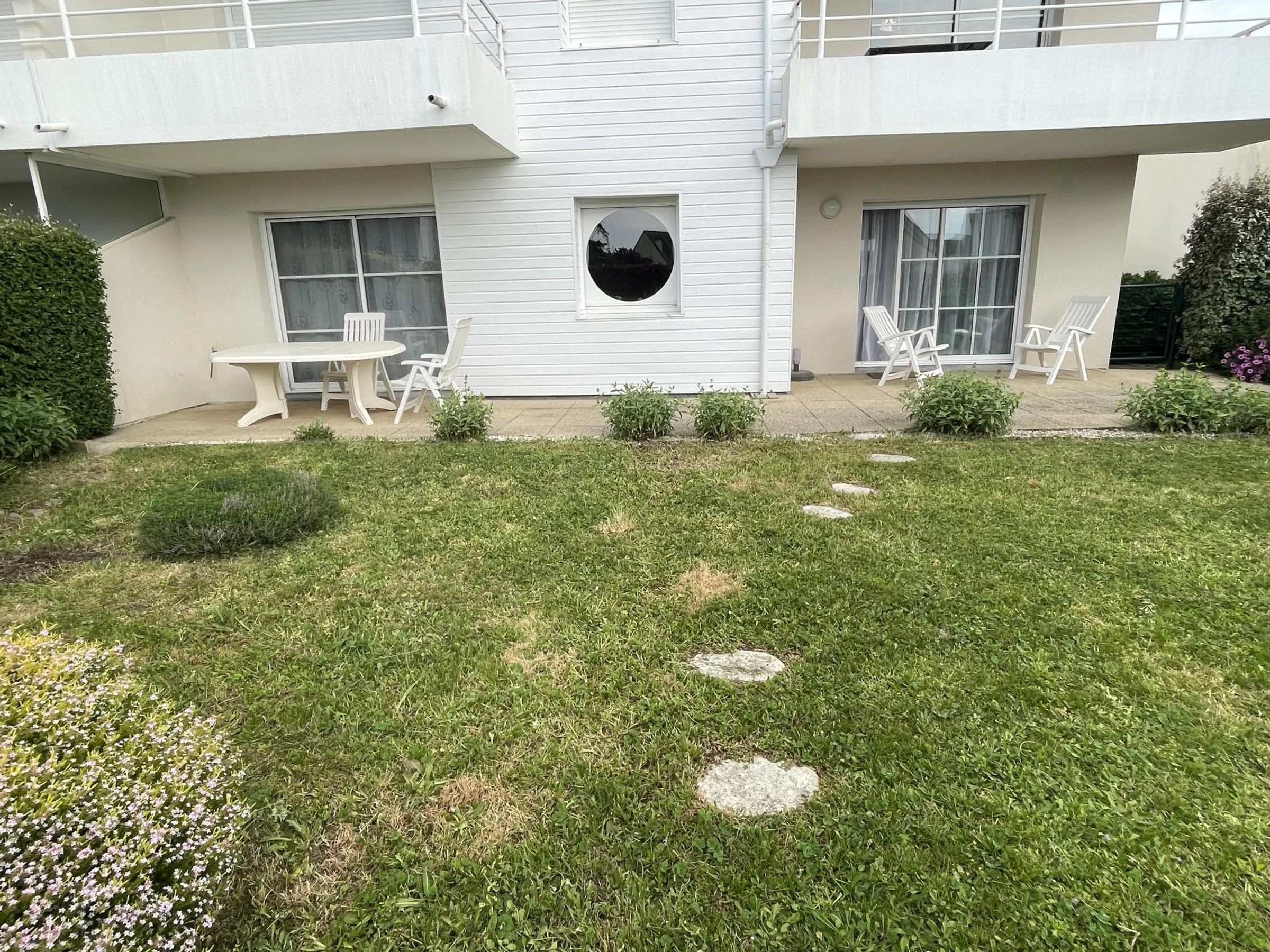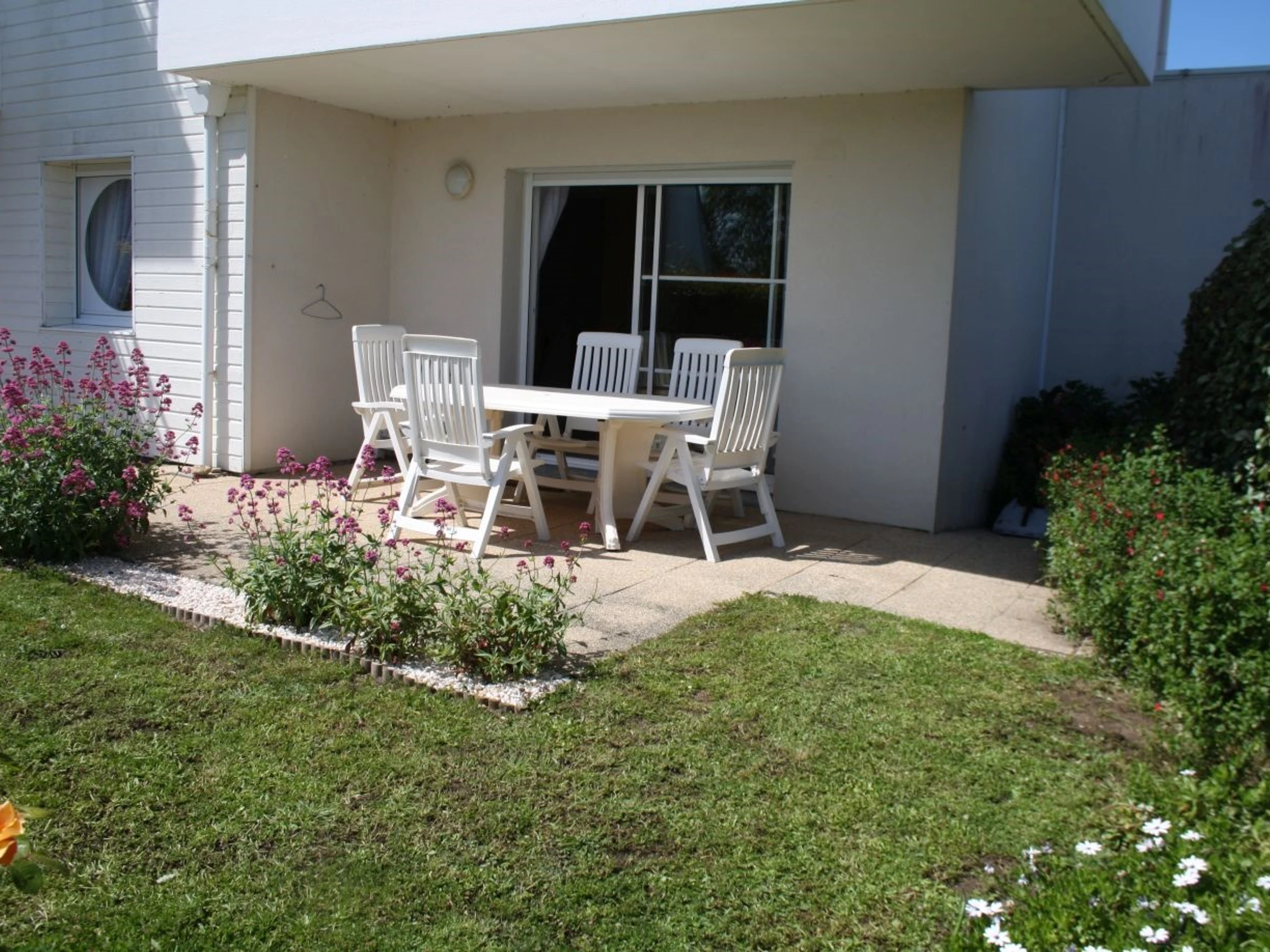 Jardin clos avec terrasse et mobilier de jardin.