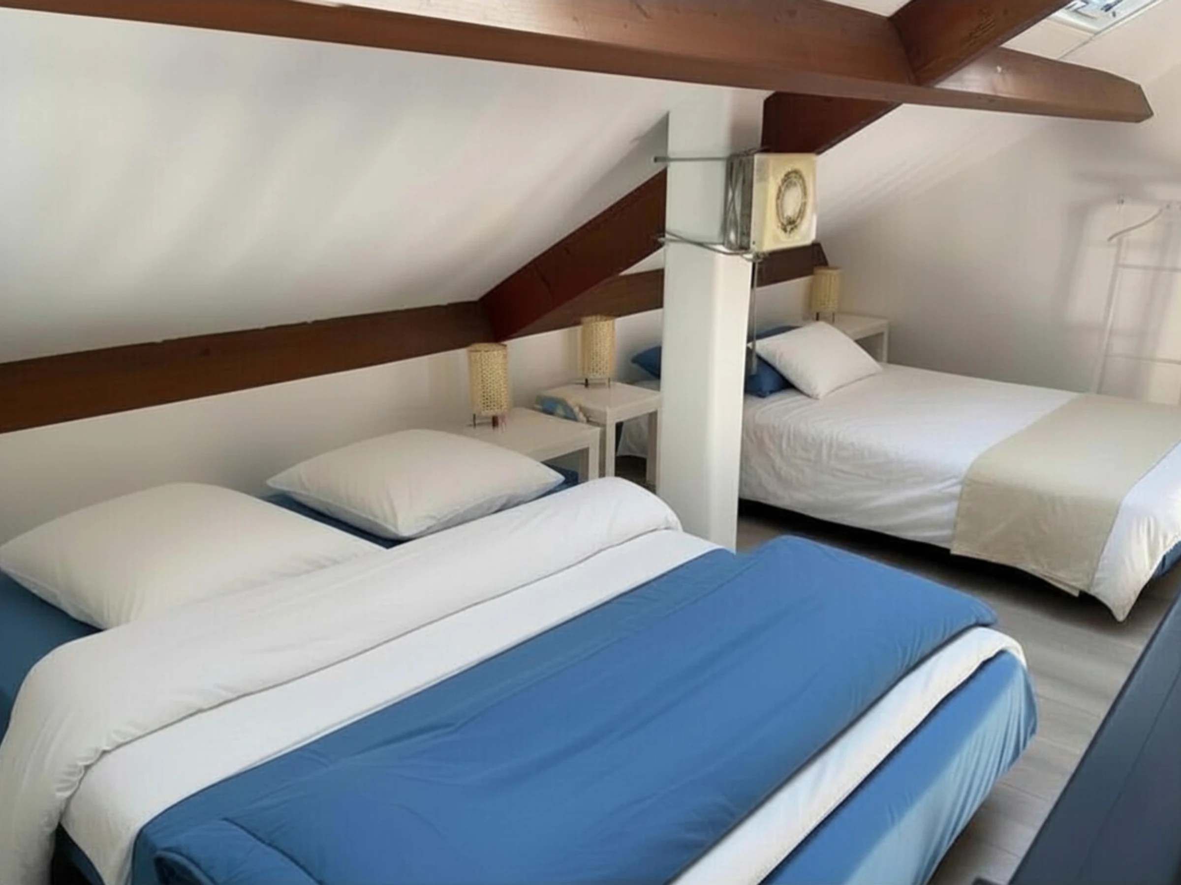 L’appartement peut accueillir jusqu’à 6 personnes. Il dispose d’une chambre avec un lit double (140 x 200) ainsi que d’une mezzanine aménagée avec deux lits doubles (140 x 200), offrant un espace de couchage confortable et convivial.