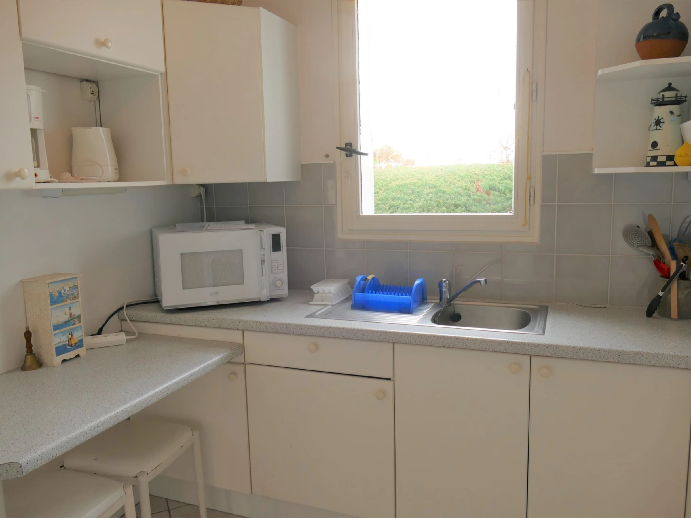 Entrée, séjour-salon (1 lit gigogne soit 2 lits 90) avec TV, chaine hifi, terrasse exposée au sud avec mobilier de terrasse, 1 chambre (1 lit 140) avec placard/penderie et salle de bains attenante, cuisine équipée (2 plaques vitrocéramiques, four électrique, réfrigérateur/petit congélateur, micro-ondes, lave-linge, cafetière électrique), toilettes. Parking aérien n° 2. ANIMAUX : uniquement les petits