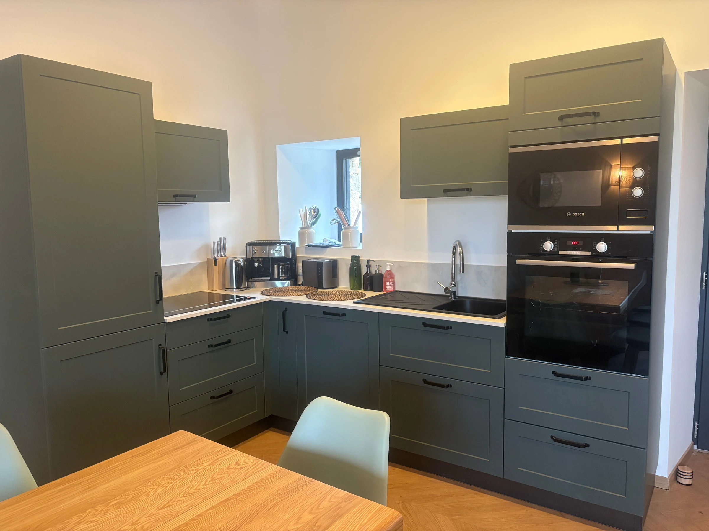Équipement : Réfrigérateur/congélateur, plaques de cuisson (4 feux induction), four et micro-ondes, lave-vaisselle, lave-linge / sèche-linge – poêle à bois, vaisselle, machine à café, bouilloire, grille pain, télévision.