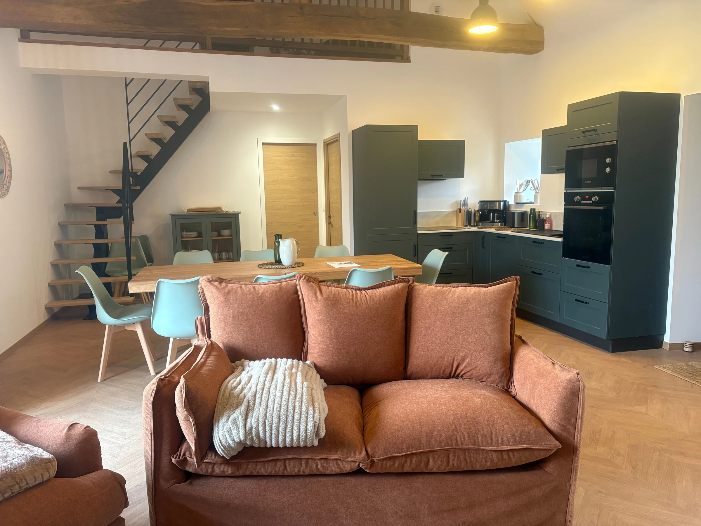 Au RDC: grande pièce de vie chaleureuse avec son espace salon et son poêle à bois, TV écran plat grand format, espace cuisine toute équipée, espace repas avec la grande table campagnarde.