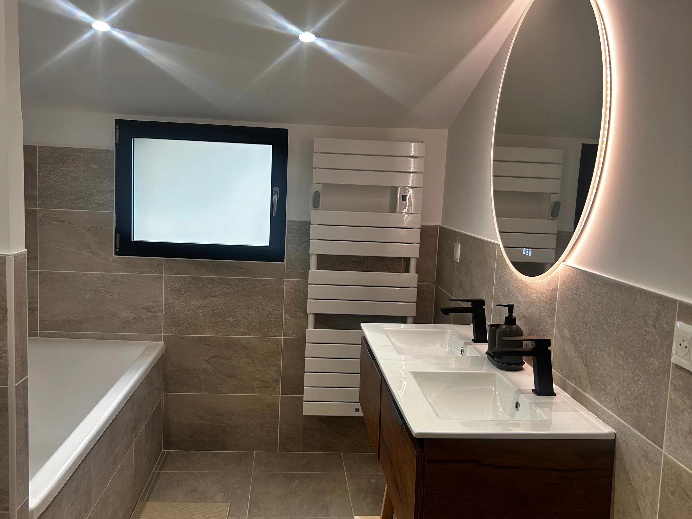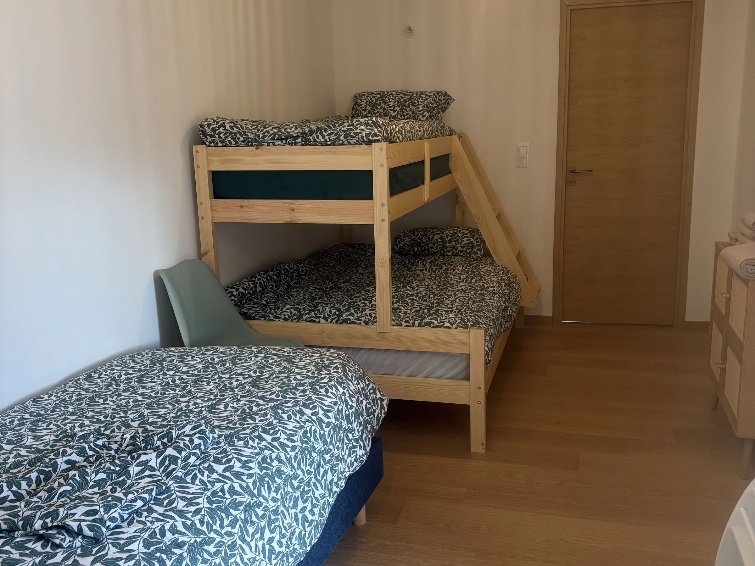 1 chambre avec 1 lit 140x200 et 2 lits 90 avec sa salle de bains privative (baignoire, douche et double vasque) et WC.