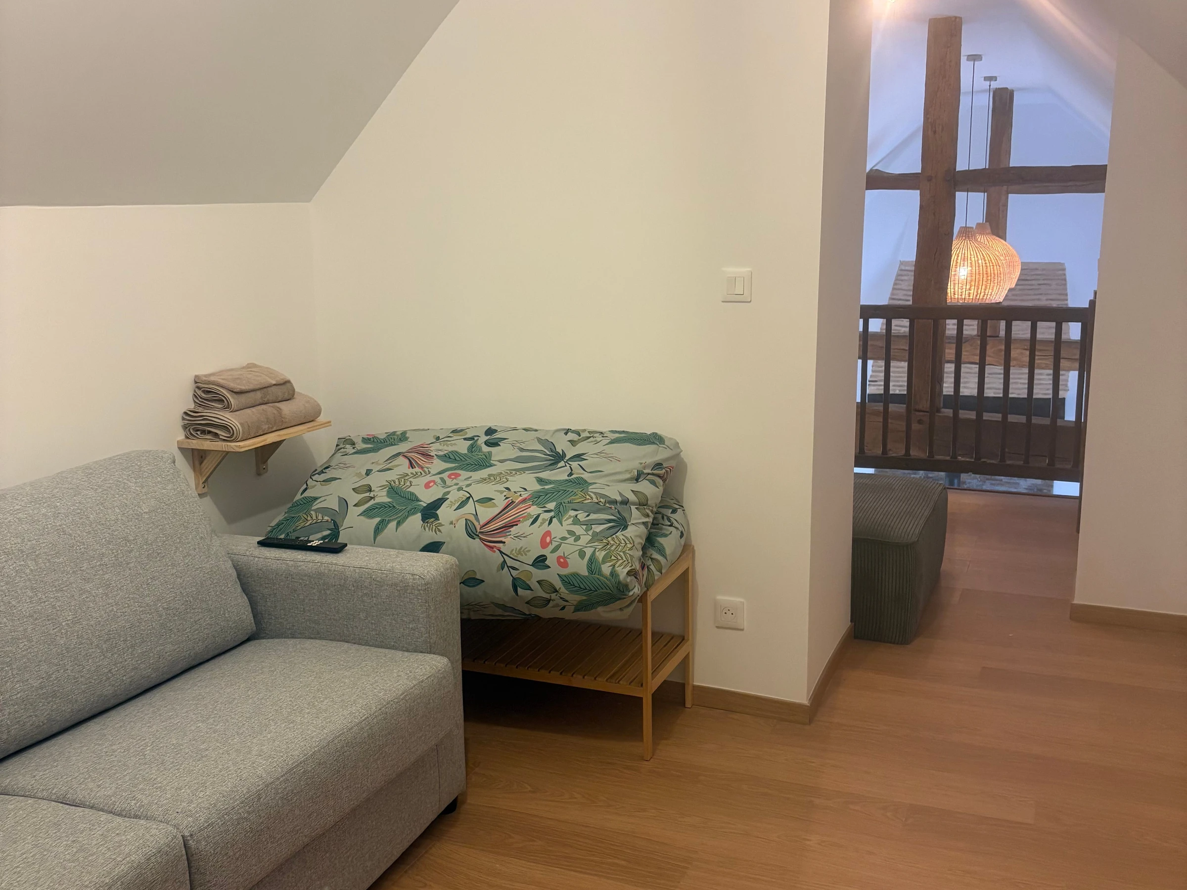 Accès l'étage de la pièce de vie: mezzanine avec espace salon, 1 chambre semi indépendante avec un canapé convertible de grand confort 140x200. Wc indépendant avec vasque.