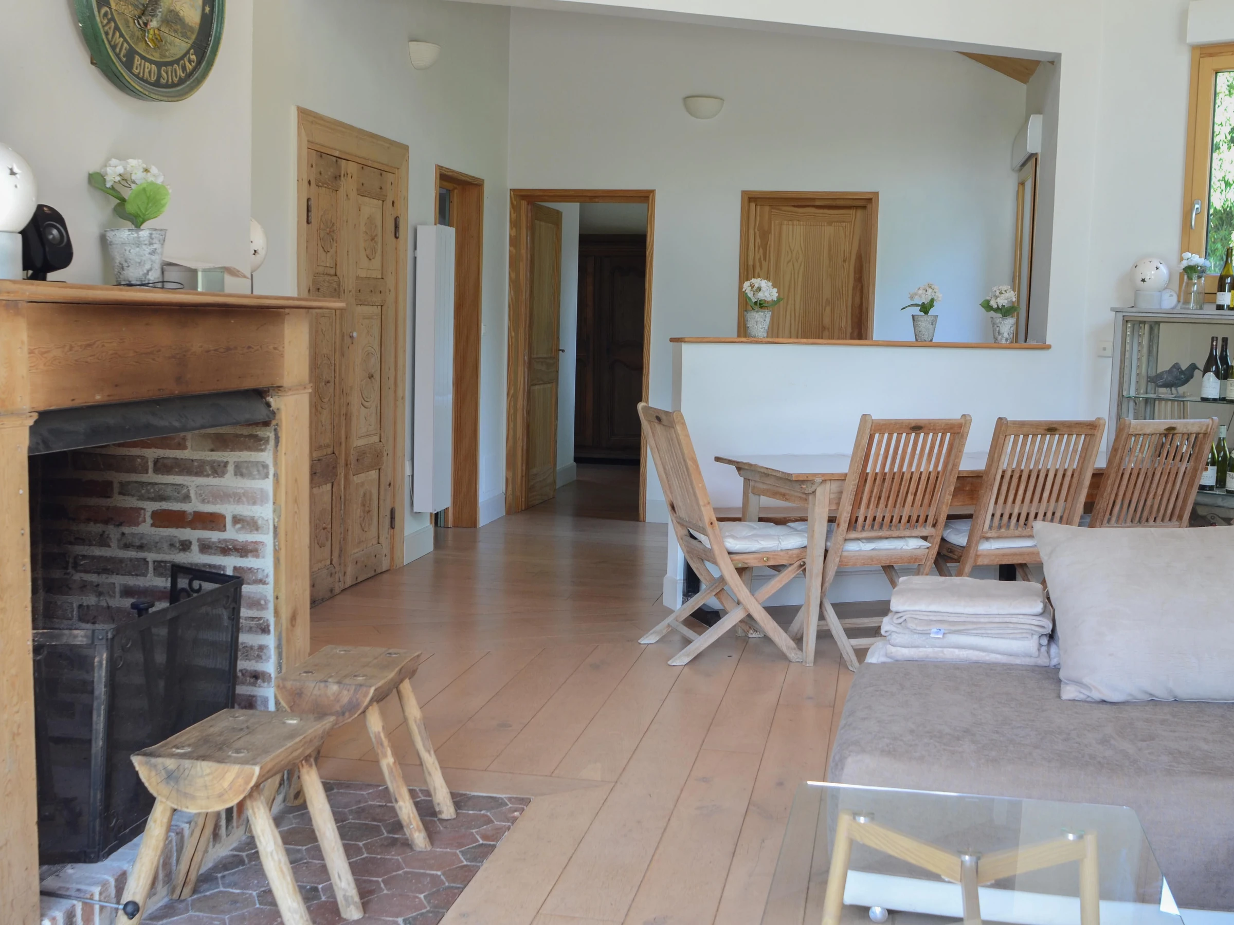 Grand séjour/salon avec cheminée, cuisine parfaitement équipée.