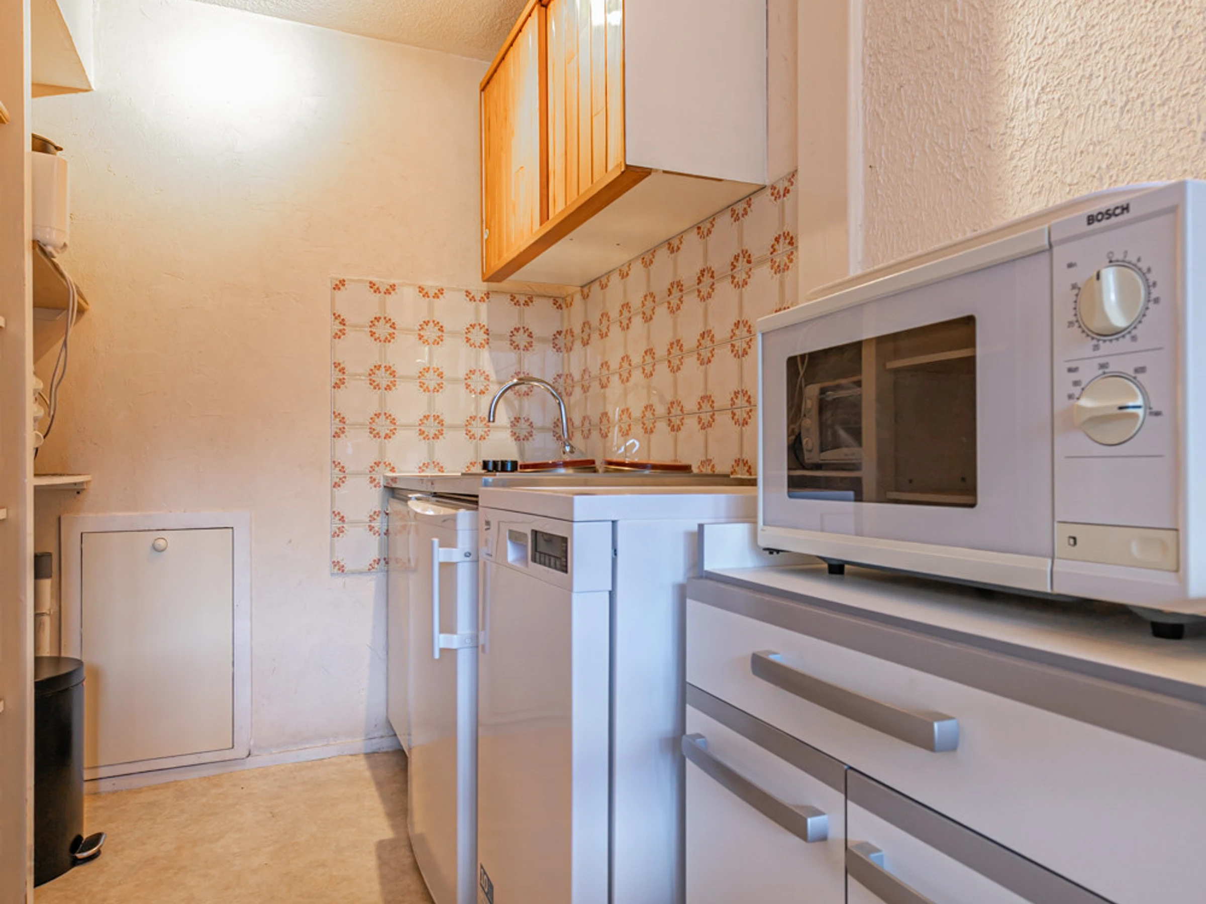 Réfrigérateur, plaques électriques, mini-four, micro-ondes, lave-vaisselle, TV.