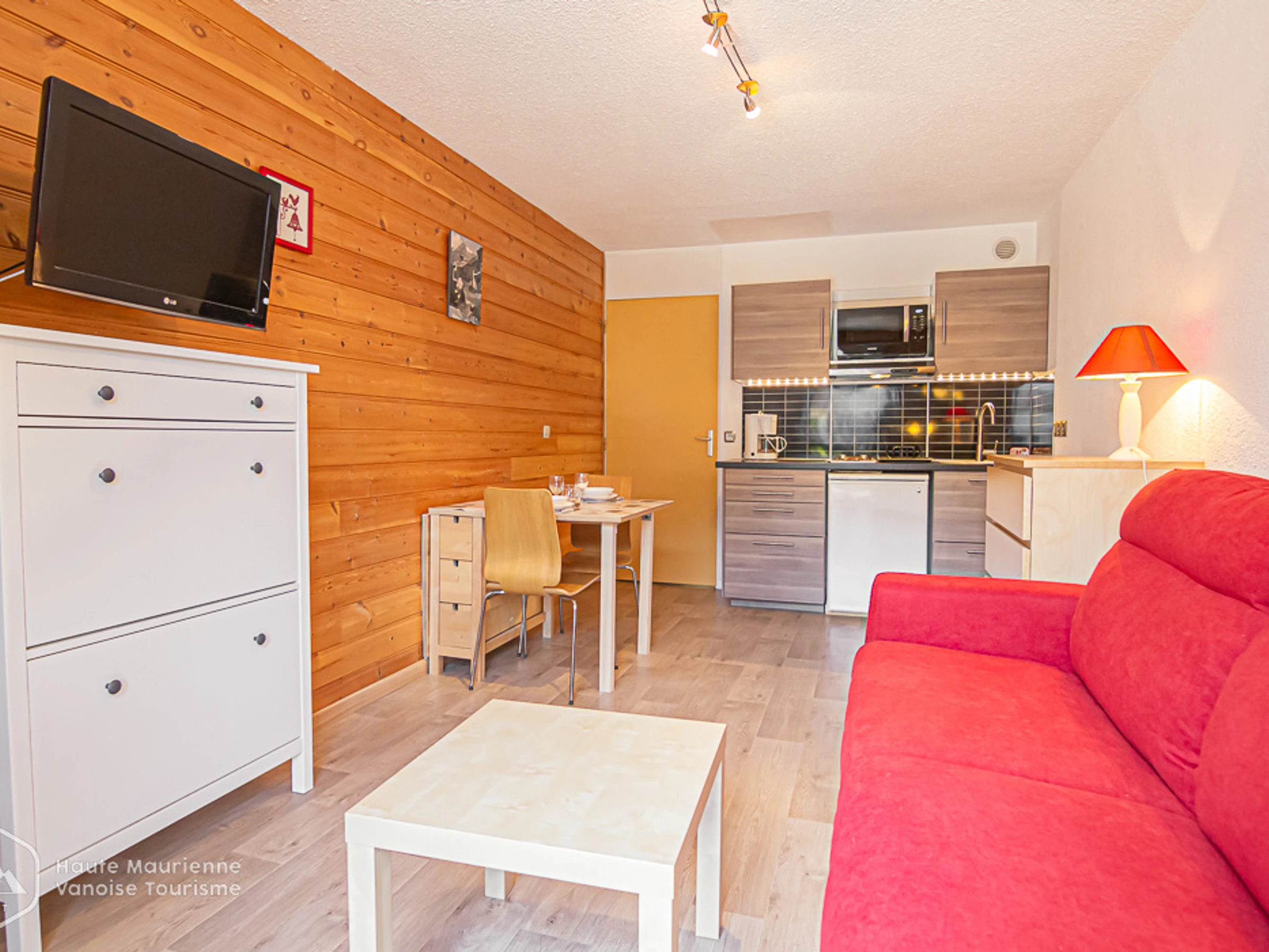 Cuisine/Séjour : Réfrigérateur, plaques électriques, mini-four, micro-ondes, TV