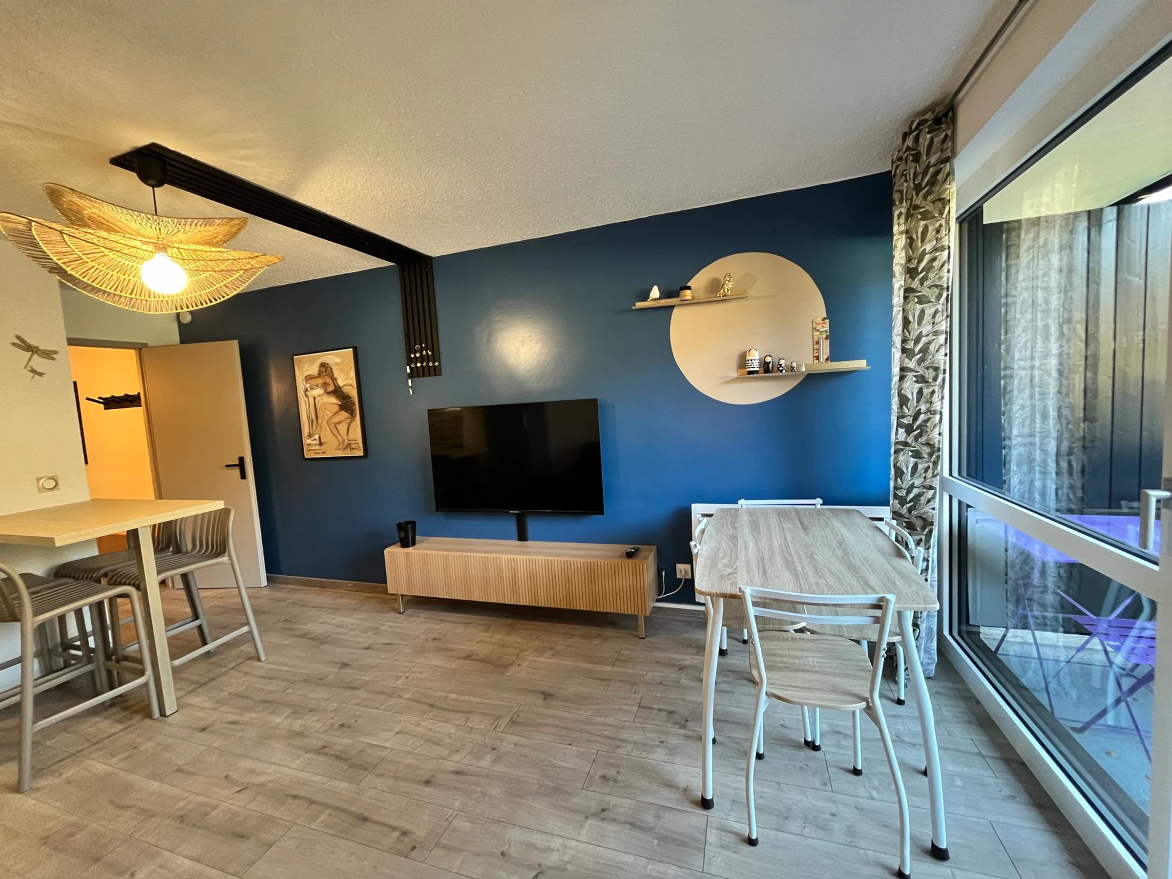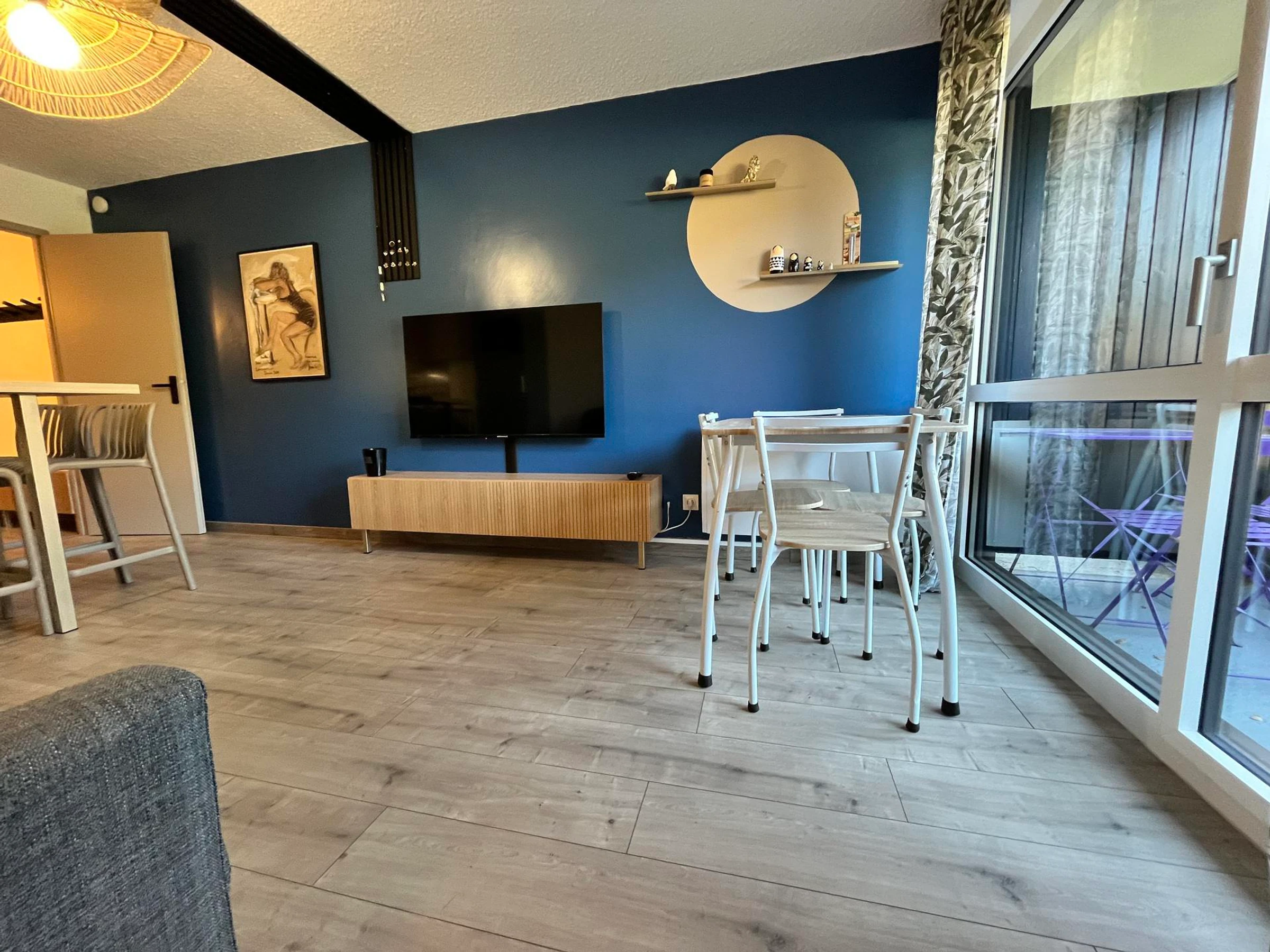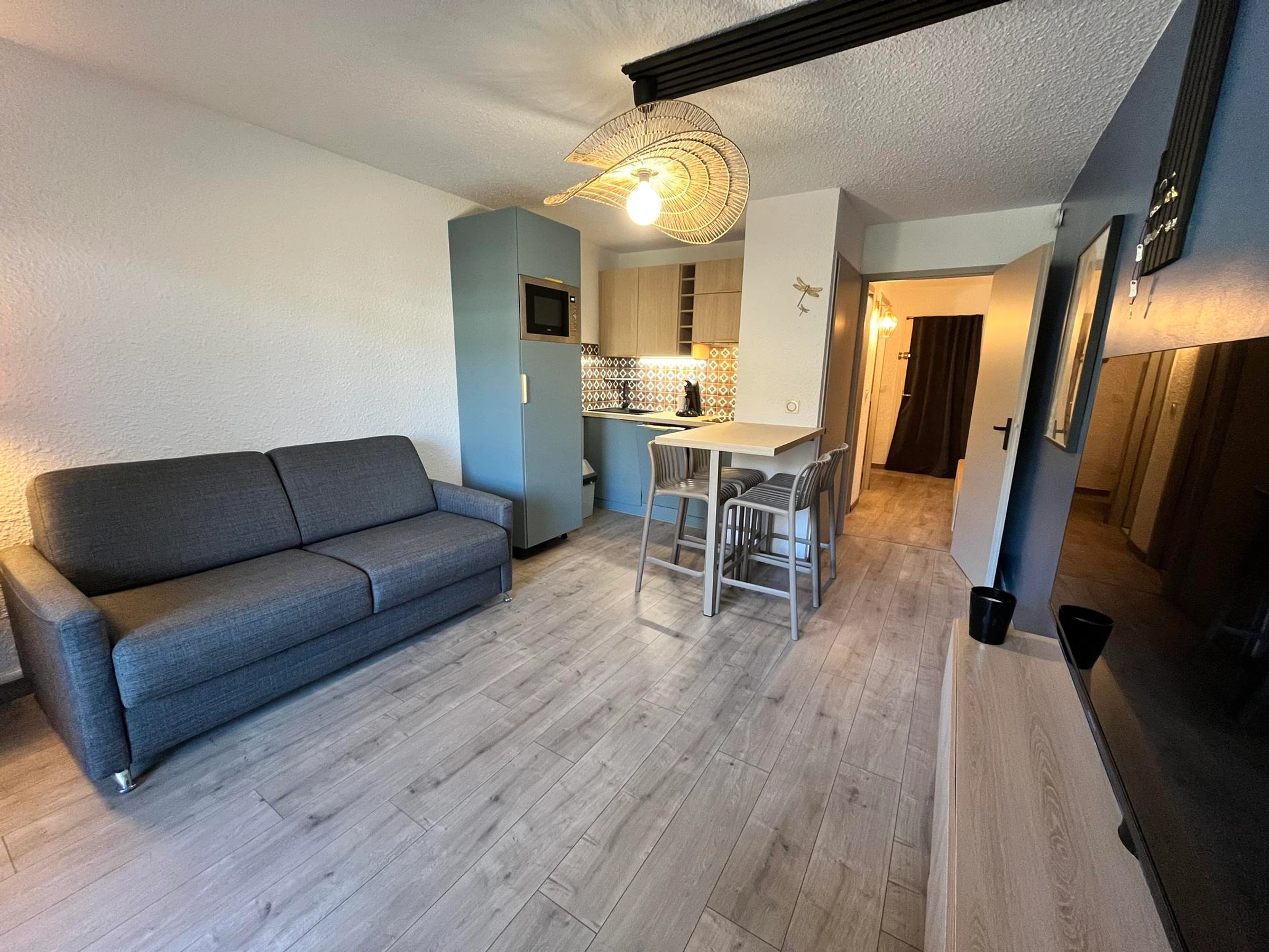 Un séjour lumineux ouvrant sur un balcon exposé ouest, équipé d’un canapé lit convertible (140 cm)