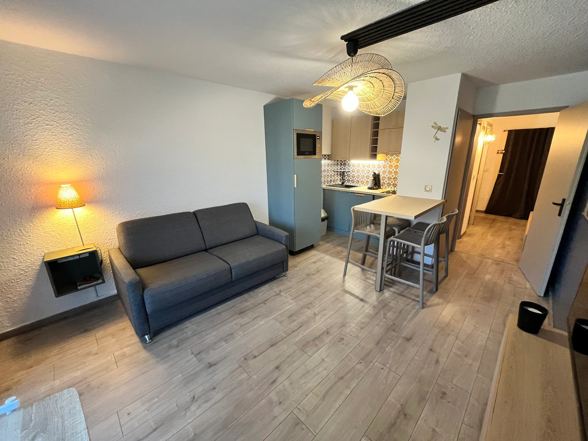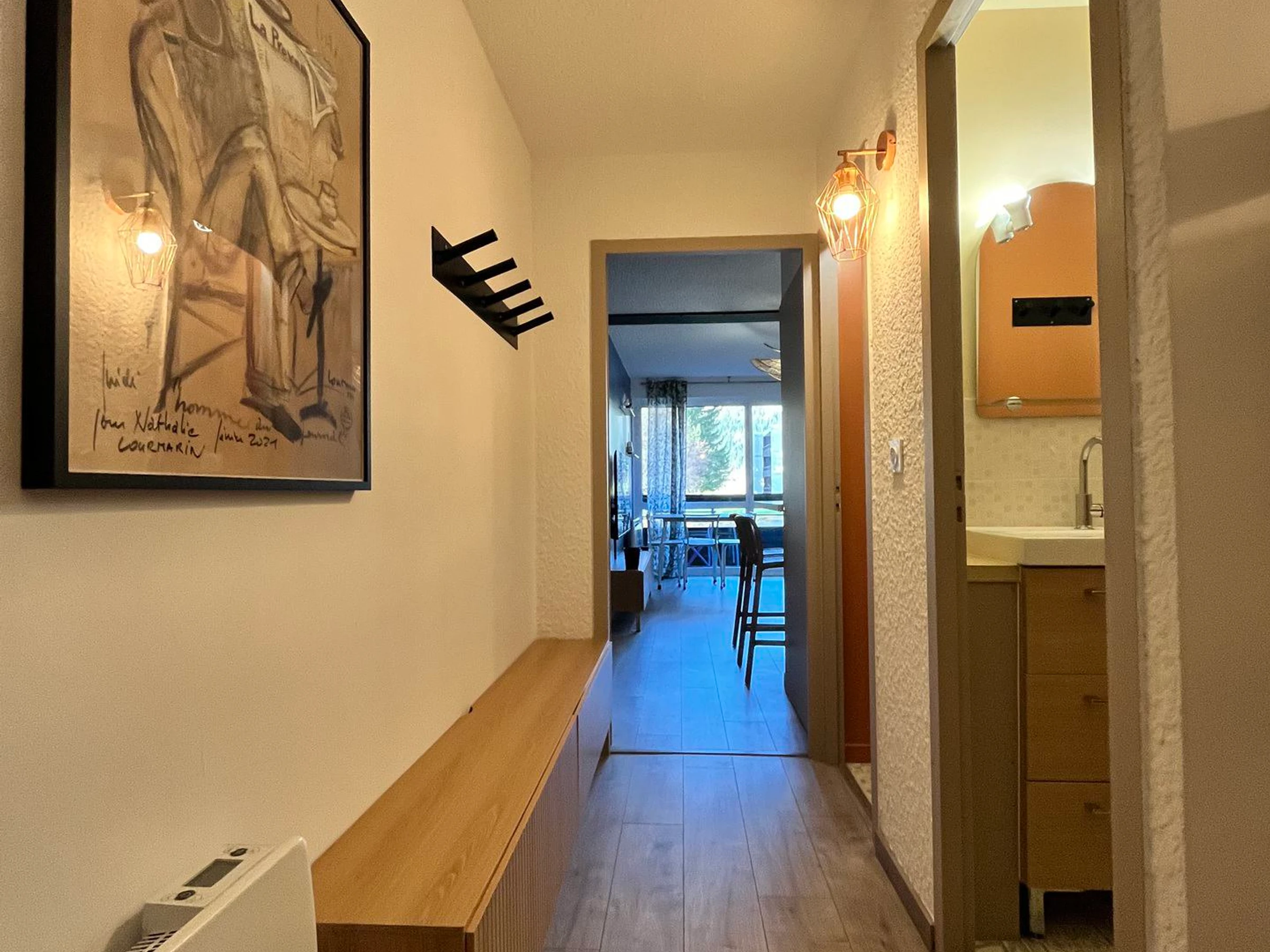 Studio cabine entièrement rénové de 28 m², situé en rez-de-chaussée d’une résidence calme à seulement 500 mètres du centre du village, est l’endroit parfait pour une escapade à la montagne en couple, en famille ou entre amis