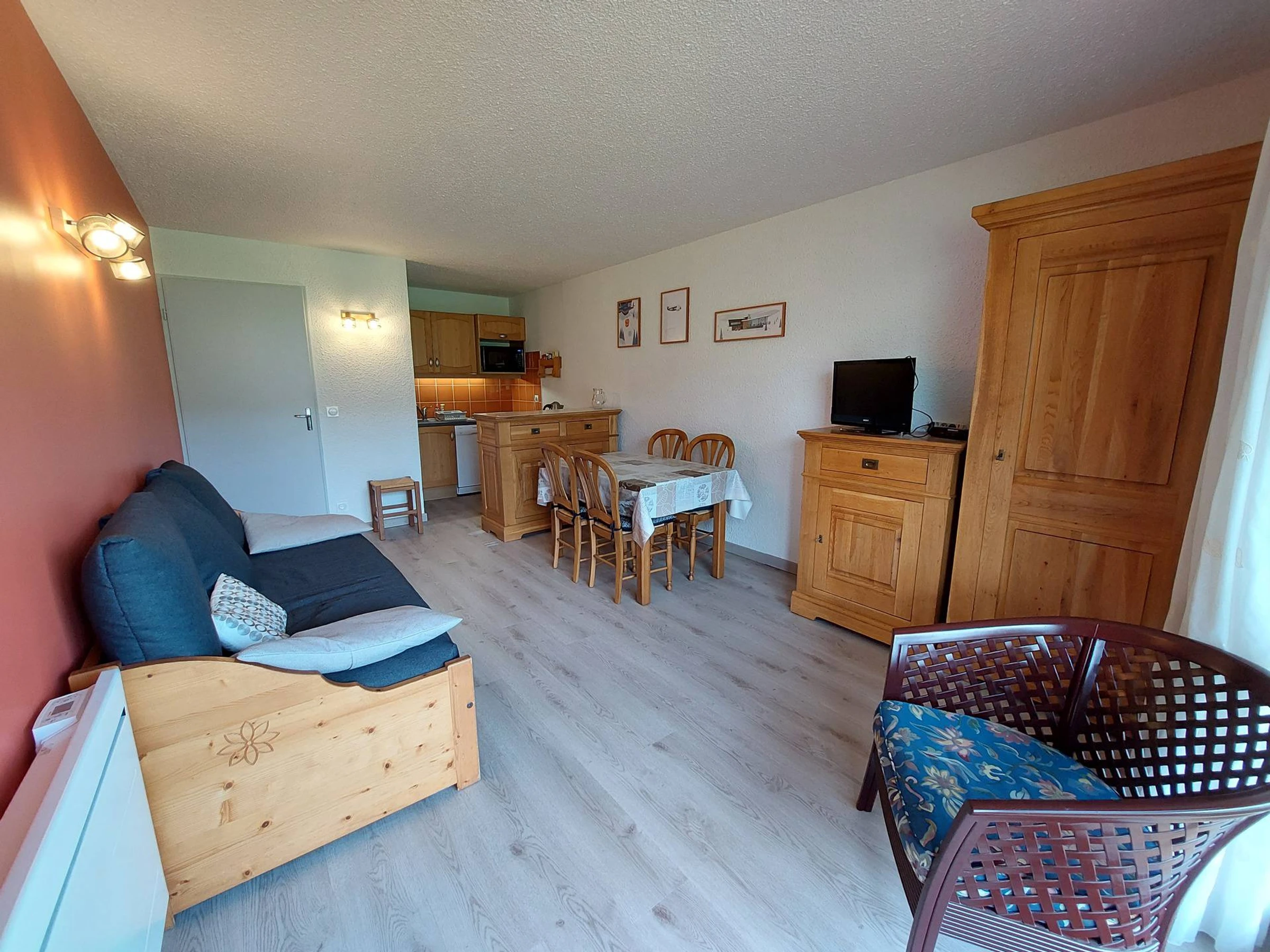 Dès l'entrée, vous découvrez un séjour accueillant avec un canapé doté de lits gigognes, offrant deux couchages confortables. Une télévision et un poste radio complètent cet espace de détente, propice aux soirées cocooning après une journée sur les pistes.