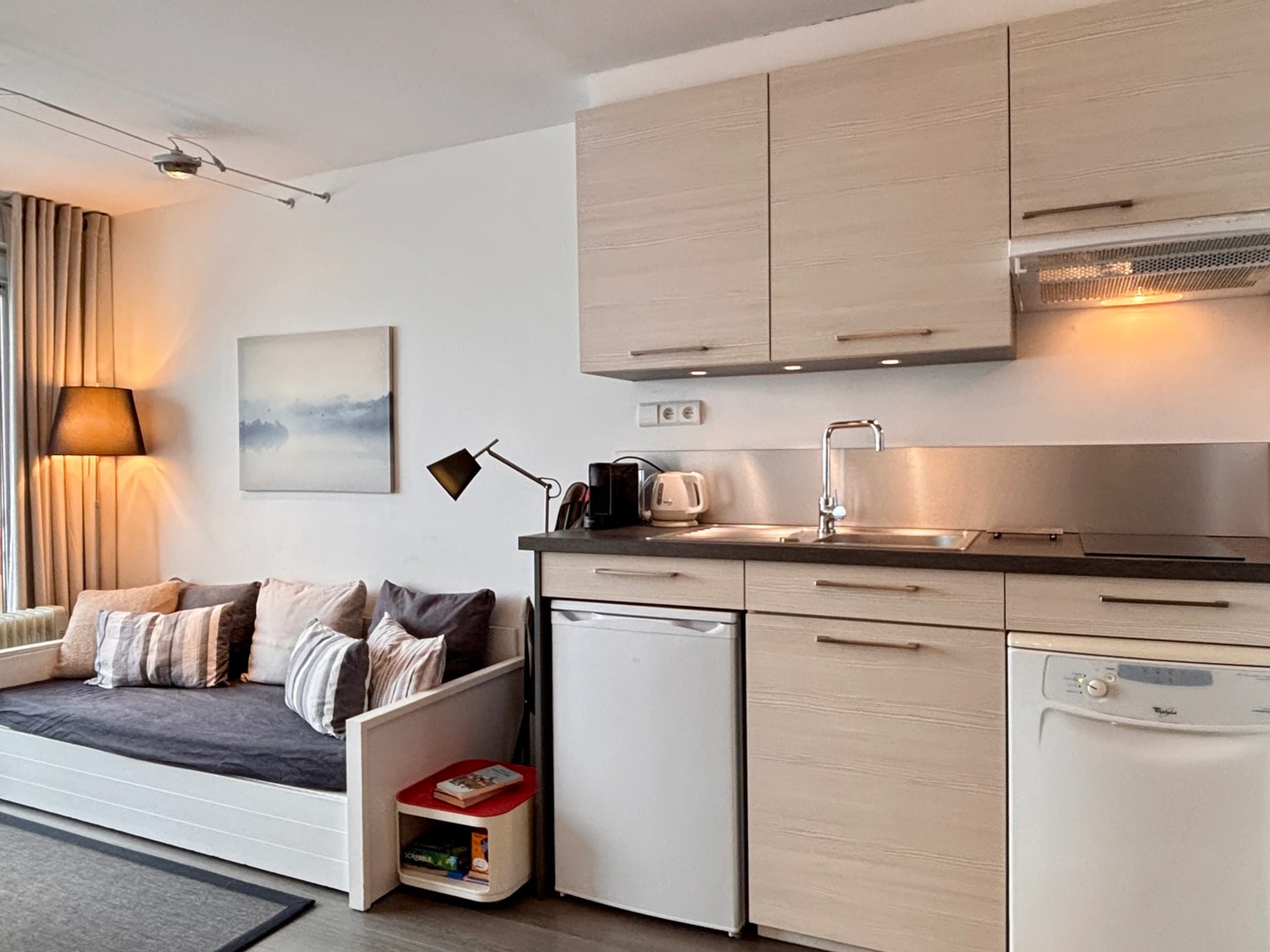 - Une Kitchenette entièrement équipée : plaques de cuisson 2 feux, réfrigérateur, lave-vaisselle, micro-ondes, mini-four, cafetière, bouilloire, grille-pain, etc...