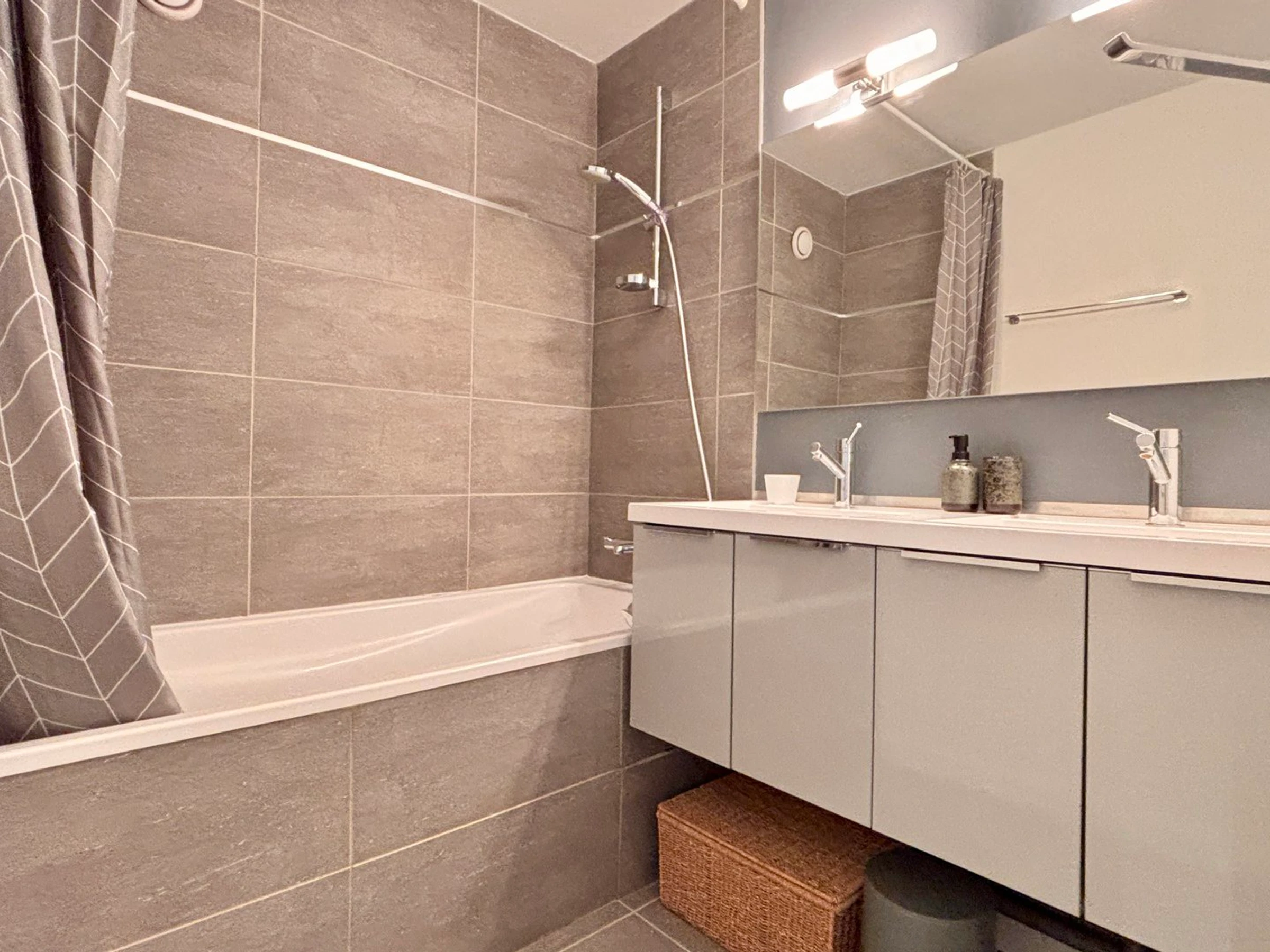 - La salle de bains avec baignoire et double vasque, sèche-cheveux.