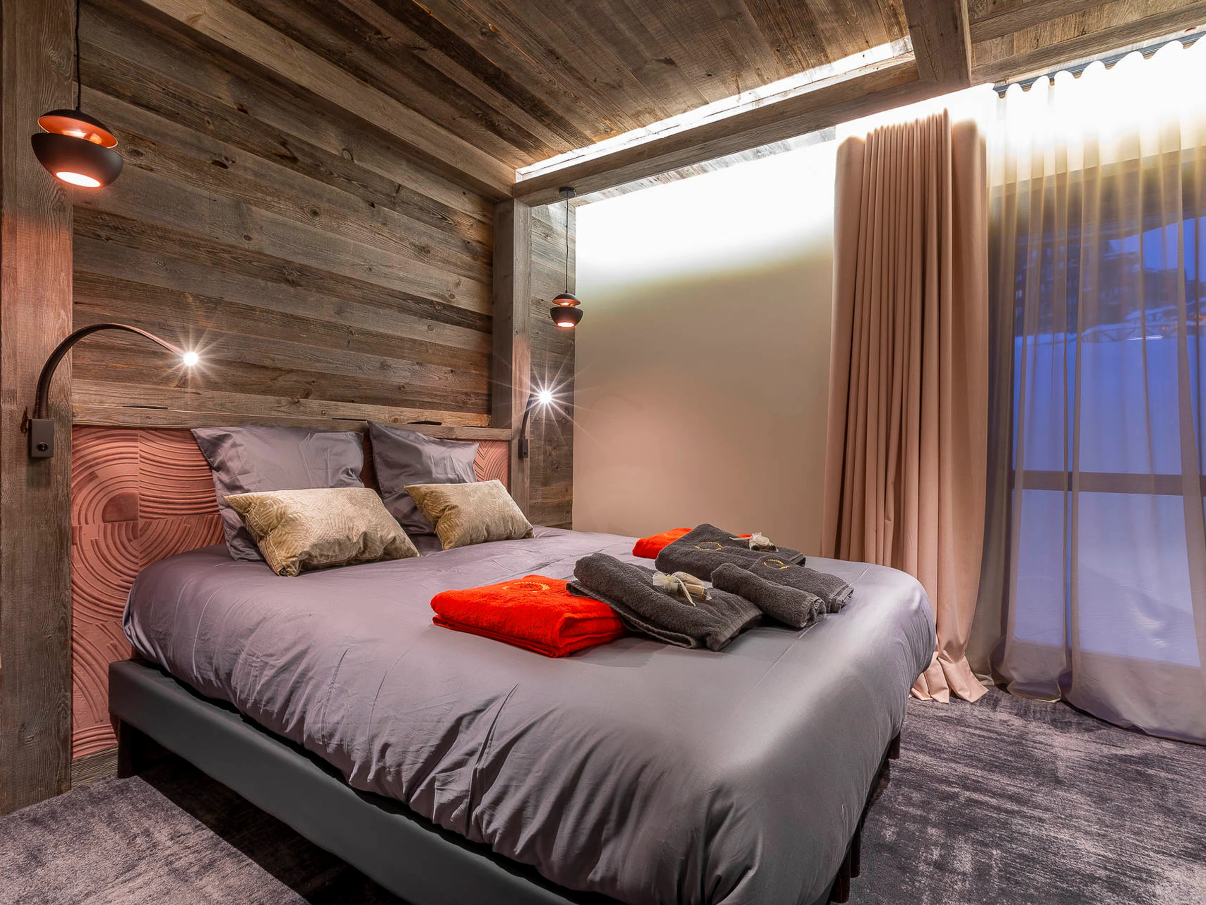 L’intérieur est pensé comme un refuge chic de montagne avec du bois rehaussé de matériaux contemporains tels le verre et l’acier. Le mobilier sélectionné par Nathalie de Breda fait appel à des accessoires, des revêtements muraux et des tissus principalement français et européens, le tout confectionné par des artisans locaux au savoir-faire irréprochable. Les espaces communs de plus de 400 m² rassemblent un ski room, une piscine, une salle de fitness, une salle de massage avec table de ressourcement à sable quartz et un hammam.