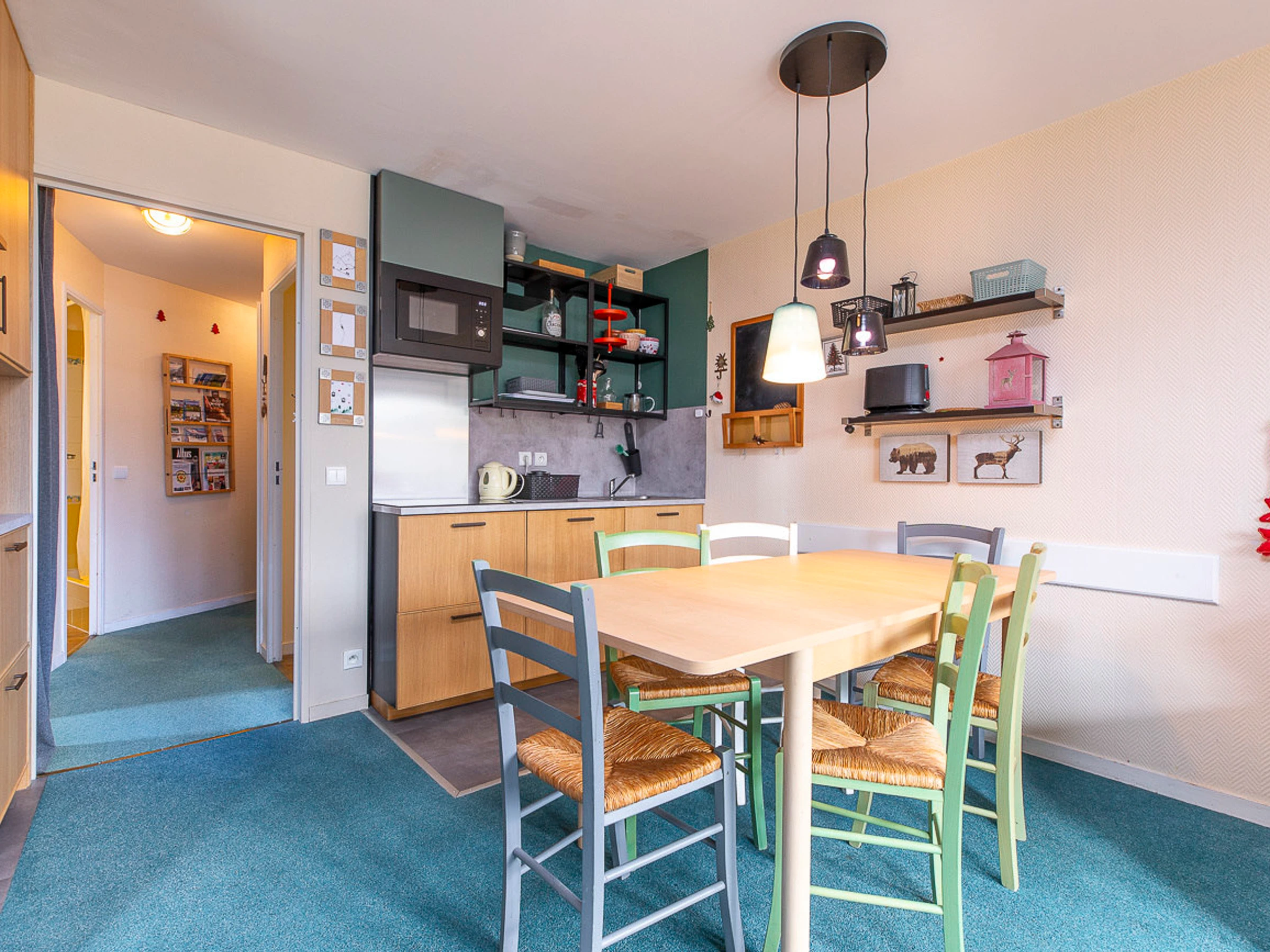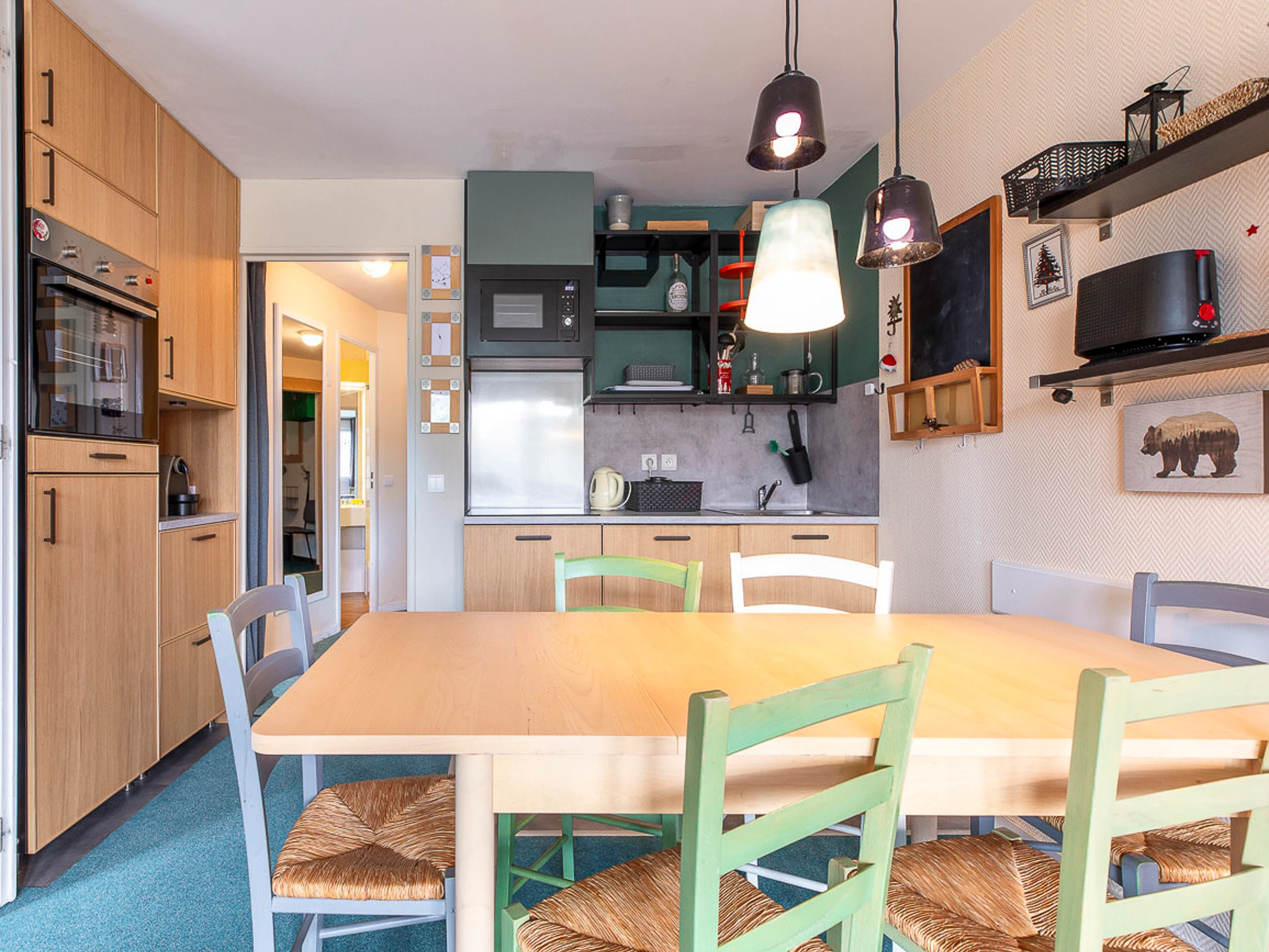 La pièce de vie se veut fonctionnelle avec un coin cuisine tout équipée (réfrigérateur avec freezer, four, micro-ondes, lave-vaisselle, plaques à induction, cafetière à filtre etc...) ainsi qu’un coin repas.