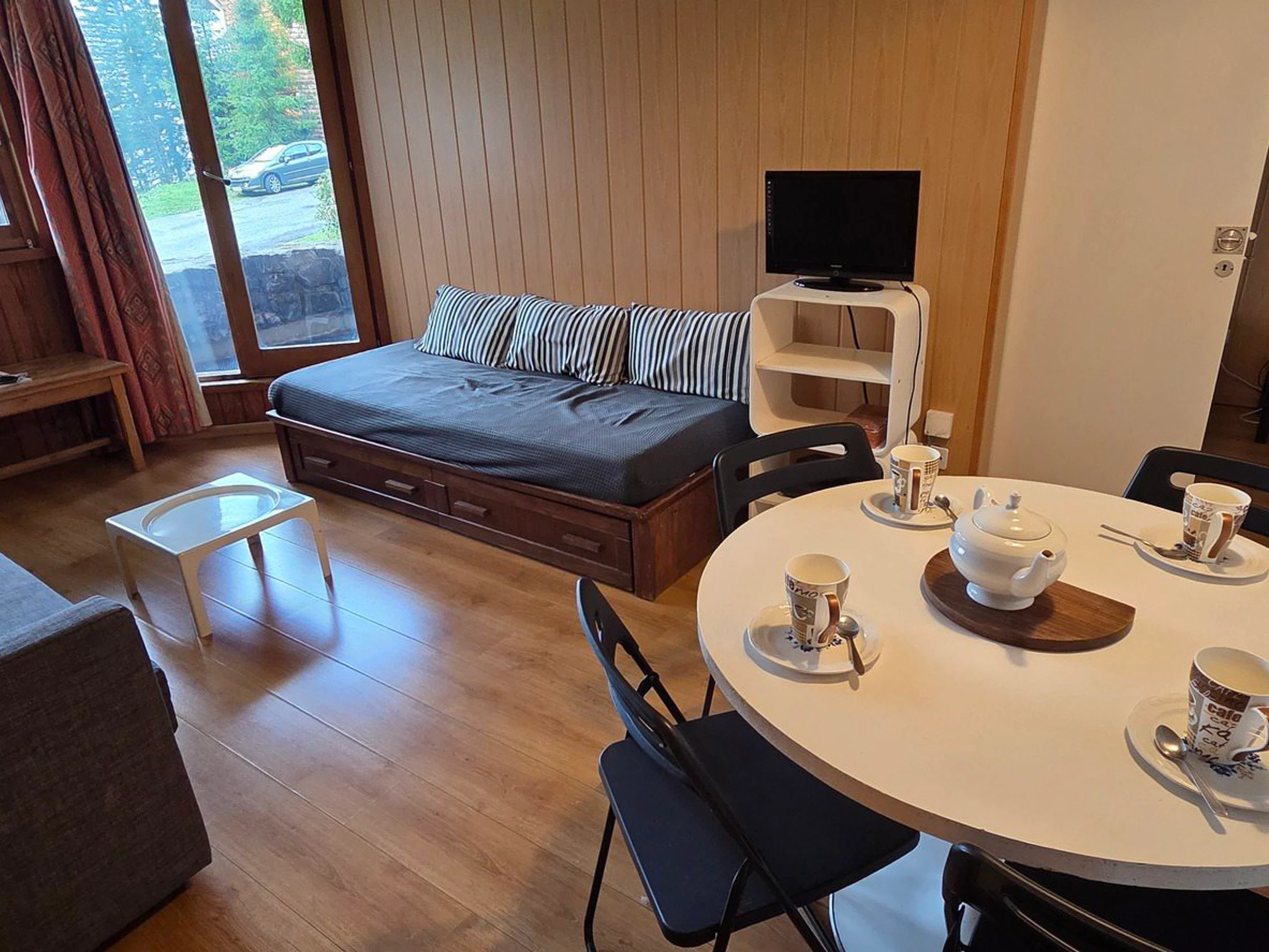 Séjour : avec le coin repas, un canapé lit de 2 personnes, une télévision et l'accès au balcon exposé sud ouest