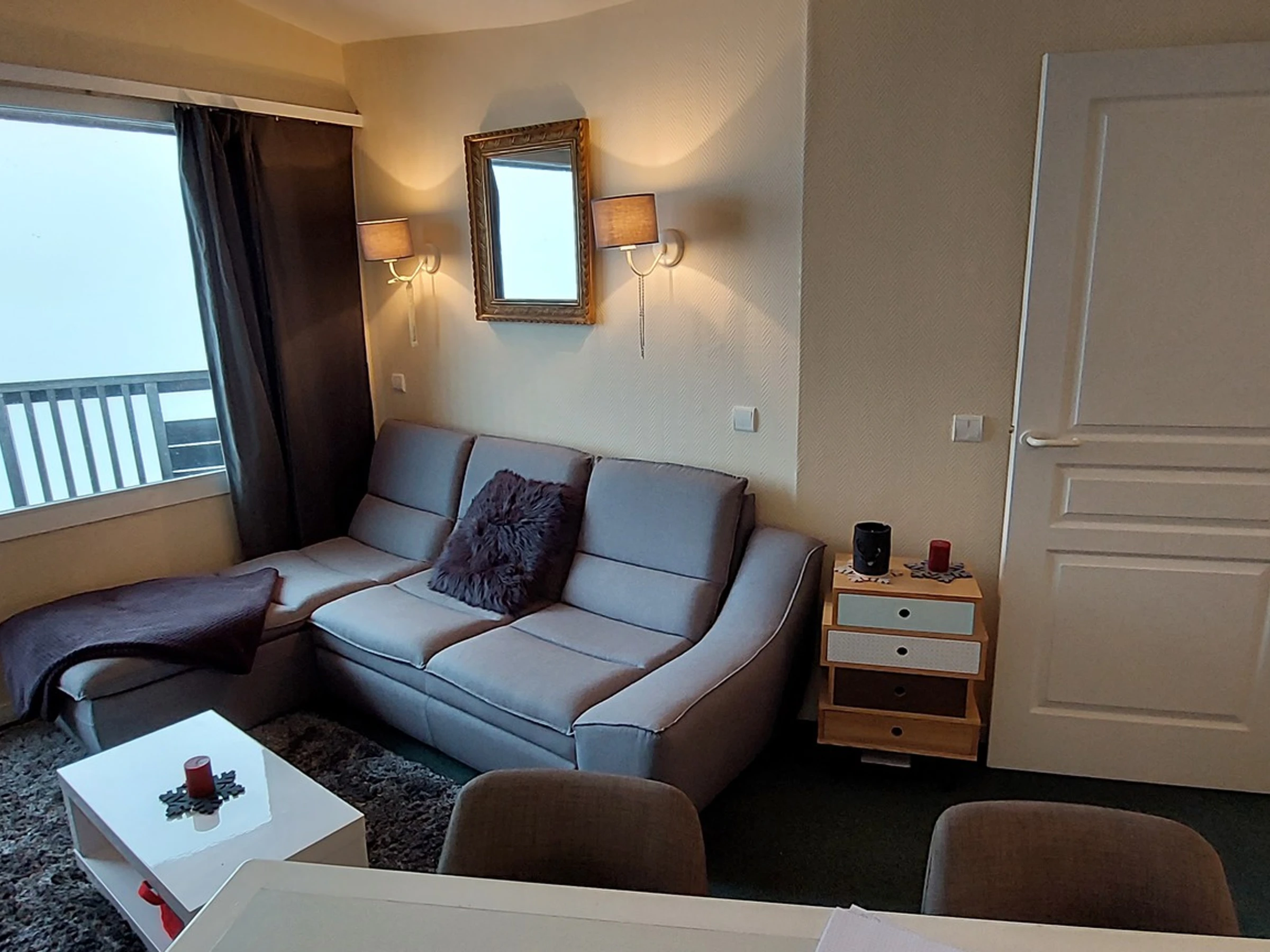 un canapé lit de 2 personnes et l'accès au balcon. Pas de télévision dans le séjour.