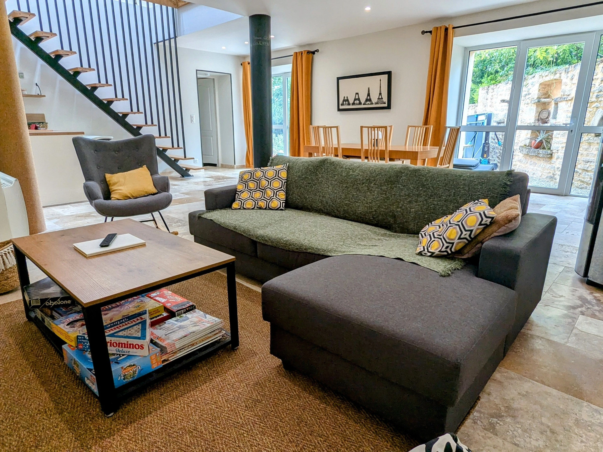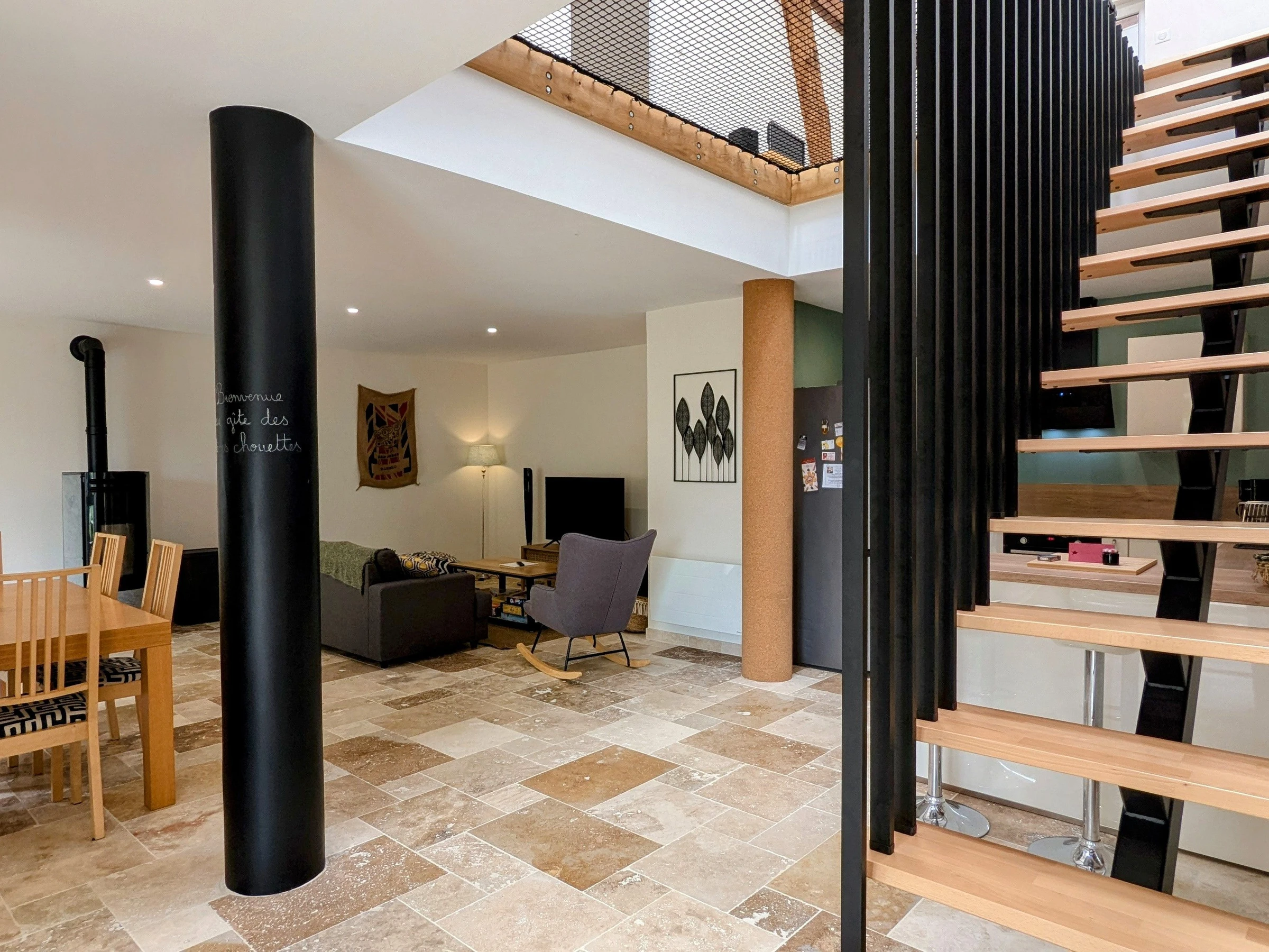 Dans un petit village calme, avec jolie vue dégagée, le "Gîte des 3 chouettes" vous offre : au rez-de-chaussée : cuisine équipée ouverte sur salon/salle à manger, poêle à granulés, TV, wifi, home- cinéma, une petite salle d'eau, un WC indépendant, une buanderie. A l'étage : 1 palier avec filet, nombreux jouets, livres pour enfants. TV avec playstation et jeux, 2 chambres avec chacune 1 lit de 160 cm + 1 chambre avec 1 lit de 160 cm et salle d'eau privative avec WC, une grande salle de bain à partager avec baignoire + douche et WC. Lit bébé + chaise haute à disposition. Nombreux jeux de société, jeux et jouets à disposition. A l'extérieur : grande cour avec table de pic-nic, parasol, plancha. Terrain de pétanque. Grand jardin arboré avec très belle vue dégagée. Transats. Parking privé dans la cour fermée.