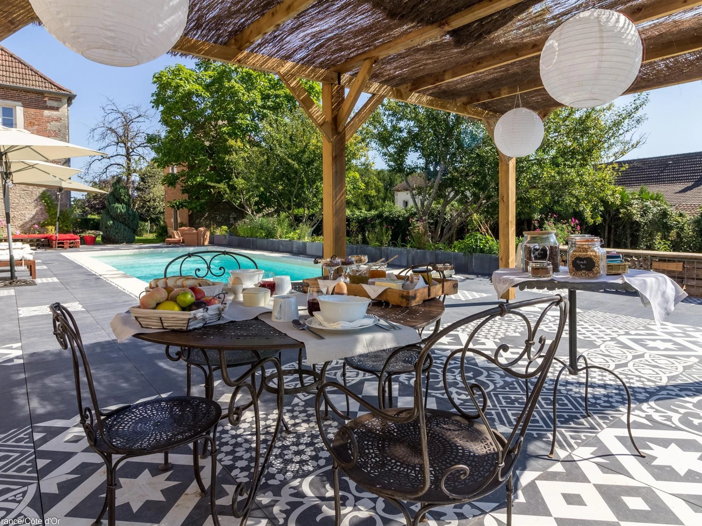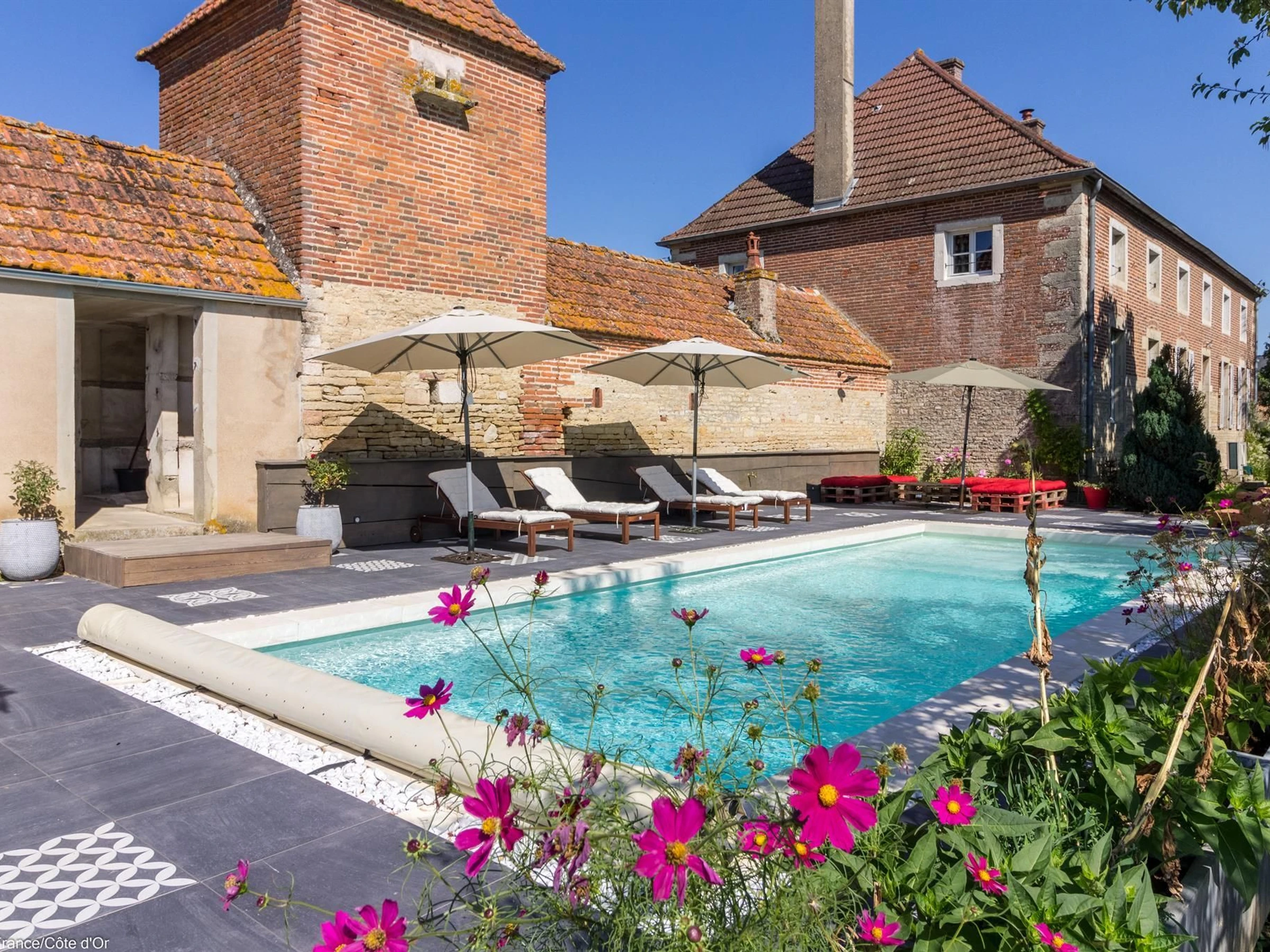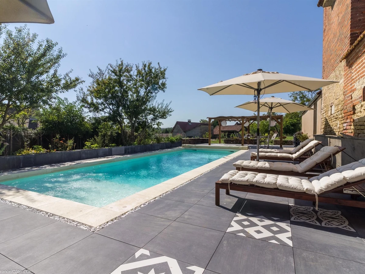 A l'arrière du gîte, grande piscine (10,5 x 4) chauffée du 15/06 au 15/09, avec terrasse et transats, à partager avec les propriétaires. Boulangère de métier, Maud vous propose un délicieux petit déjeuner.