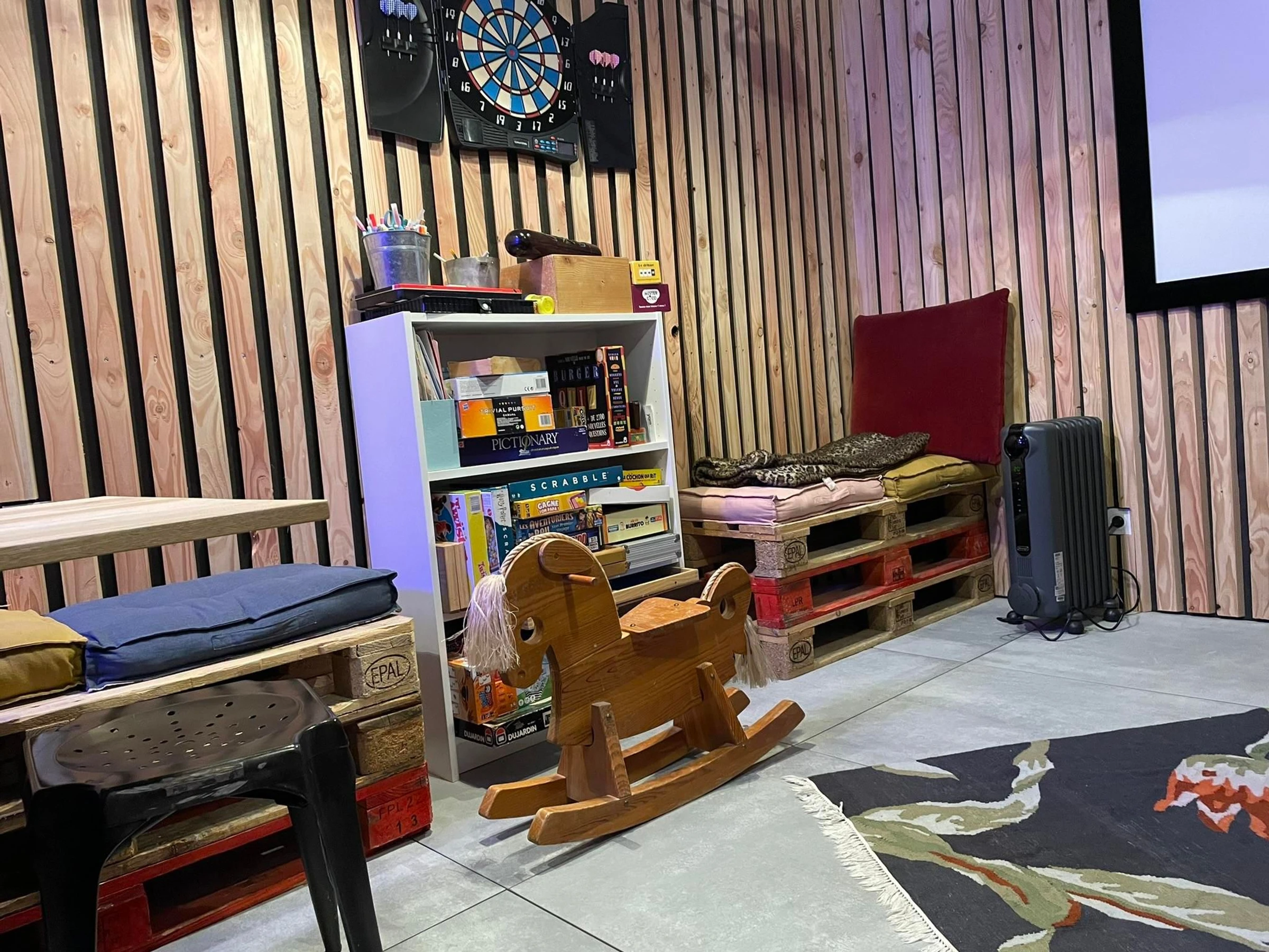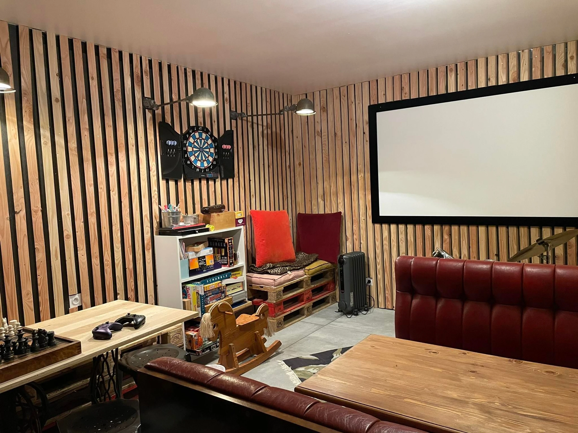 Une grande pièce de vie dotée d’un cuisine moderne équipée, d’un coin salon et d’un poêle est à votre disposition.