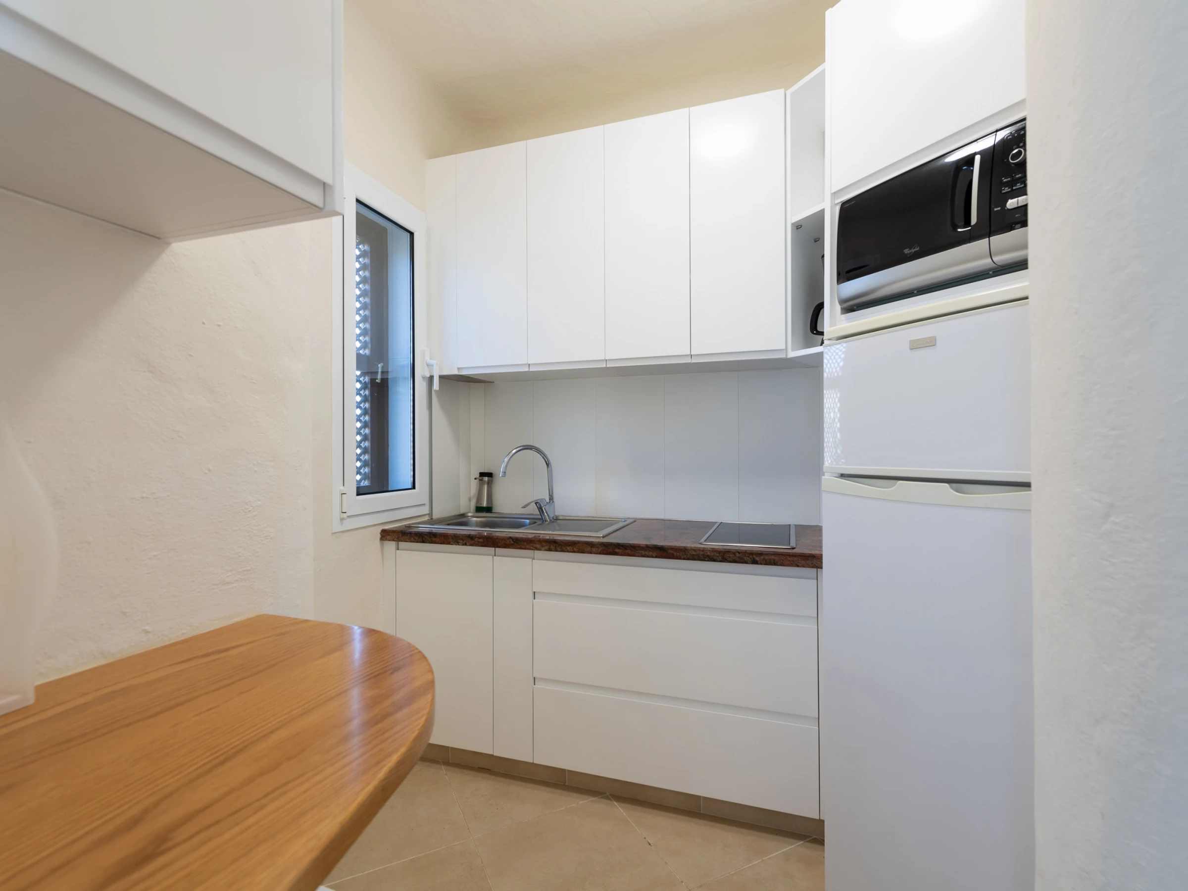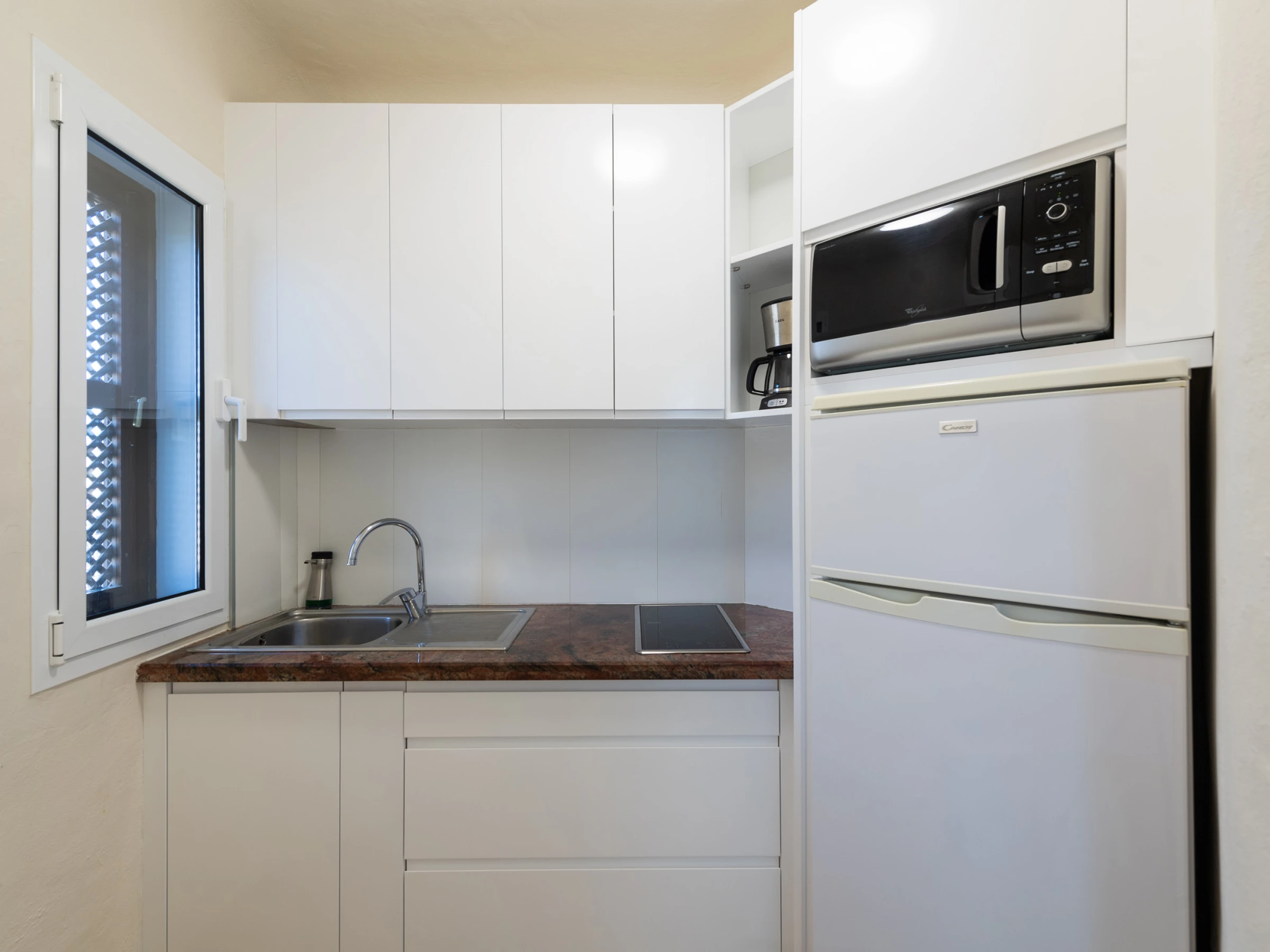La cuisine est entièrement équipée avec un réfrigérateur, un congélateur, un micro-ondes, une cafetière, un grille-pain et tous les ustensiles nécessaires pour que vous puissiez préparer vos propres repas. Elle dispose également d'un lave-linge.