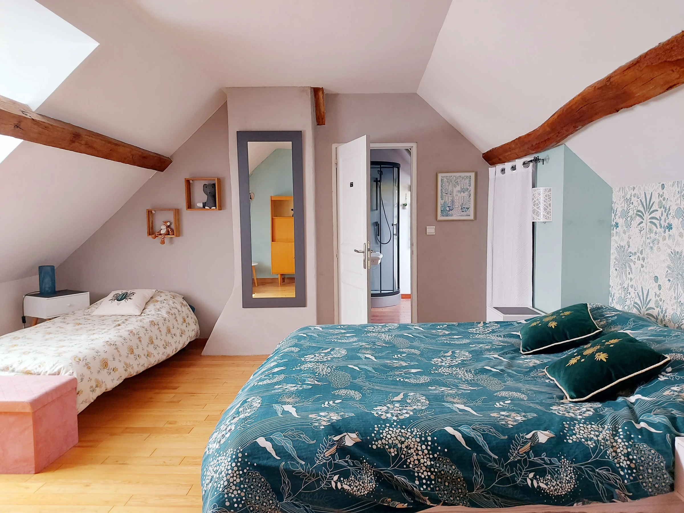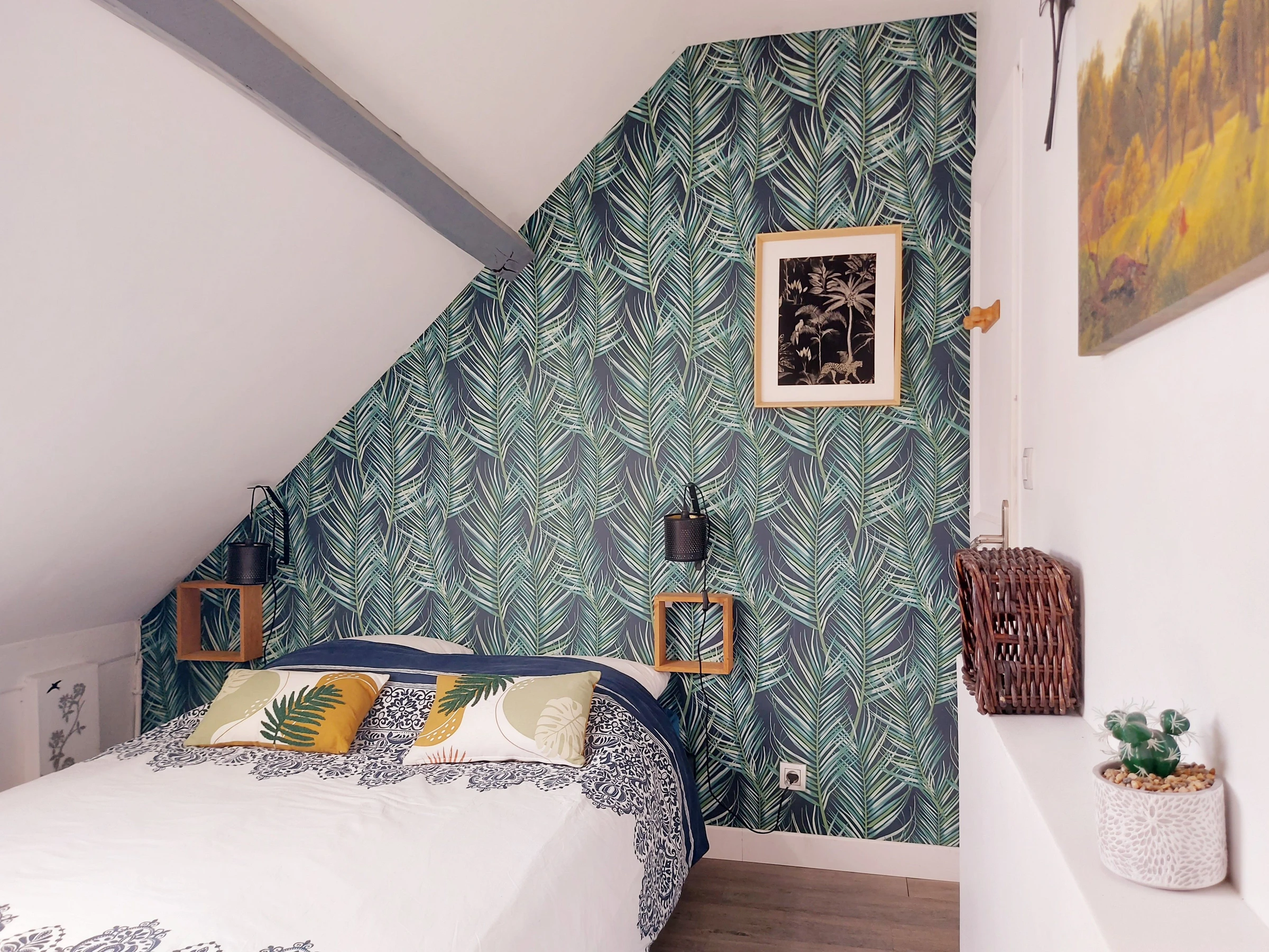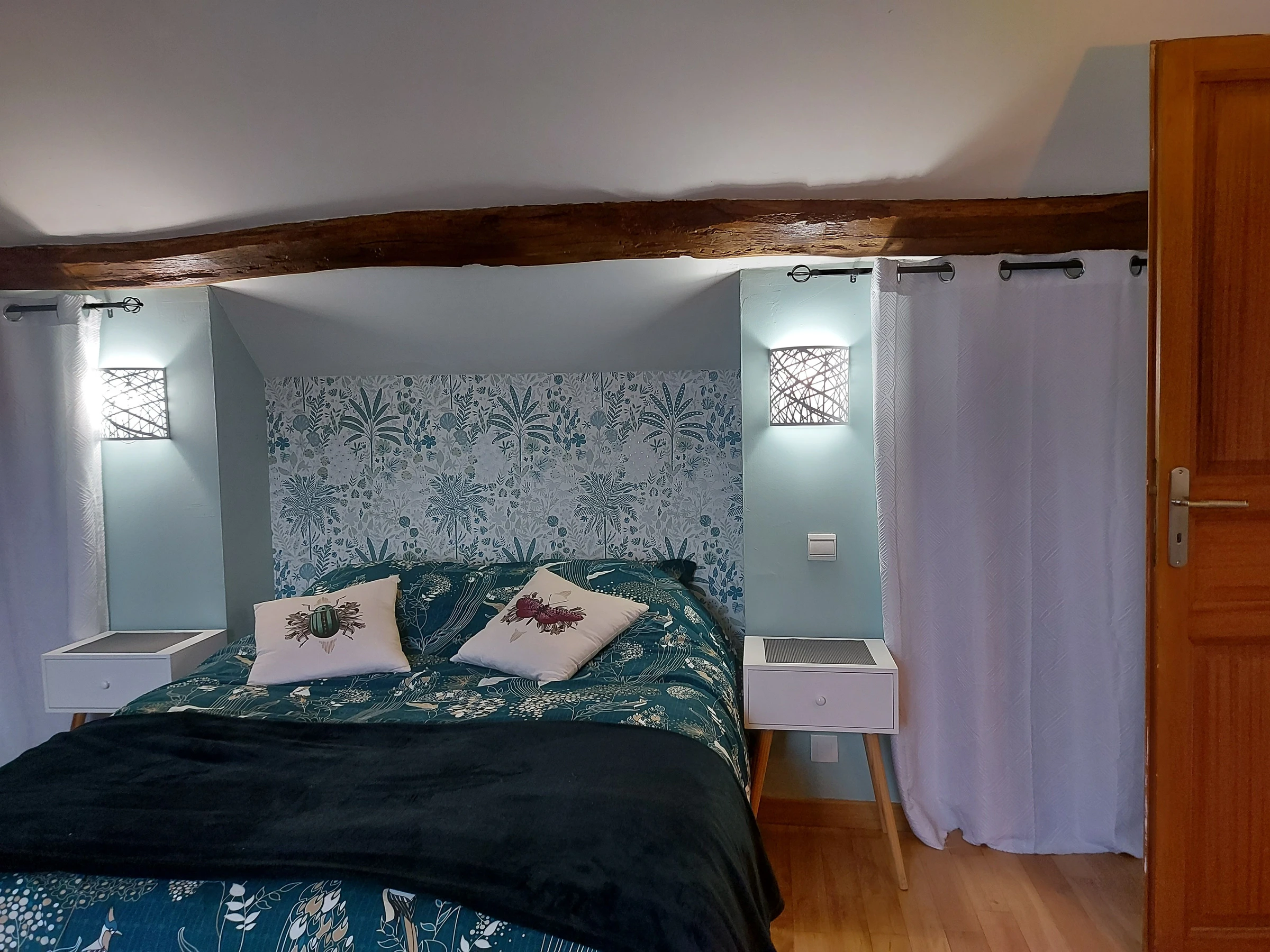 Enfin, au rez-de-chaussée, vous trouverez une chambre "Le jardin de Mat" composée d'un lit double (160) et 1 lit simple (90), ainsi qu'une salle de bains (avec baignoire et douche) et des WC.