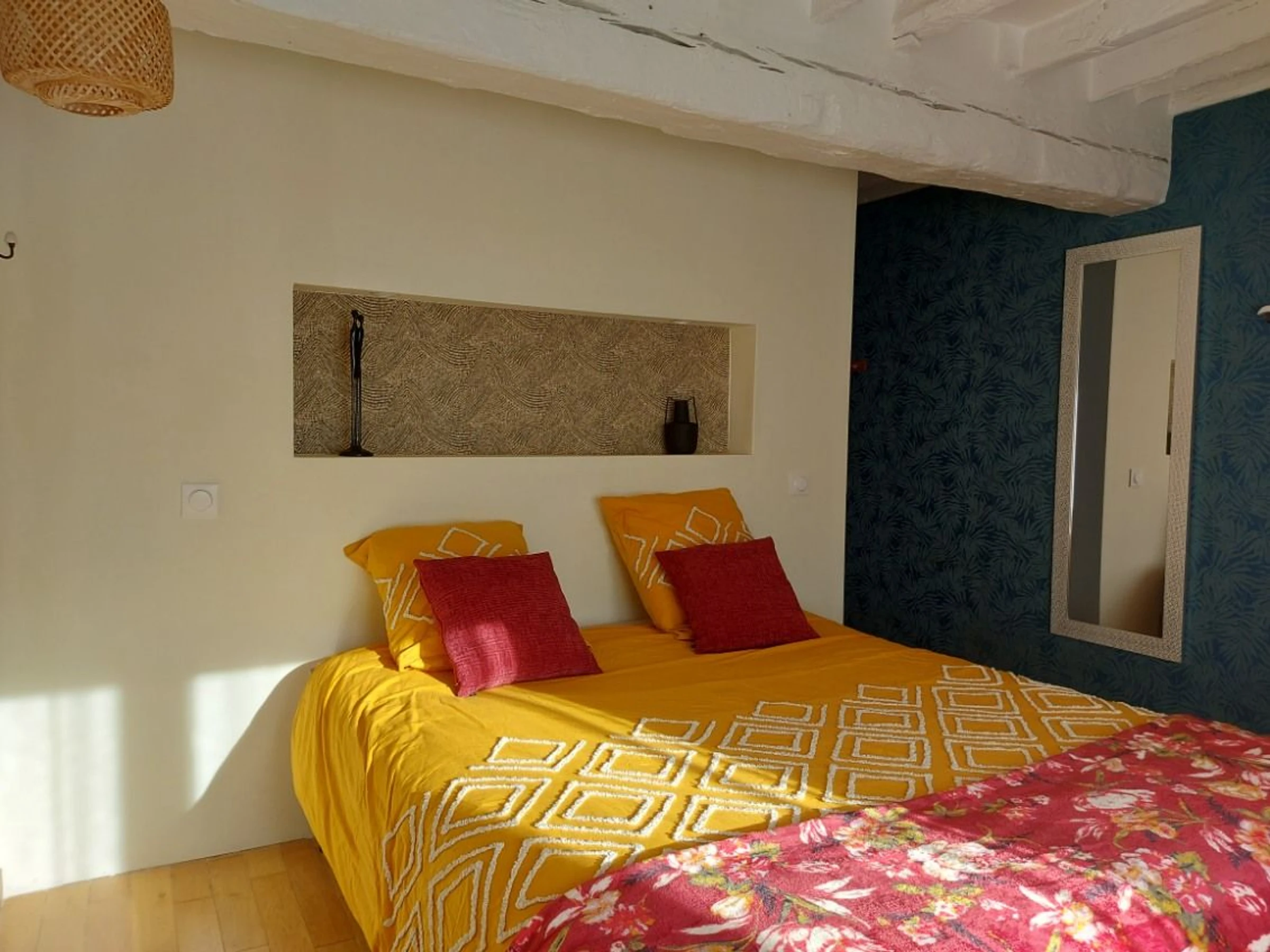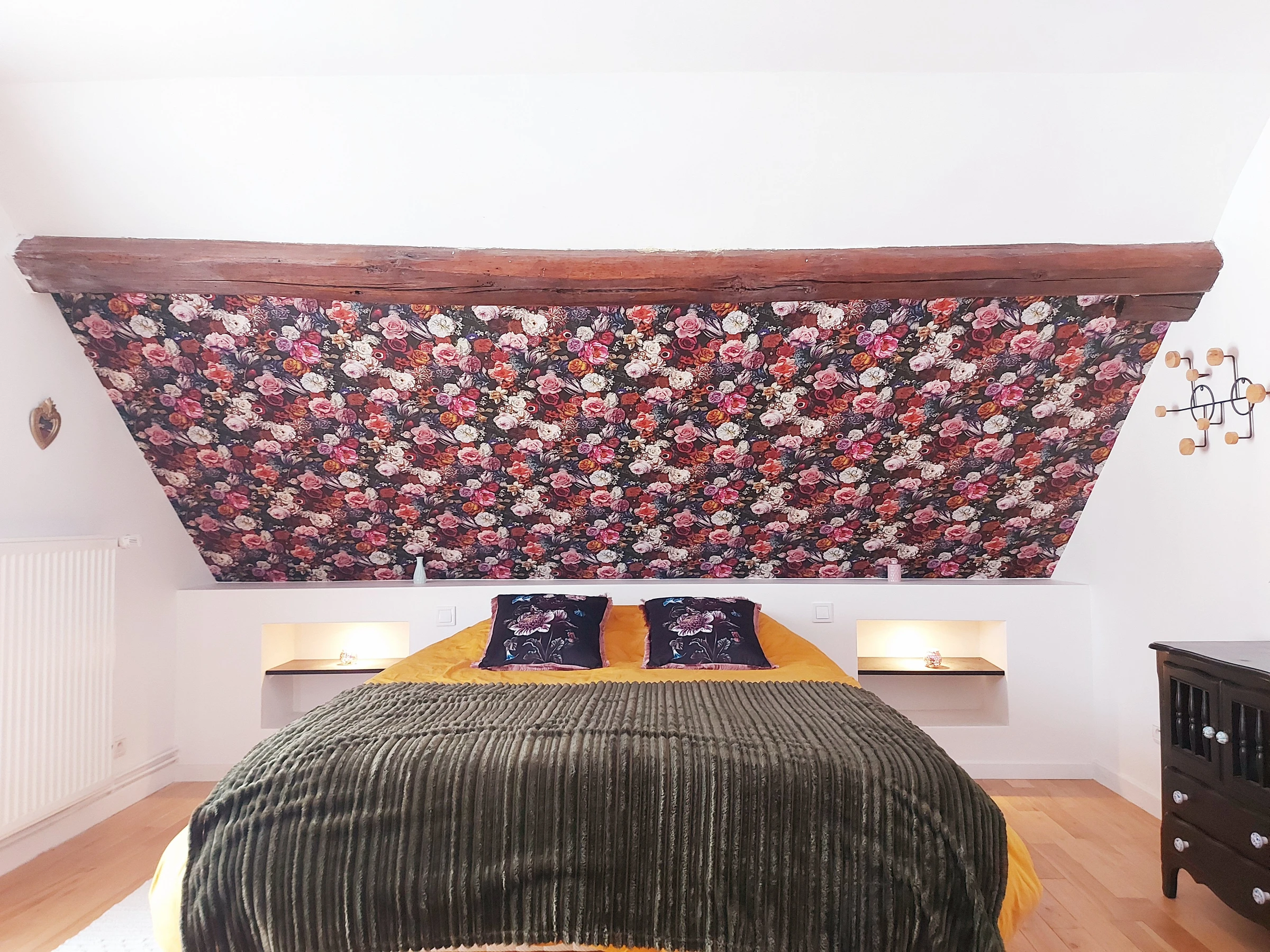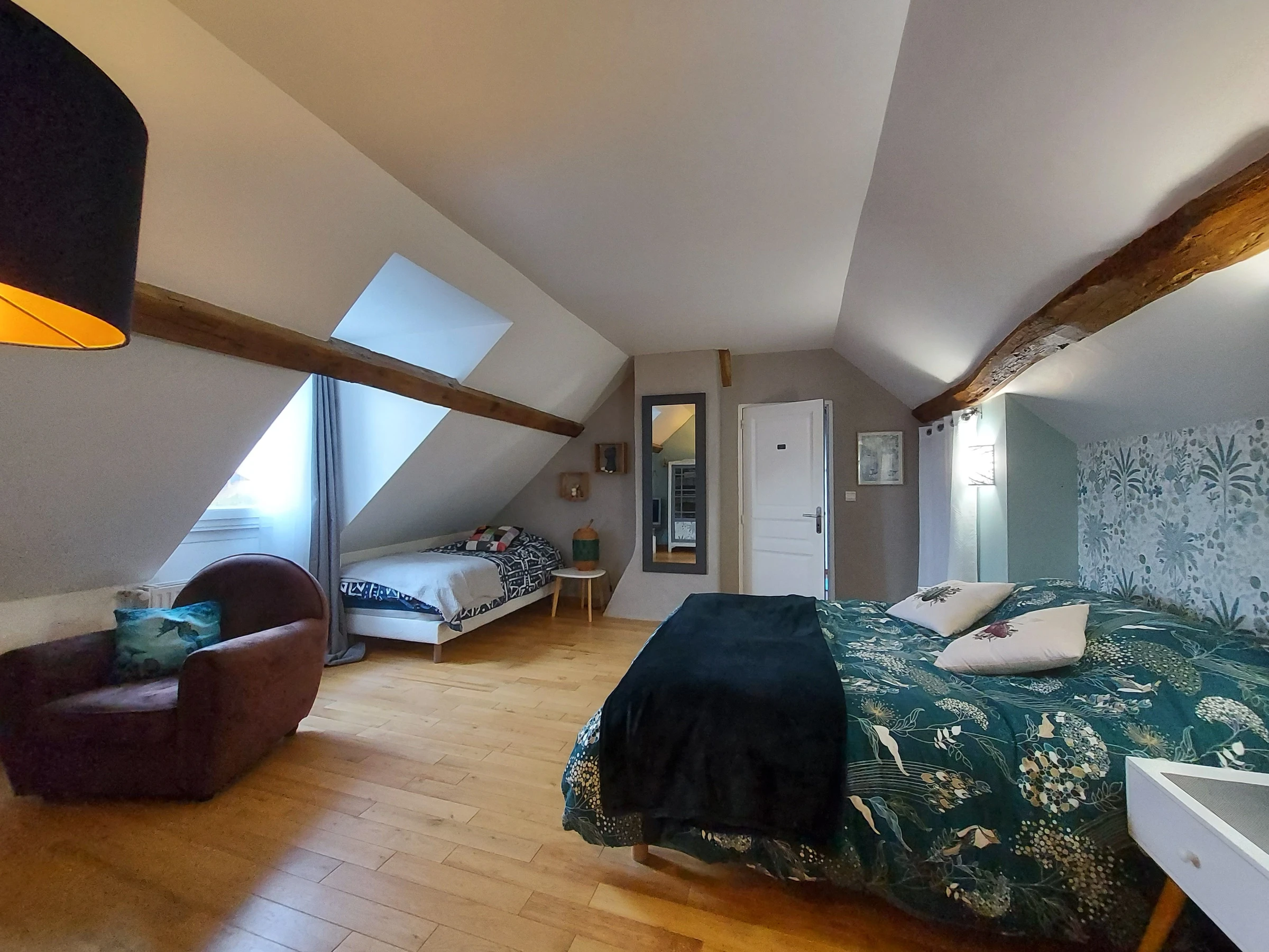 Enfin, au rez-de-chaussée, vous trouverez une chambre "Le jardin de Mat" composée d'un lit double (160) et 1 lit simple (90), ainsi qu'une salle de bains (avec baignoire et douche) et des WC.