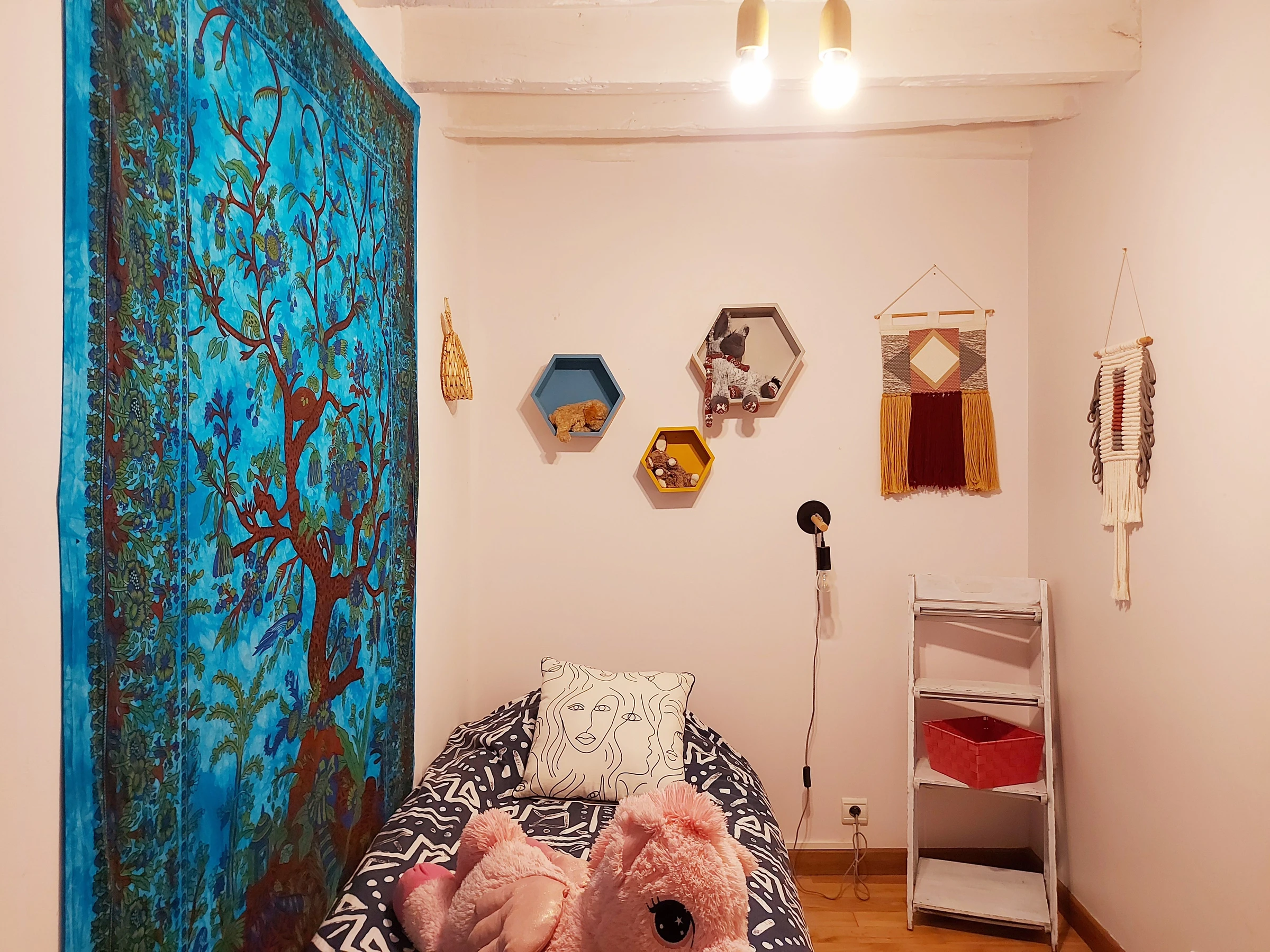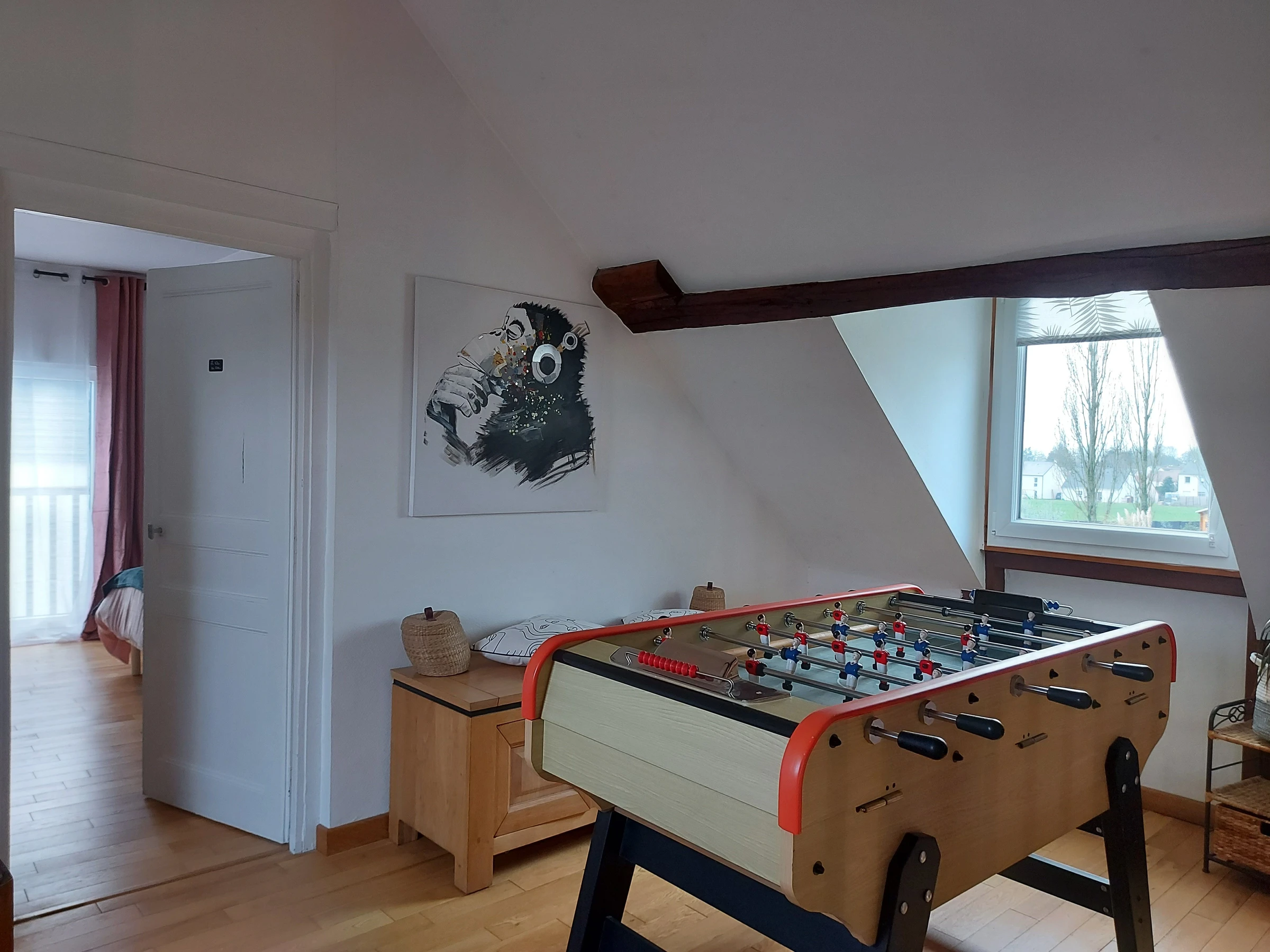 Sur le palier, un espace détente avec un babyfoot et divers jeux de société et activités manuelles pour les enfants, coin lecture.