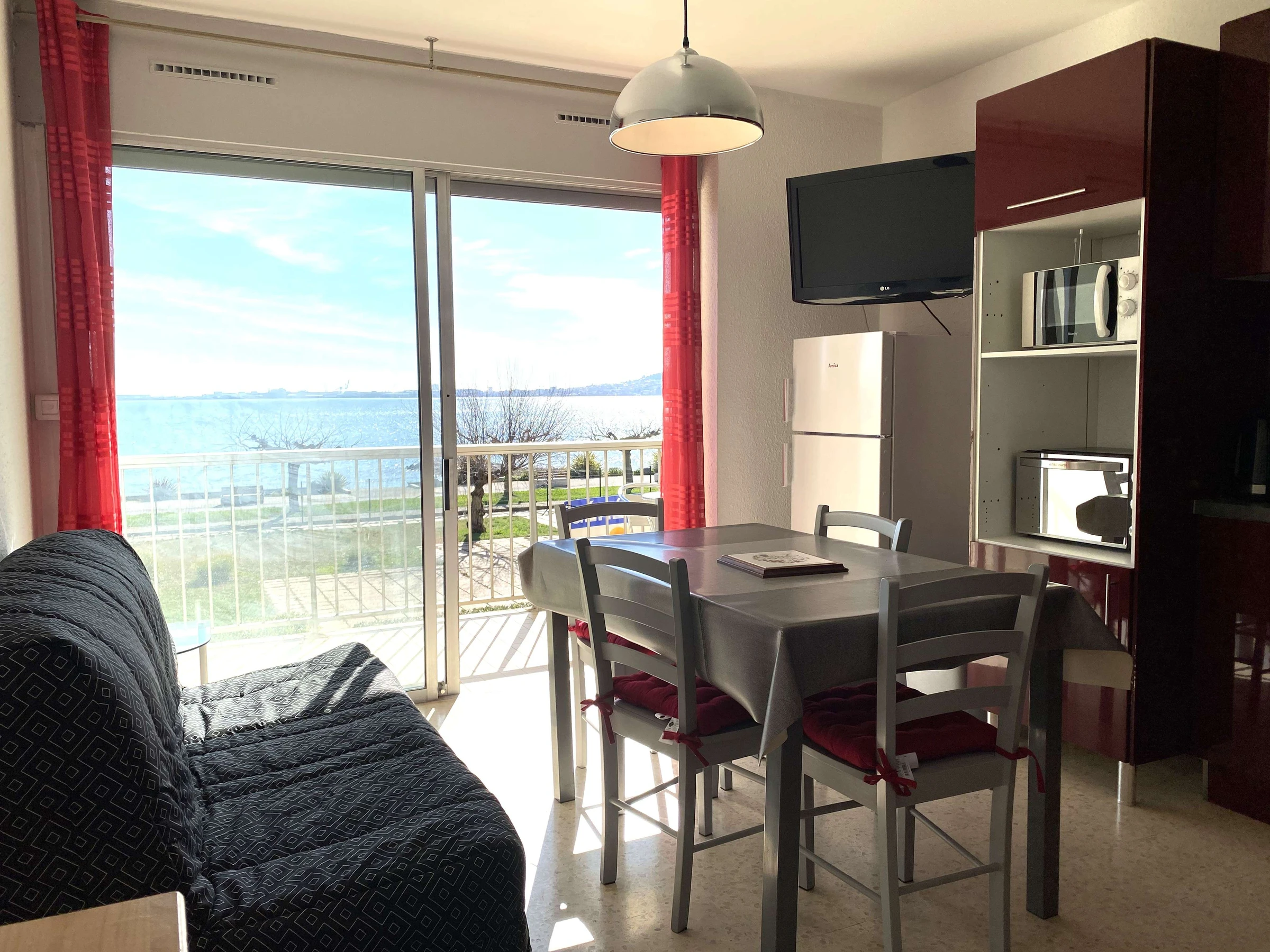 Aux pieds des Thermes, ce très beau T1 dispose d'une belle pièce à vivre donnant sur un grand balcon vue imprenable sur l'étang de Thau, d'un coin cuisine entièrement équipé, d'un coin nuit avec 1 lit 140x190, d'une salle d'eau avec cabine de douche et wc.
