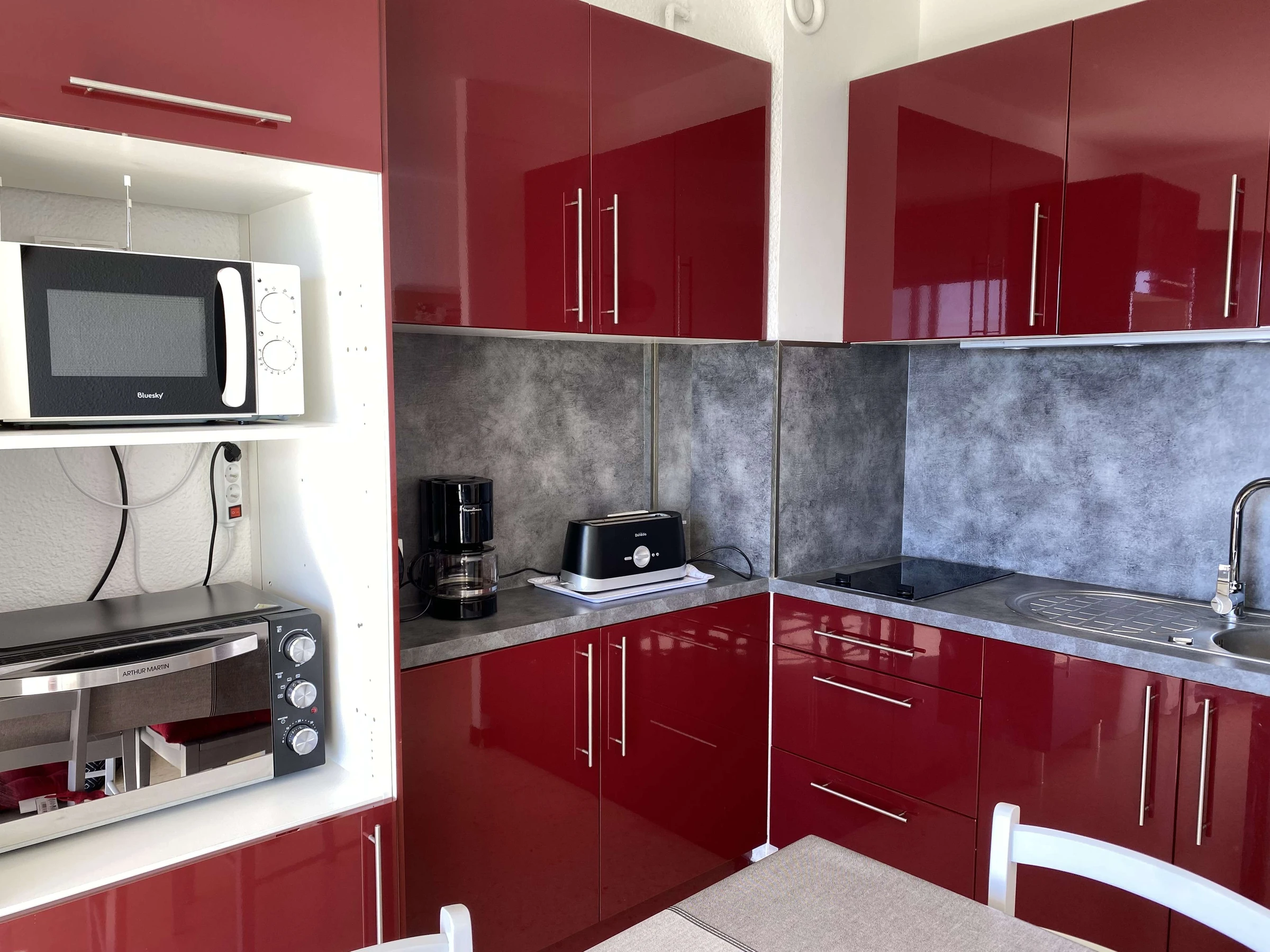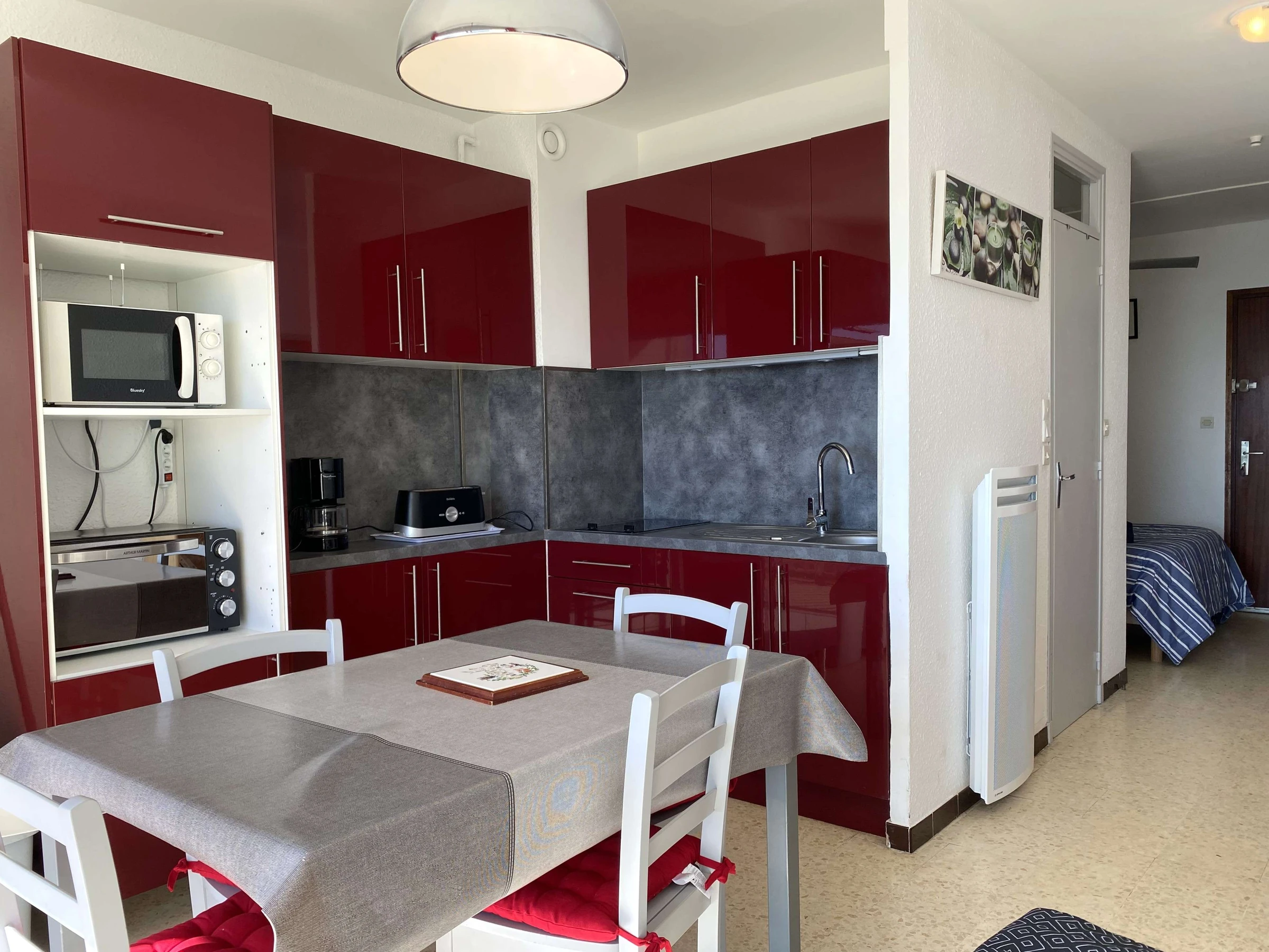 Equipement: Réfrigérateur/congélateur, 2 plaques électriques, micro-ondes, four.
