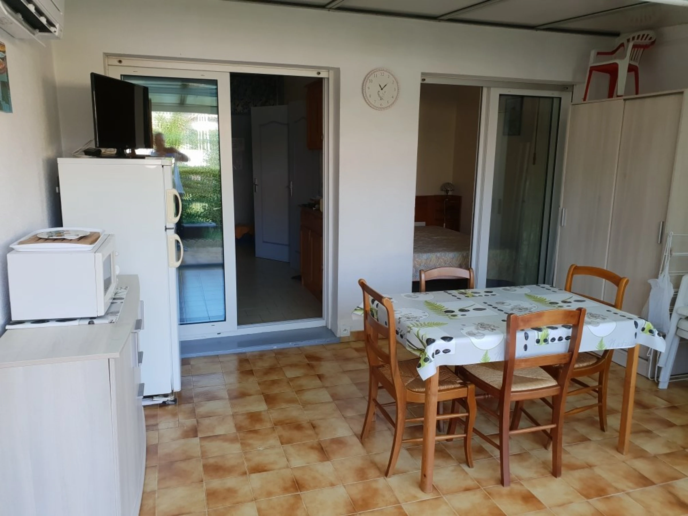 Agréable F2 d'environ 20m²dans une résidence sécurisée avec parking en Rez de chaussée comprenant une chambre indépendante, un séjour cuisine équipéé donnant sur une loggia de 10m² + petit jardin, salle d'eau, WC. LITERIE : 1 lit en 140 + 1 canapé convertible en 140. PARKING N°2. Code portillon : 7590. Appartement climatisé.WIFI