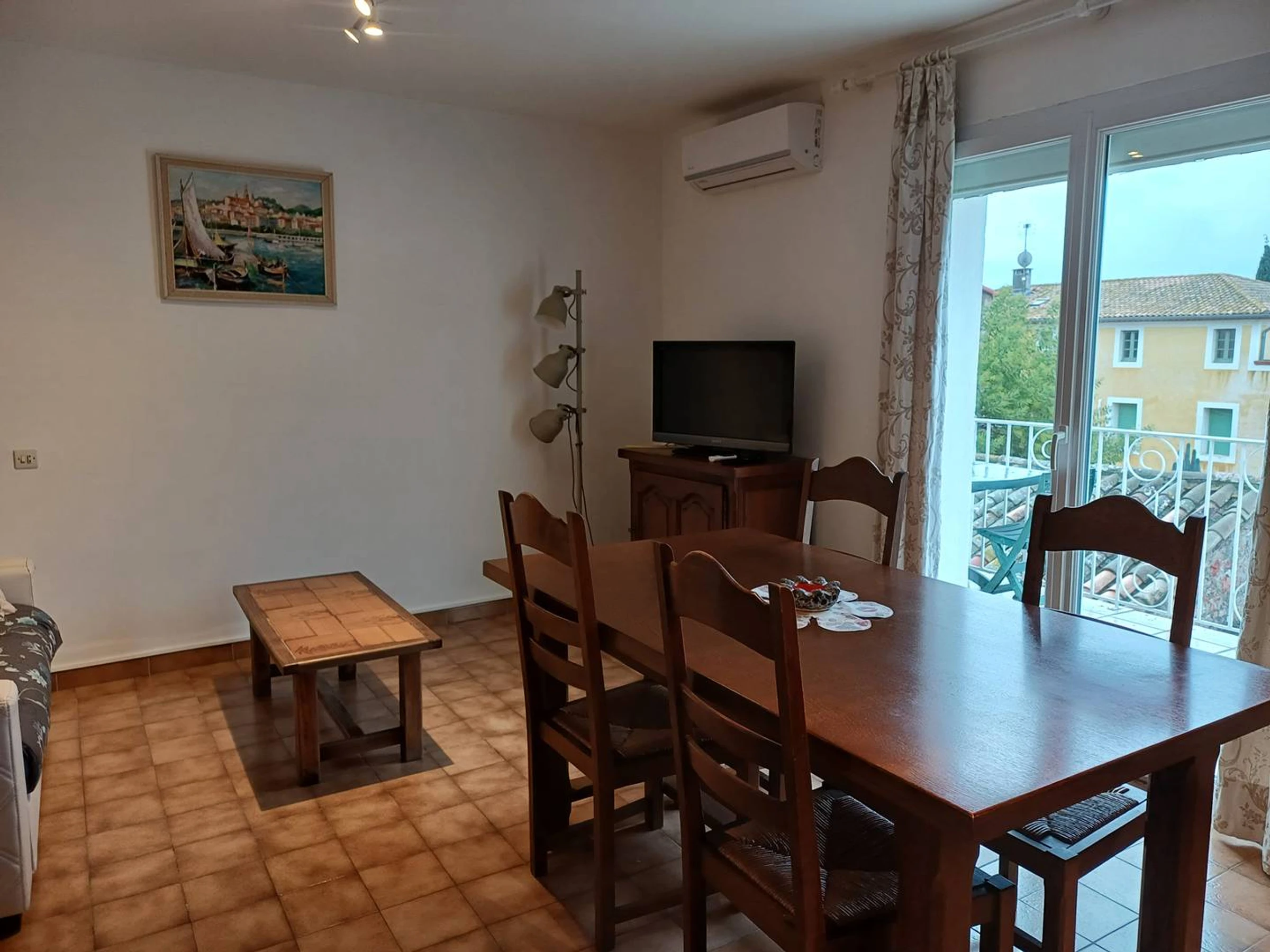 - A l'étage: d'un séjour/salle à manger, d'une cuisine équipée, d'une chambre indépendante avec lit double (140) et placard de rangement, d'une salle d'eau avec WC et d'un balcon donnant sur la cour arrière. Équipements : réfrigérateur/congélateur, gazinière avec four intégré, micro-ondes, cafetière, vaisselles et ustensiles adaptés, télévision, lave-linge, climatisation. Couchage 3 personnes. Consommation d'EDF en sus sur relevé de compteur (au tarif en vigueur au jour de l'arrivée). Logement non-fumeur et non accessible PMR. Animaux non admis. Exposition : Sud.